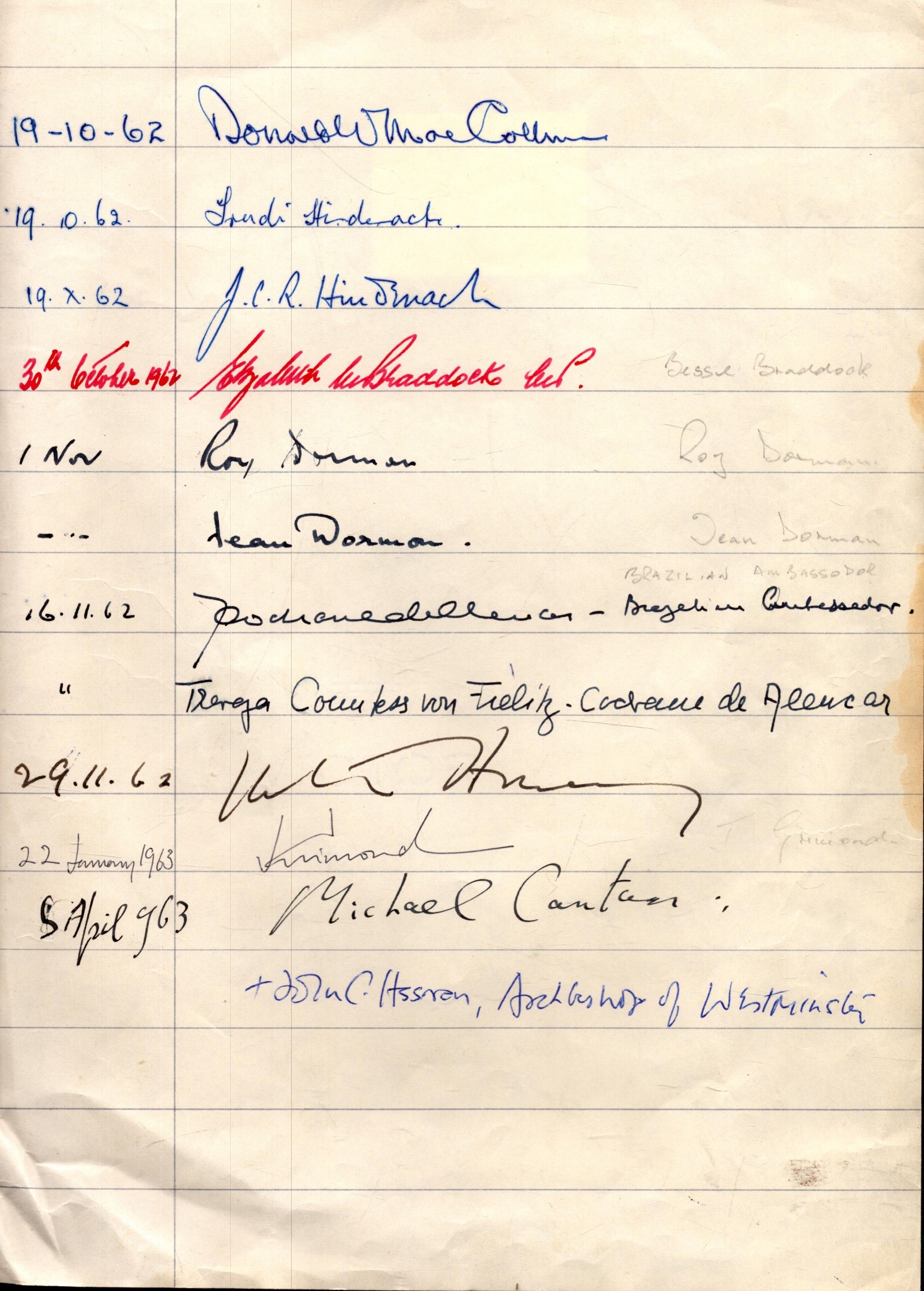 Guest book signed page. Includes signatures of Donald Maccormick, Jean Dosman and more.