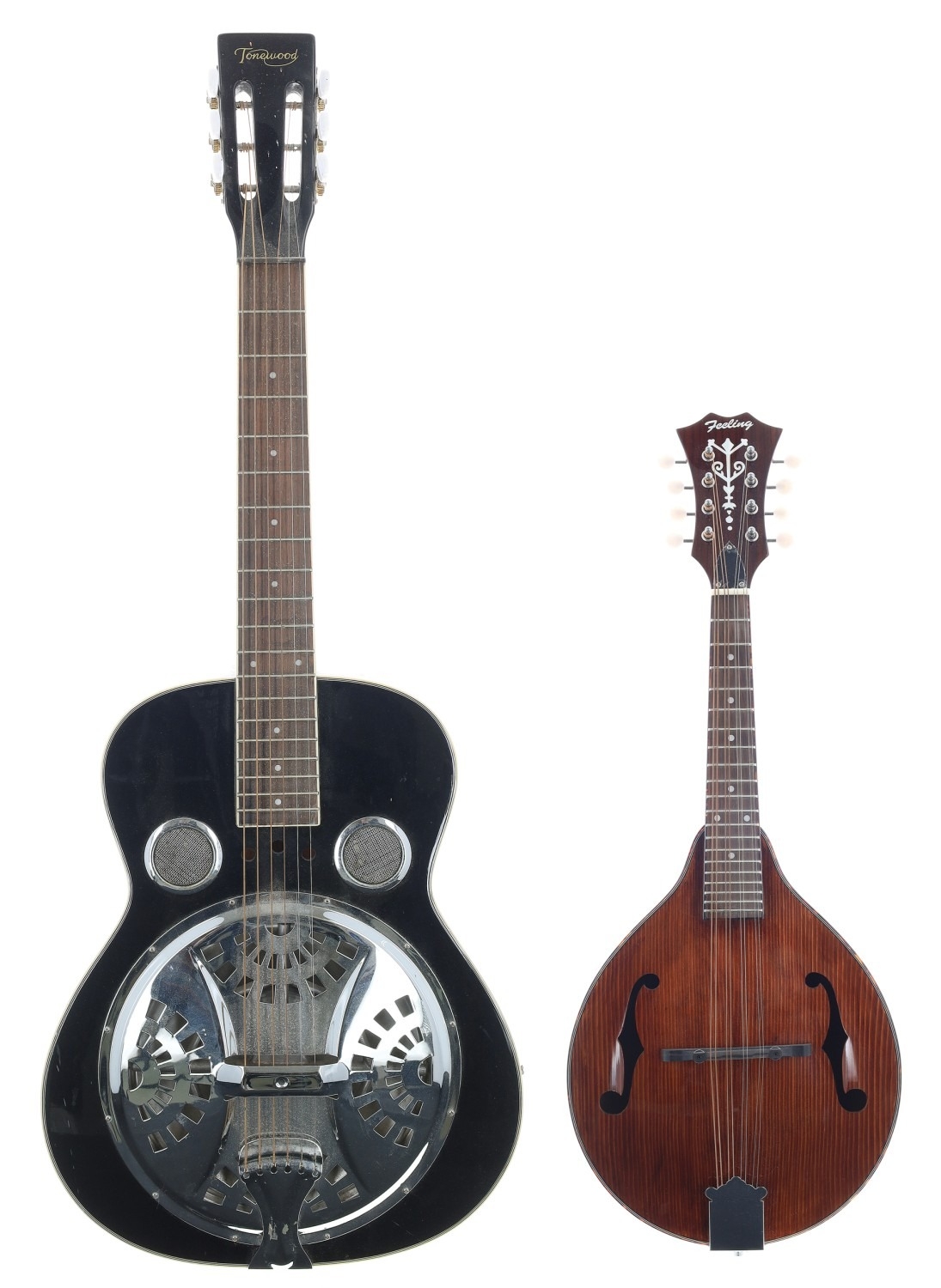 Tonewood Square neck resonator guitar, made in China, ebony finish with marks and dings throughout, together with a Feeling A-Style Mandolin in natural finish (2)