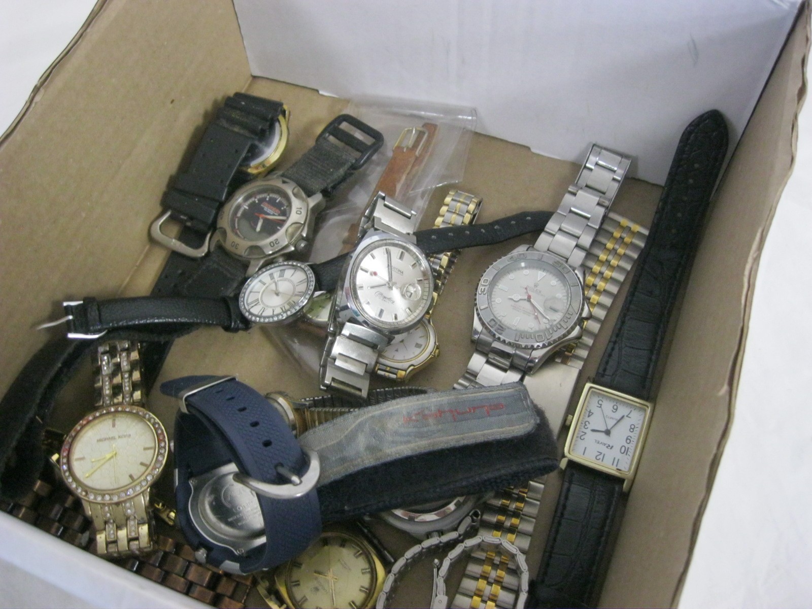 An assortment of watches including a nice vintage Mortima 17 jewel automatic, a fashion watch named for a famous watch company and many others, some a/f.
