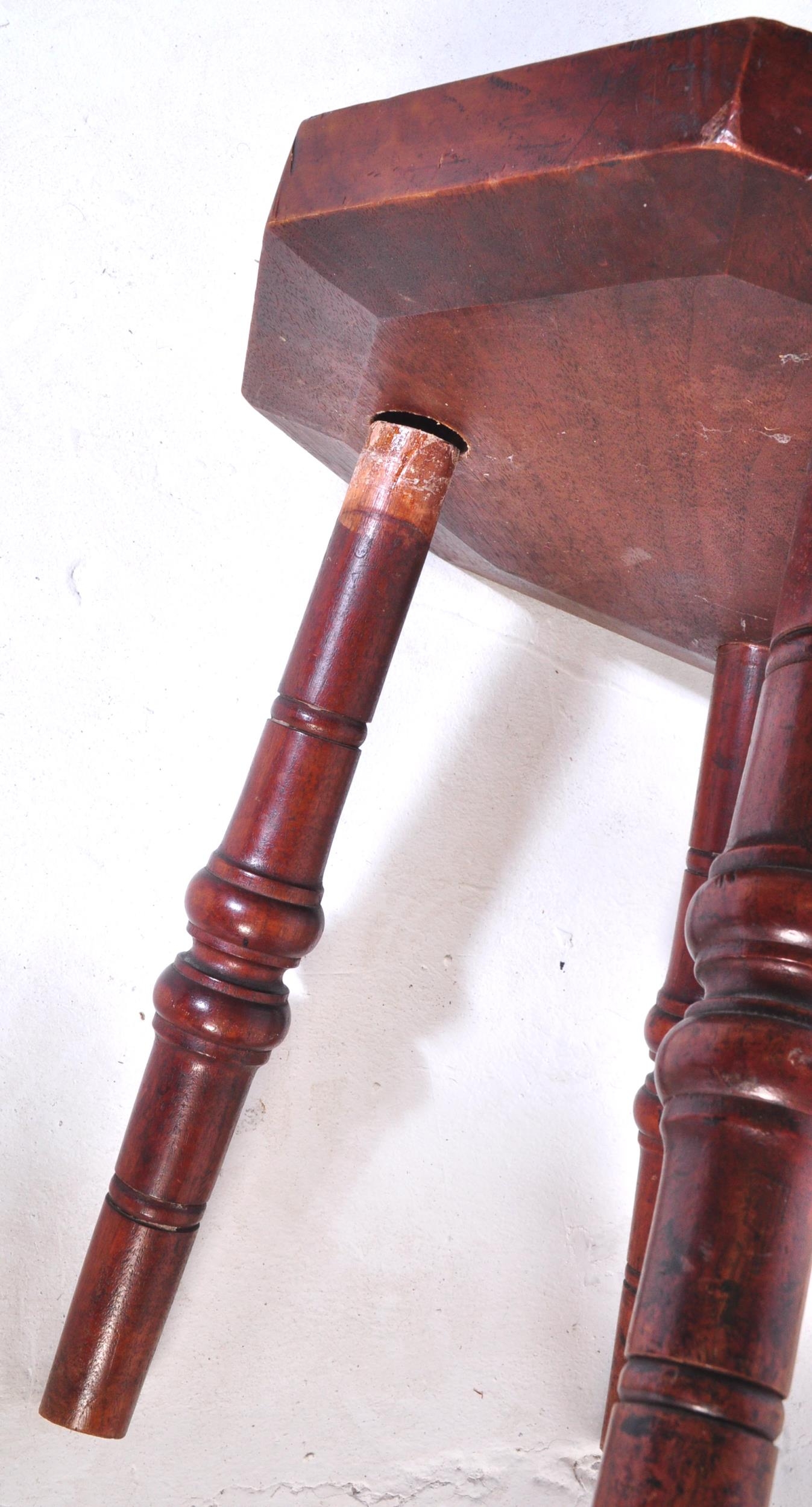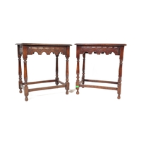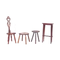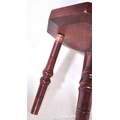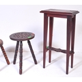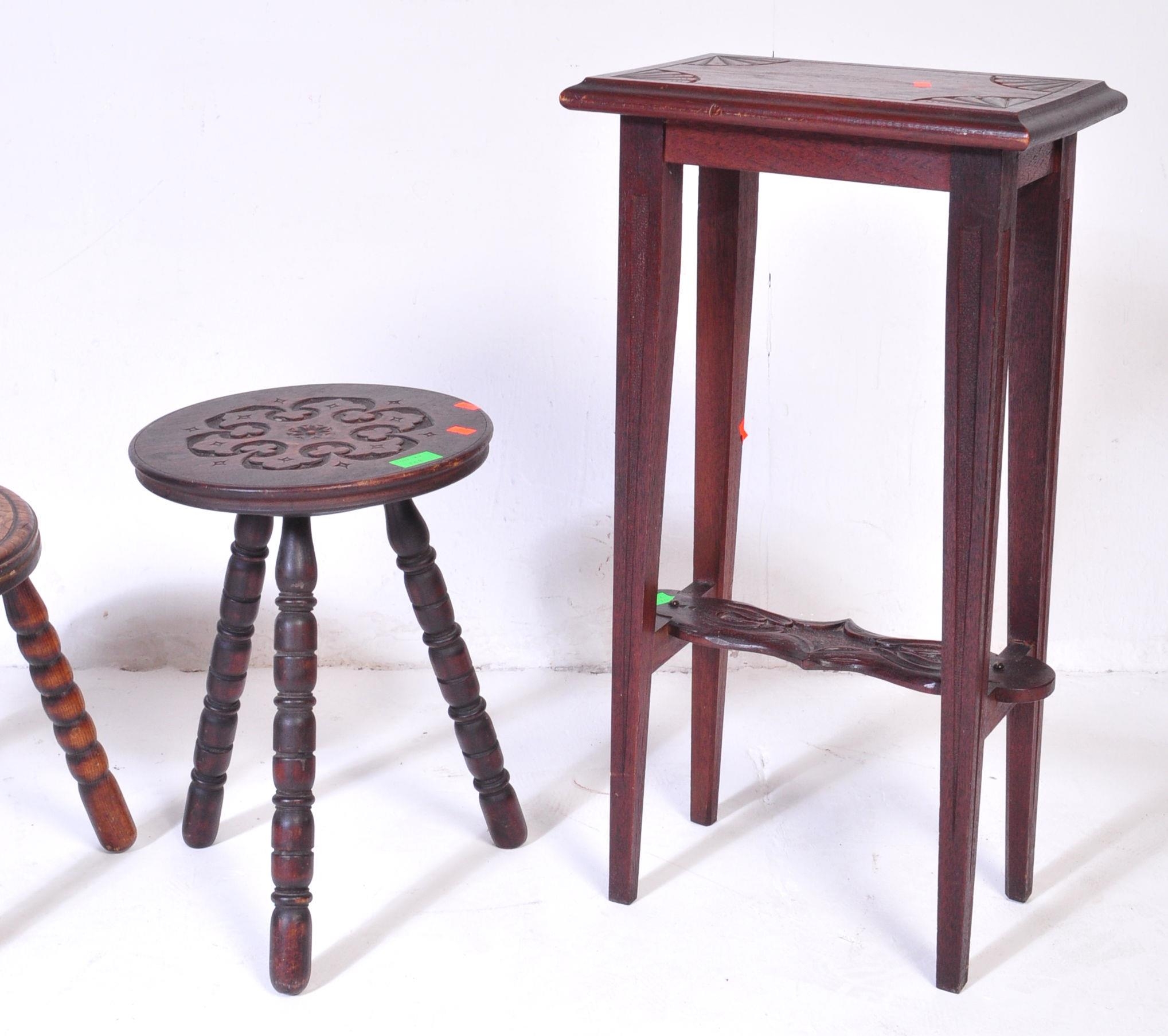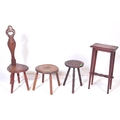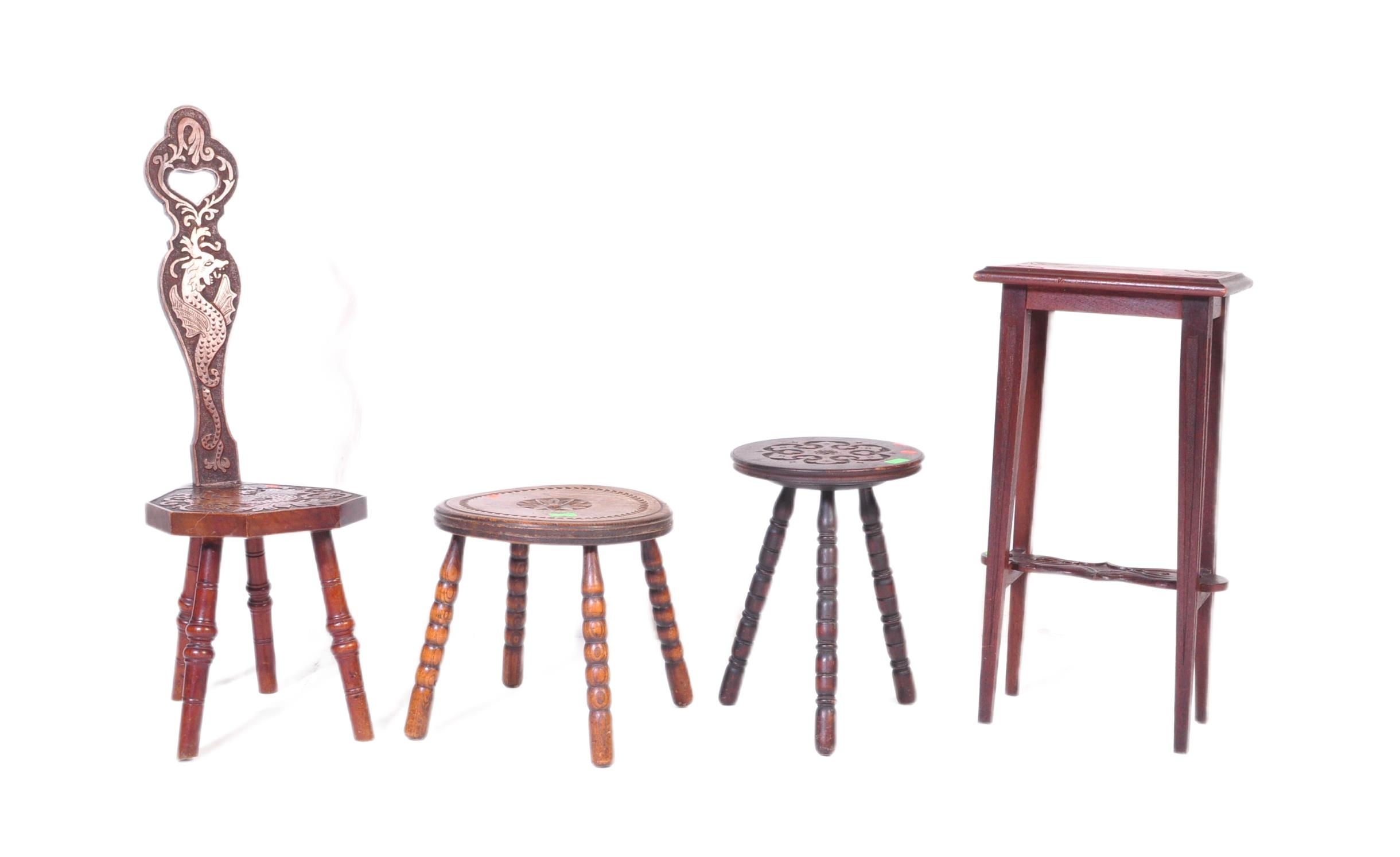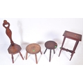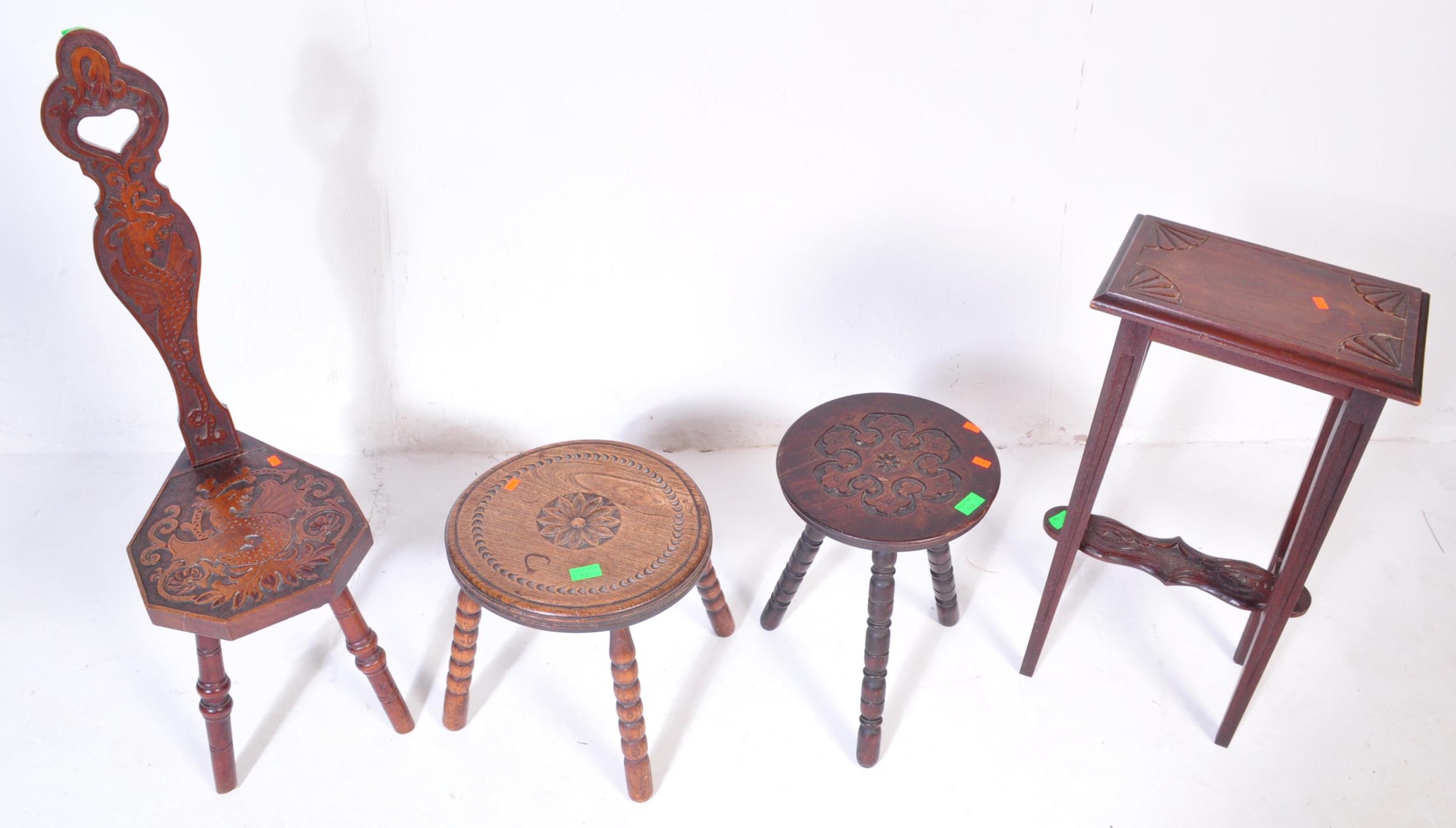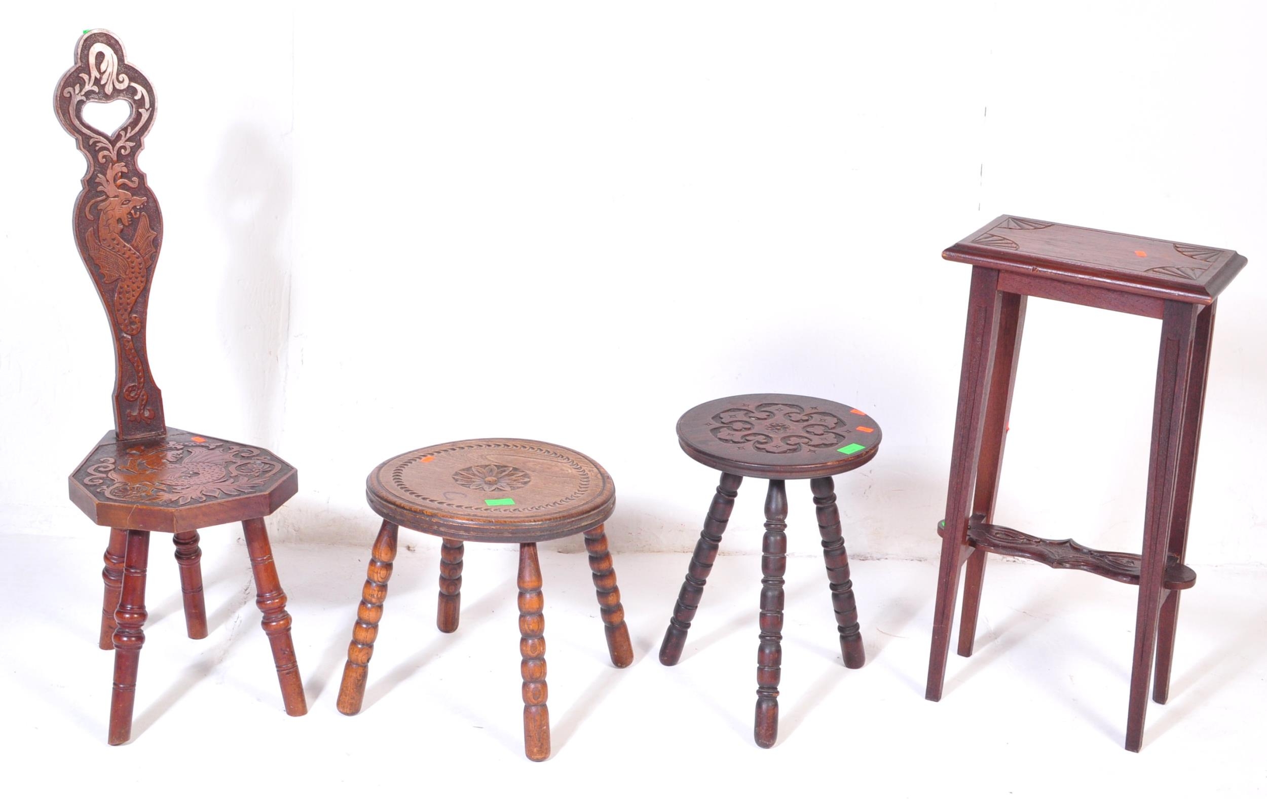 An assortment of early 20th century and later oak furniture pieces to include a carved Welsh spinning chair with Gwibers to back rest and seat, two stools each with carved tops and bobbin turned supports and a jardinière plant stand / side table with chamfered top and Sheraton type supports.