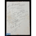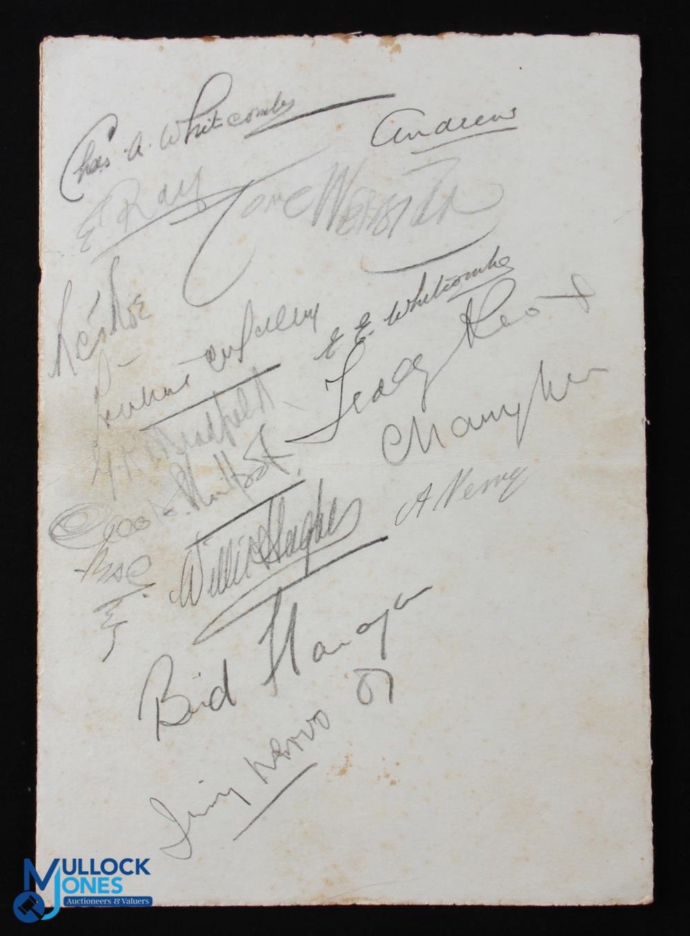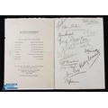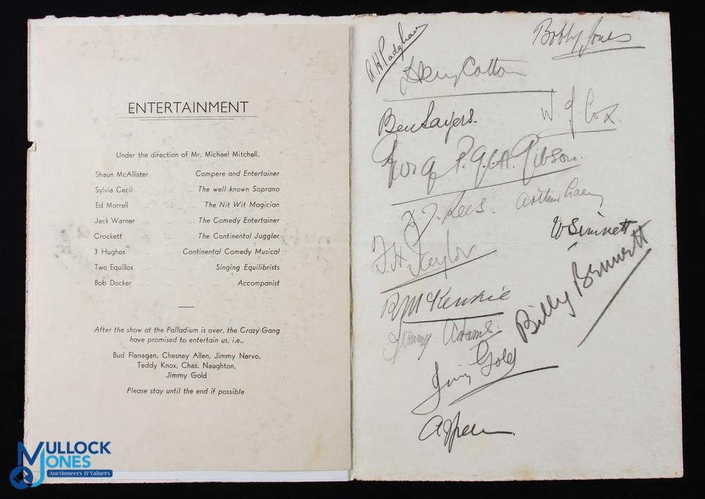 Rare and Remarkable 1939 The Professional Golfers Association multiple signed Dinner Menu - held at Grosvenor House Hotel London 20th February 1939 and signed in pencil to the inside and back cover by Open Champions Bobby Jones, Henry Cotton, Alf Padgham, E Ray plus Ben Sayers, Dai Rees, W J Cox, Arthur Lacy, F H Taylor (Chair PGA) Charles Whitcombe (Guest Speaker), E E Whitcombe, Commander Roe, Tom Webster et al plus 5x members of The Crazy Gang who came and entertained the guests after their show ended at The London Palladium incl Bud Flanagan, Jimmy Nervo, Teddy Knox, Chas Naughton and Jimmy Gold - ha the usual pocket fold, some speckle foxing and finger marks. Note: From The Estate of The Late Tommy Horton MBE, Former Ryder Cup Player and PGA Captain