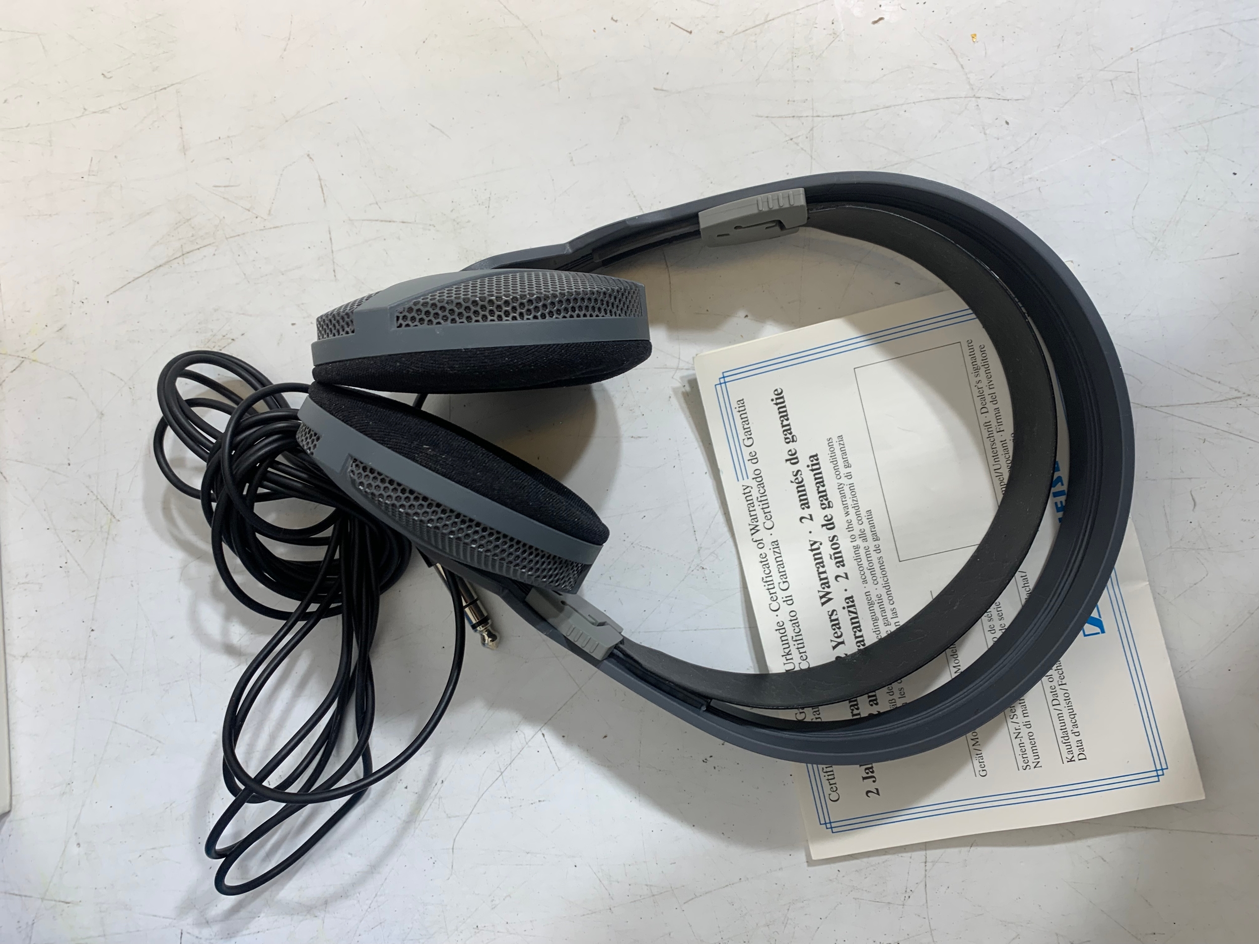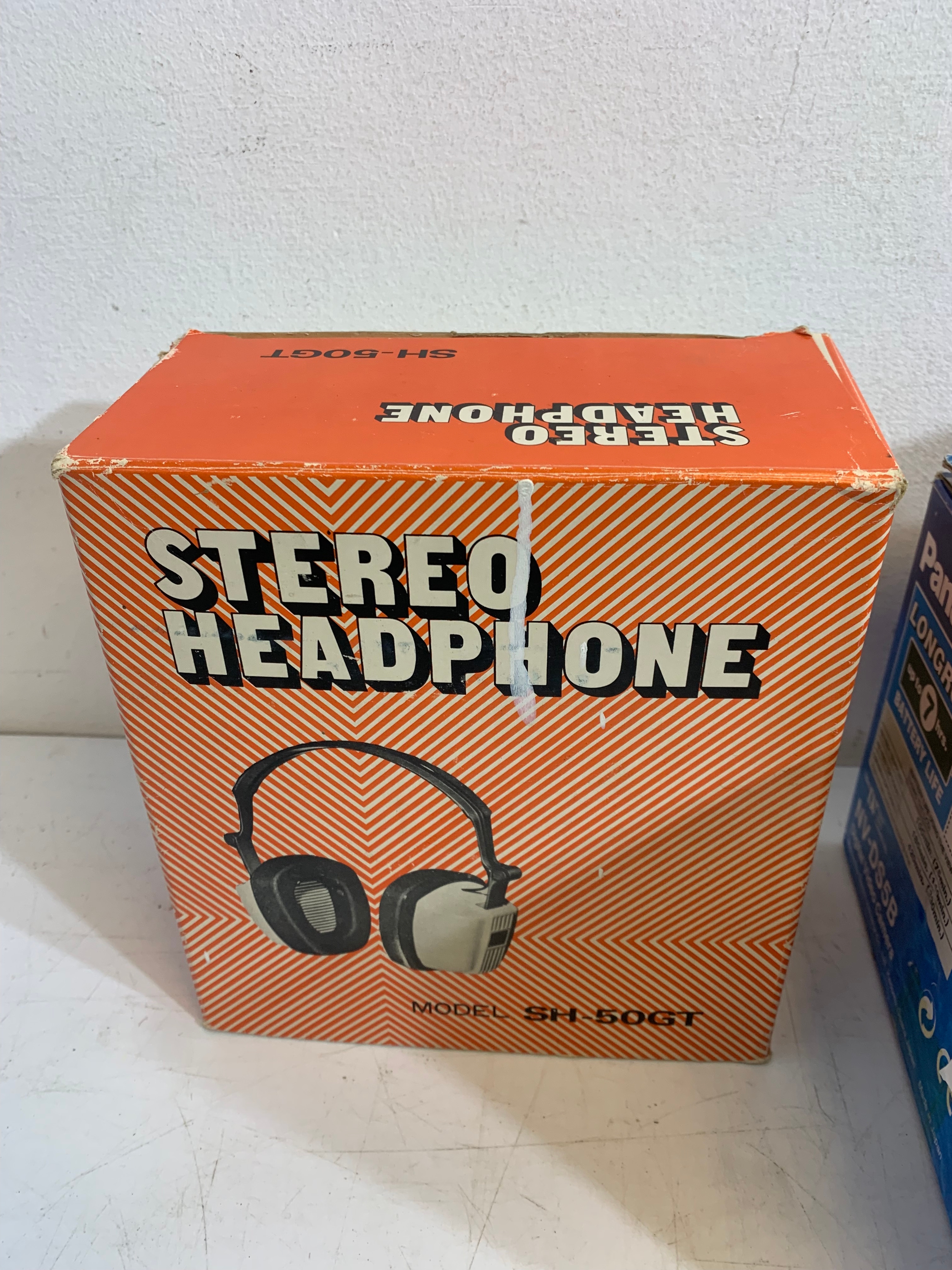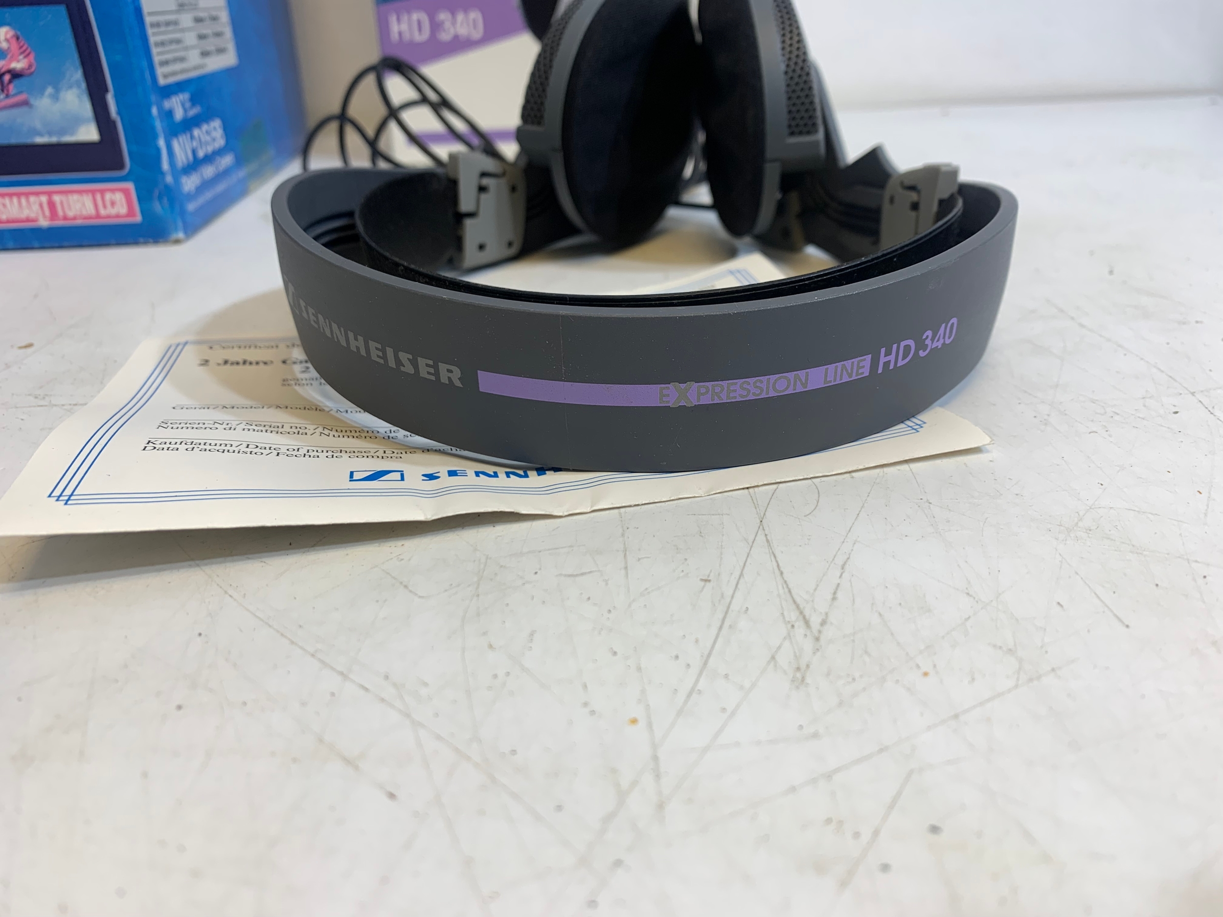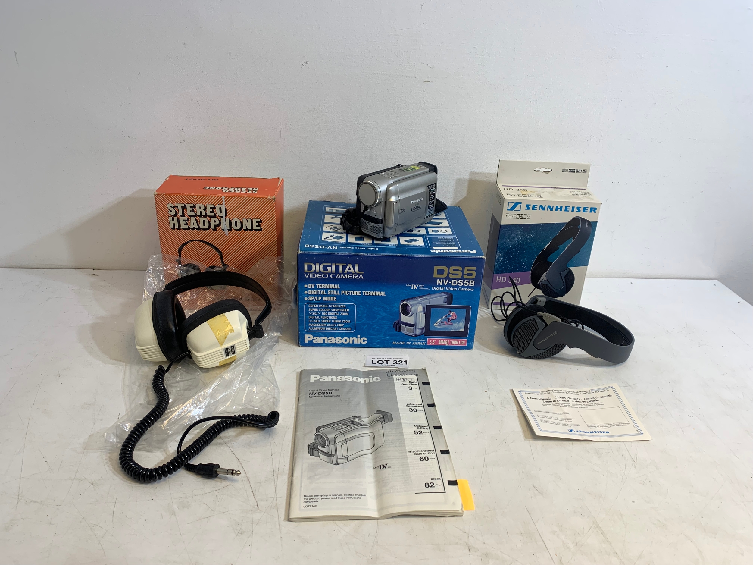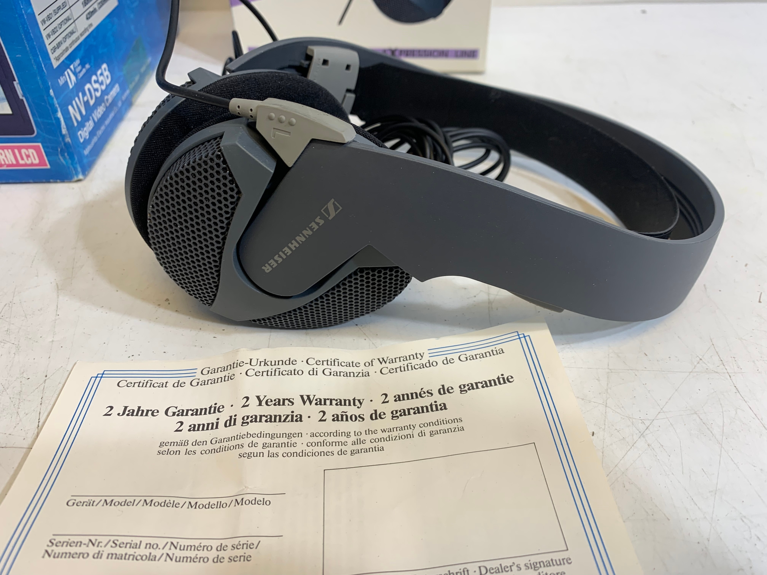 A Vintage Panasonic NV-DS5B mini DV camcorder, A pair of Vintage Belt SH- 80GT stereo Headphones with box, and Vintage Senheiser HD 340 head phones