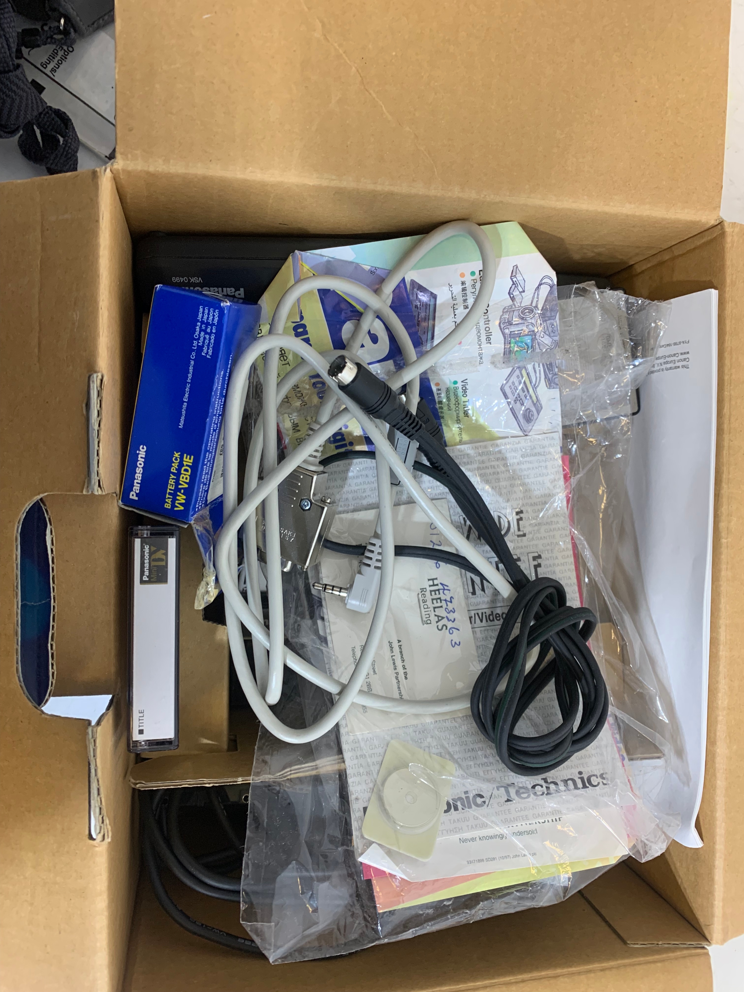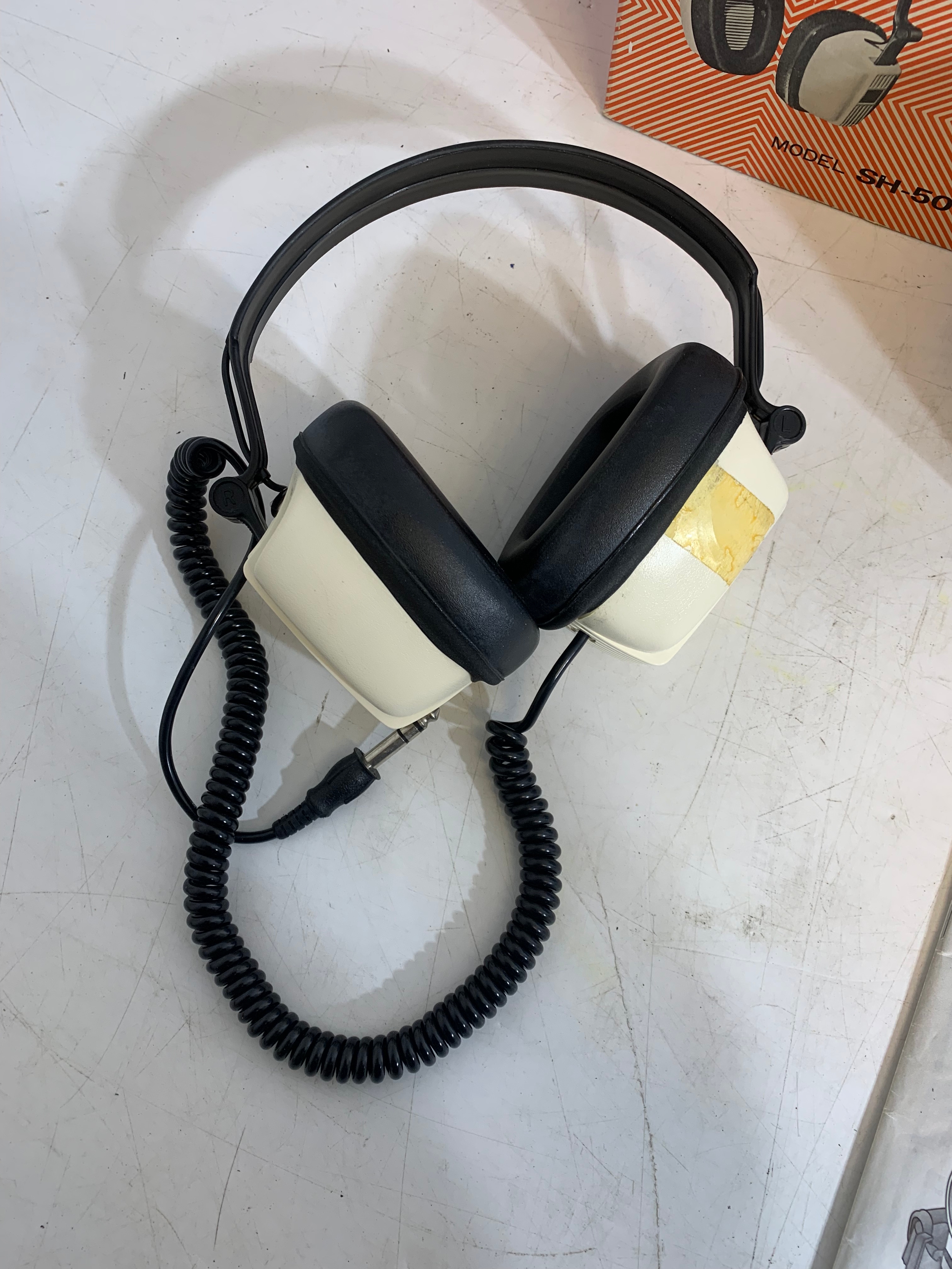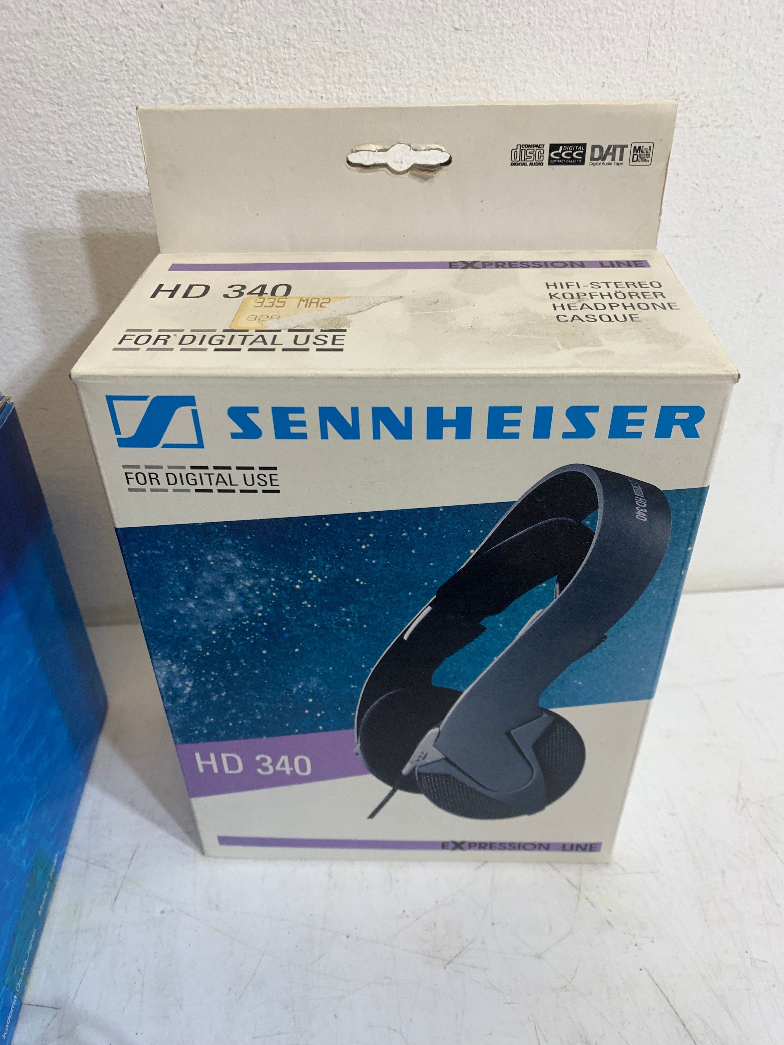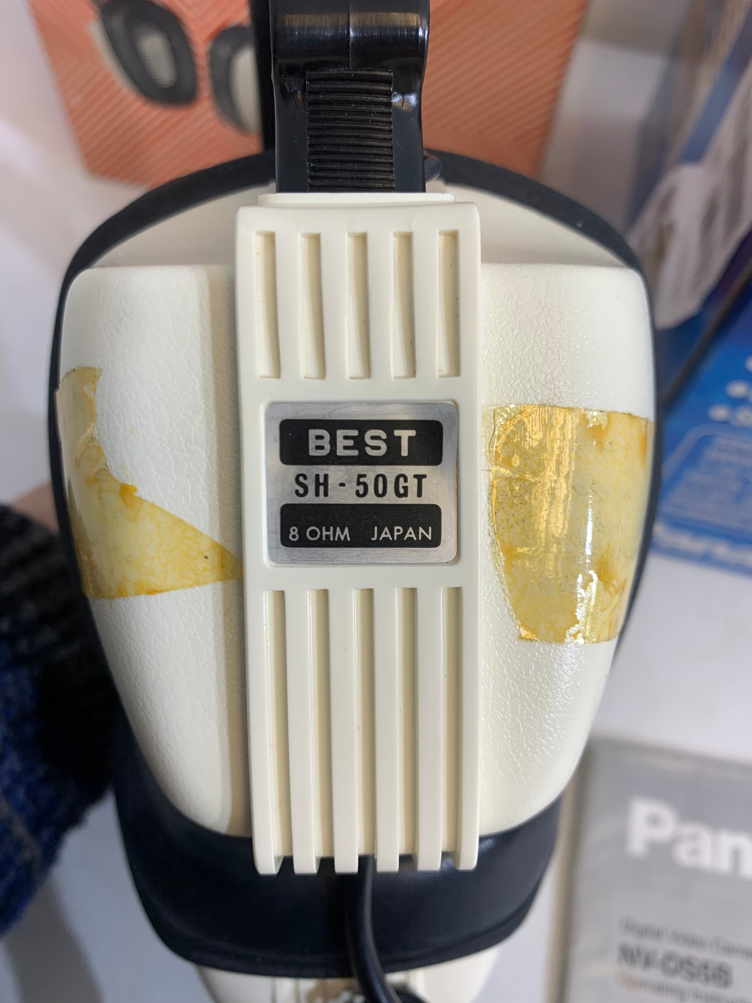 A Vintage Panasonic NV-DS5B mini DV camcorder, A pair of Vintage Belt SH- 80GT stereo Headphones with box, and Vintage Senheiser HD 340 head phones