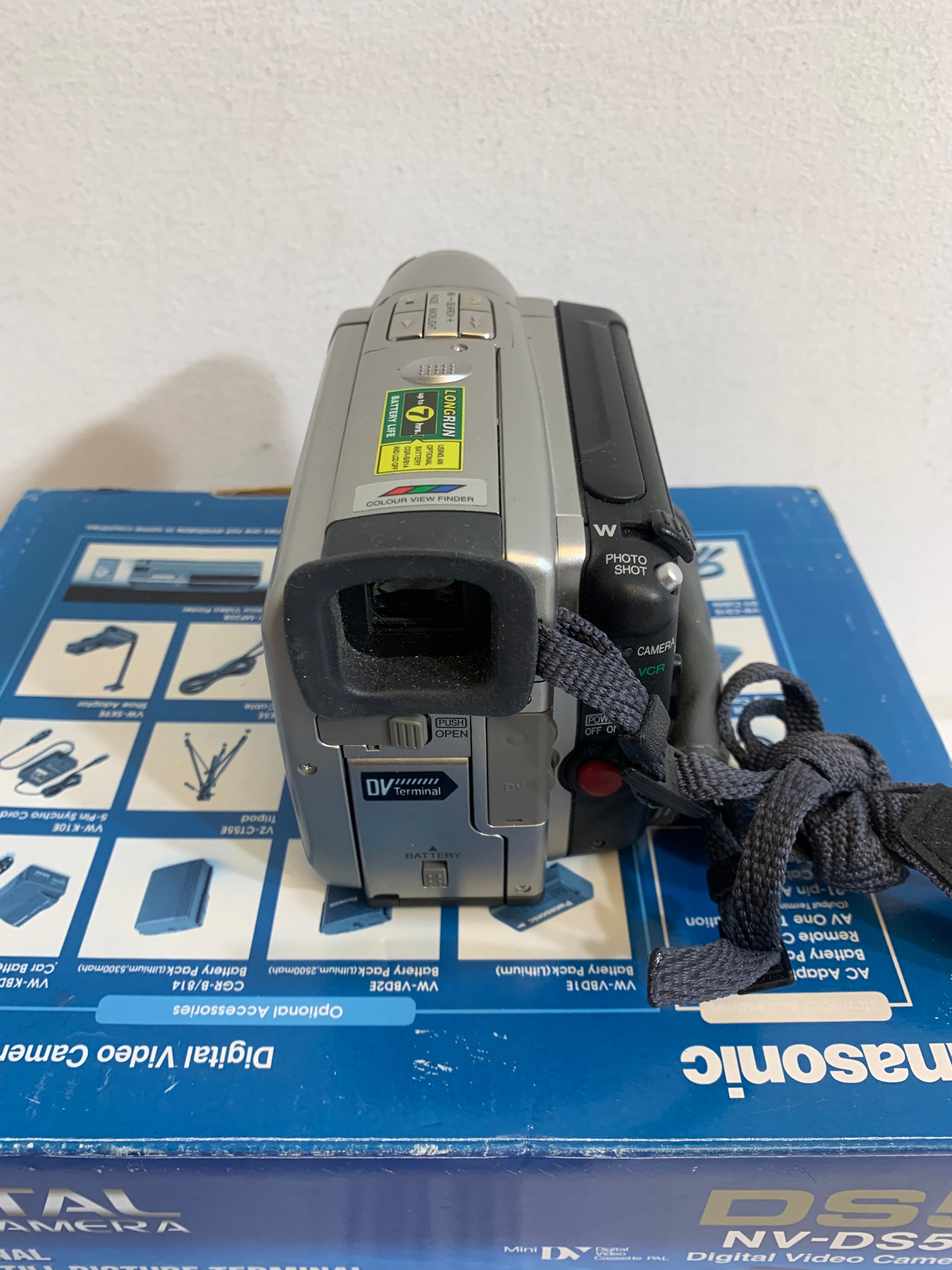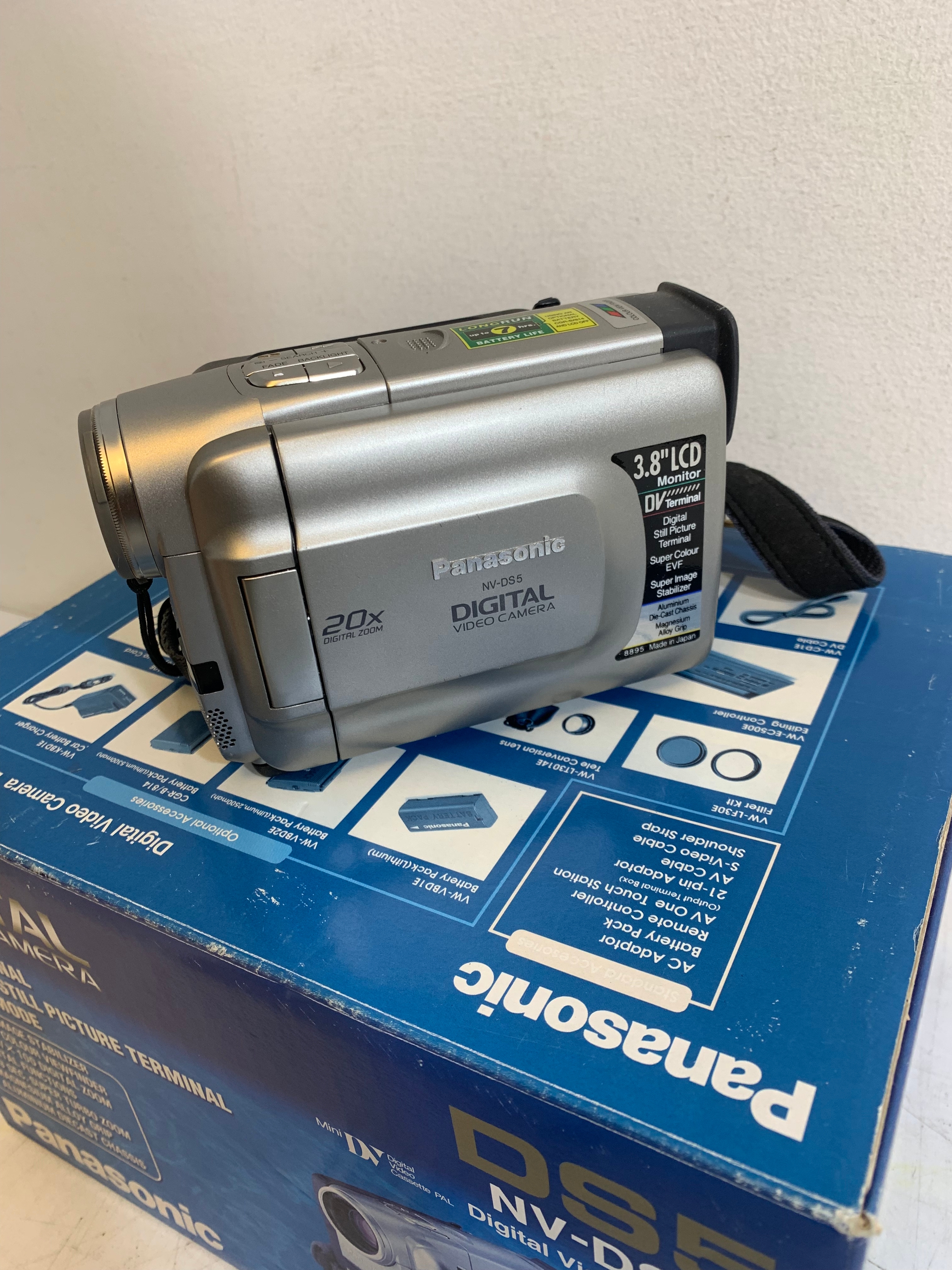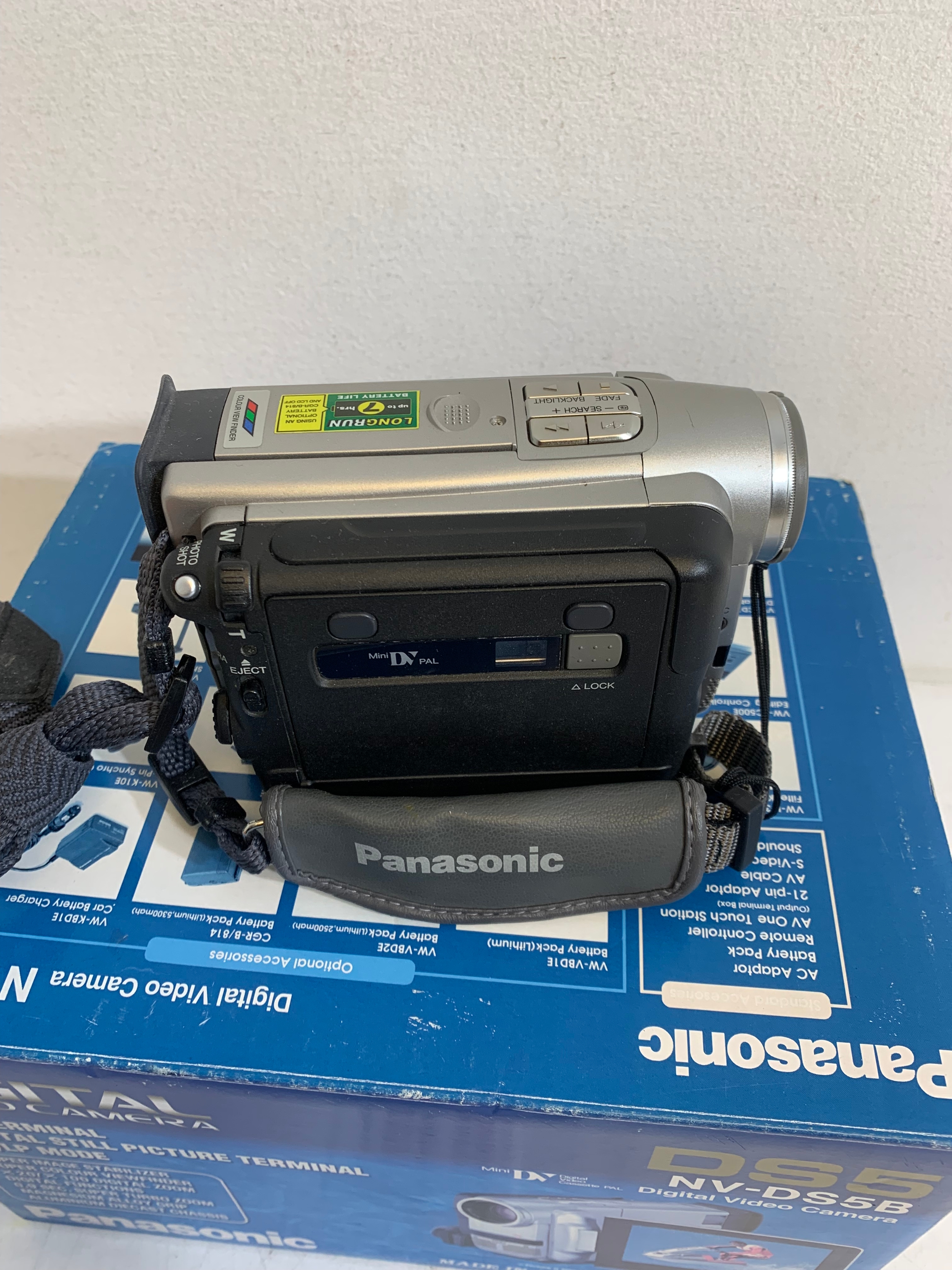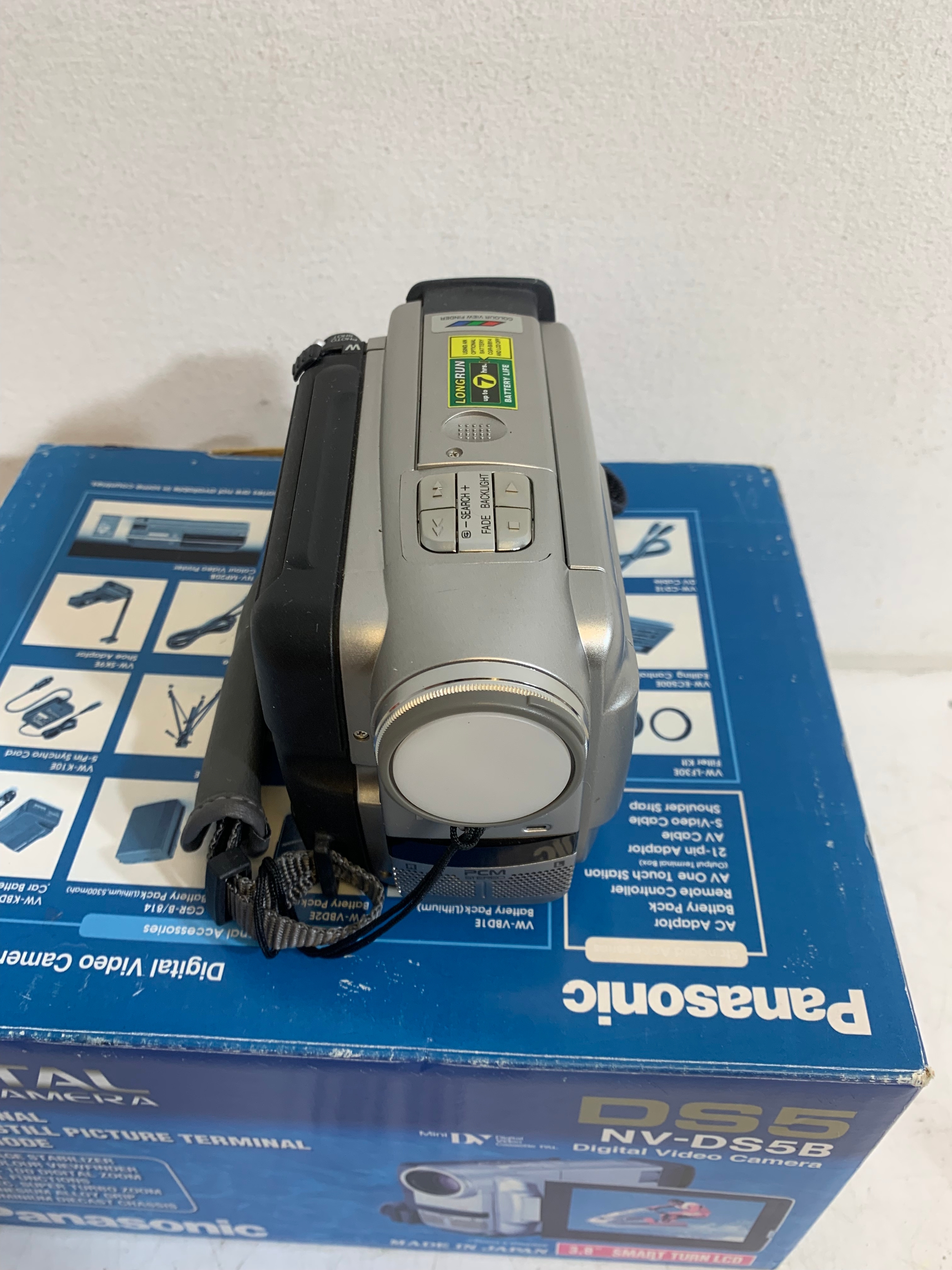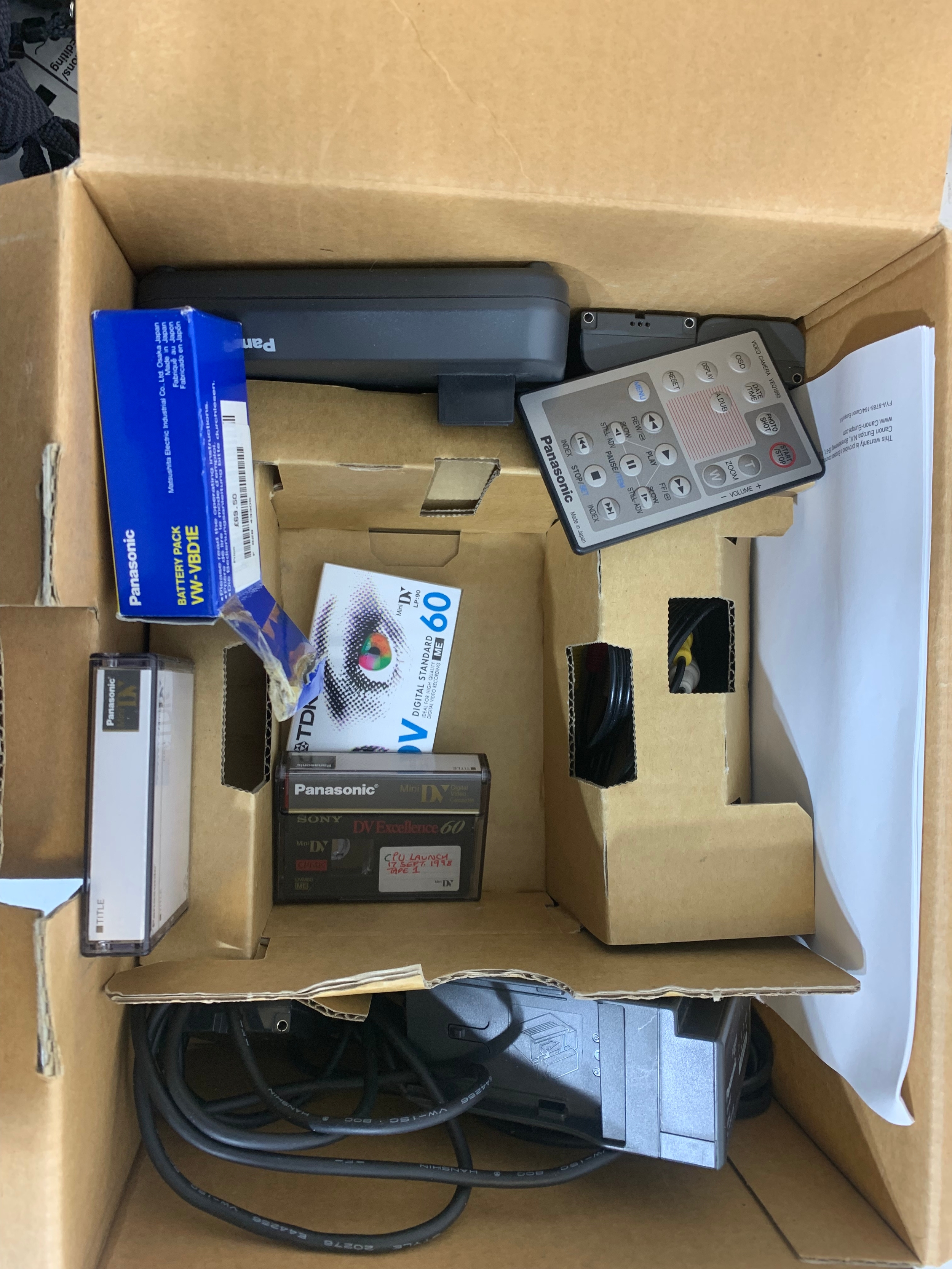 A Vintage Panasonic NV-DS5B mini DV camcorder, A pair of Vintage Belt SH- 80GT stereo Headphones with box, and Vintage Senheiser HD 340 head phones