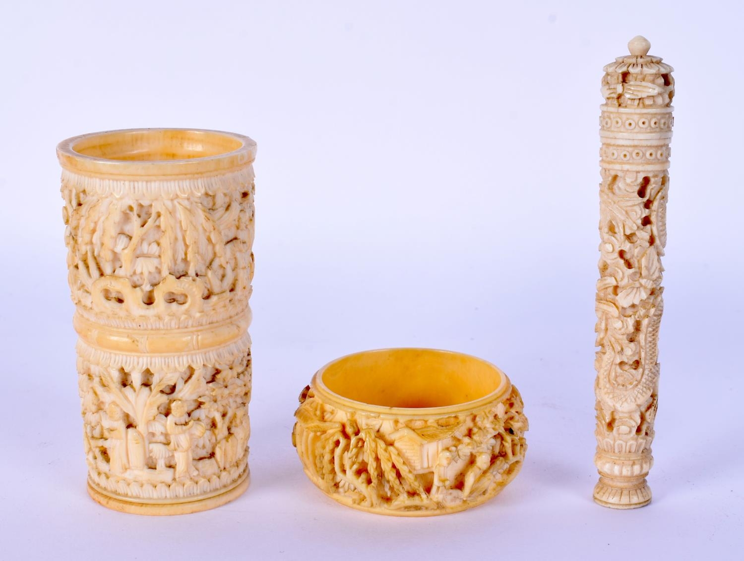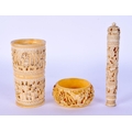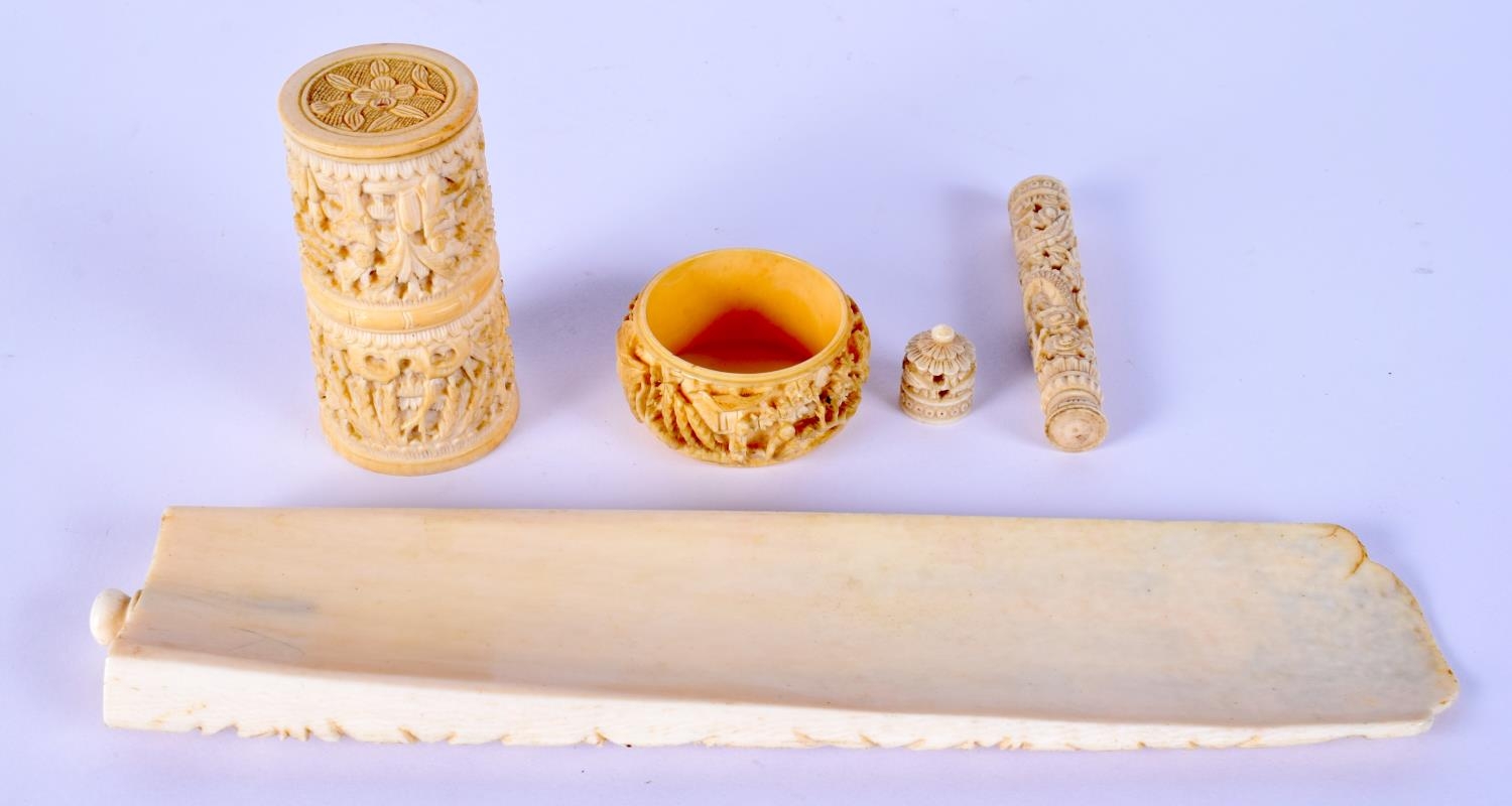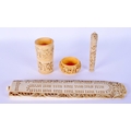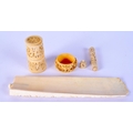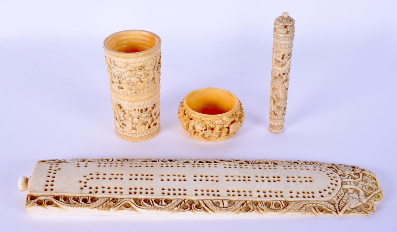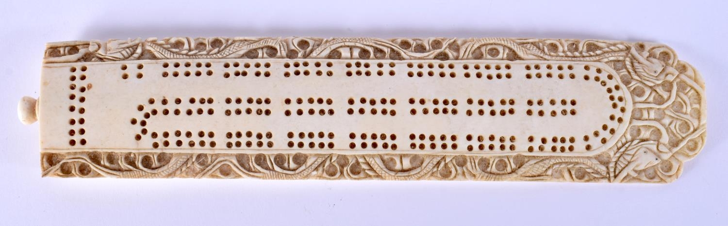 A 19TH CENTURY CHINESE IVORY CRIBBAGE BOARD together with dice shaker etc. Largest 24 cm long. (4)