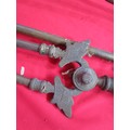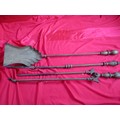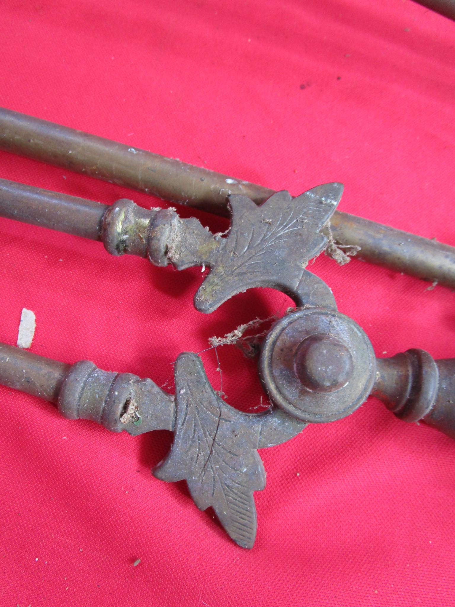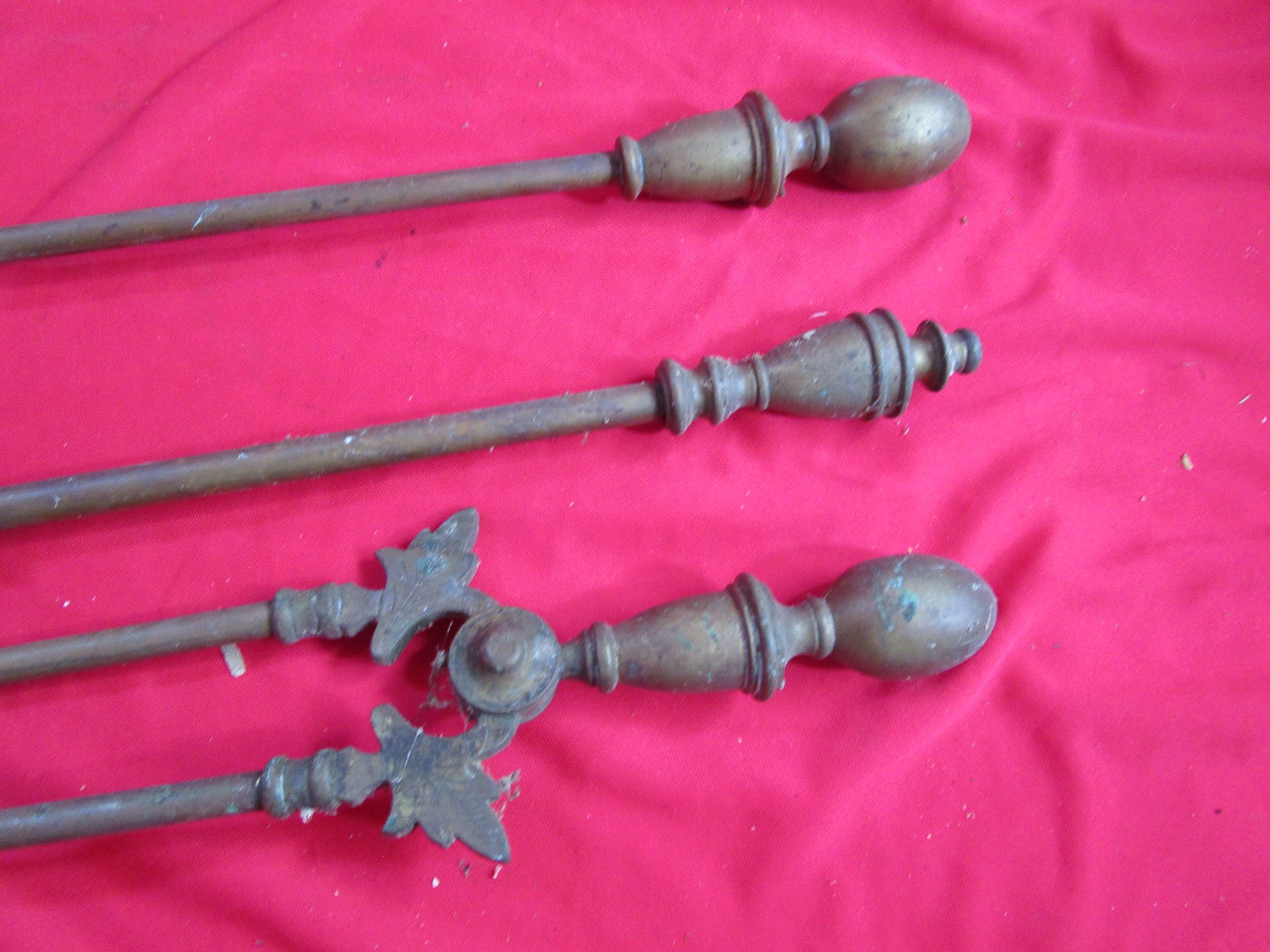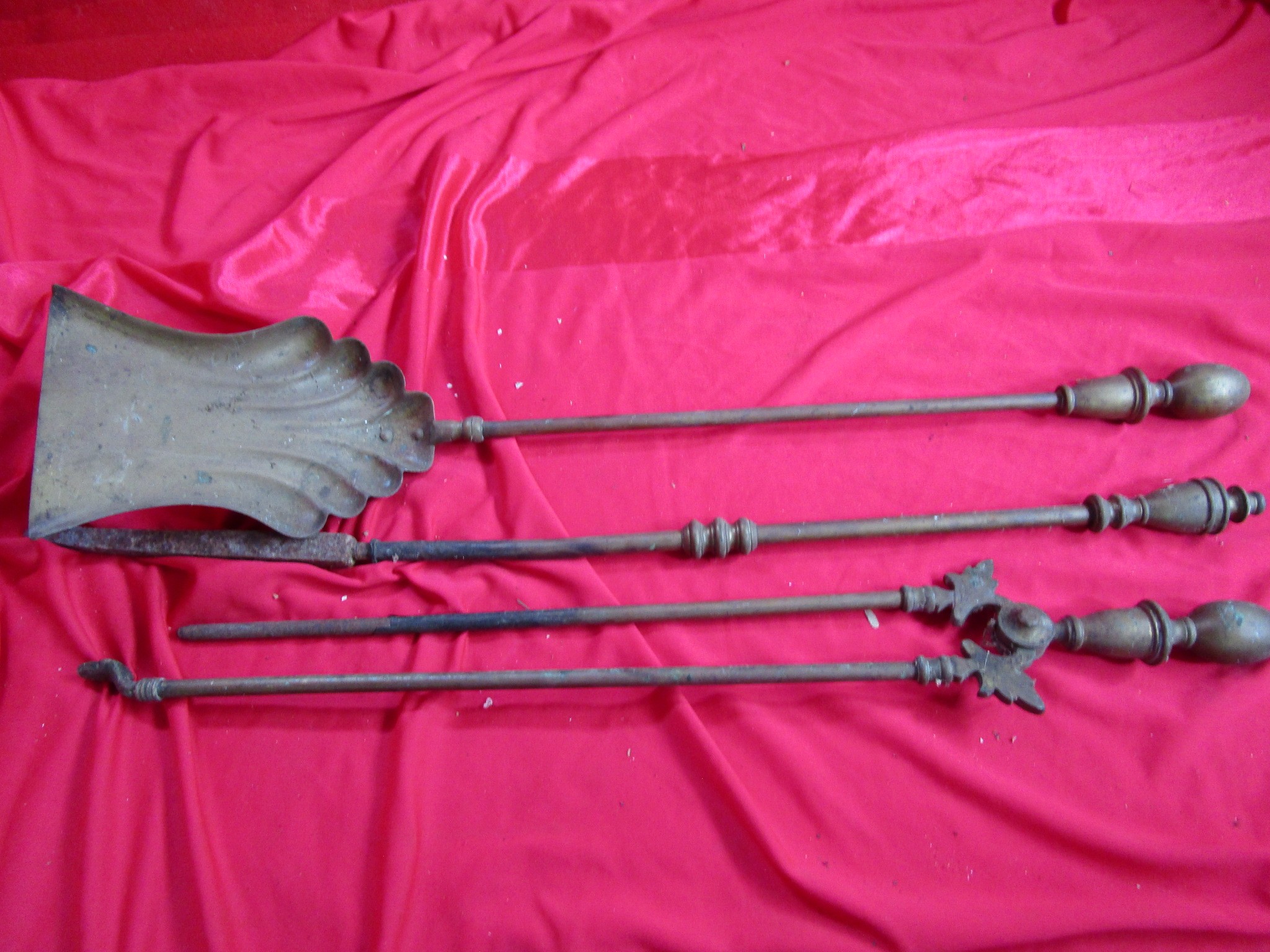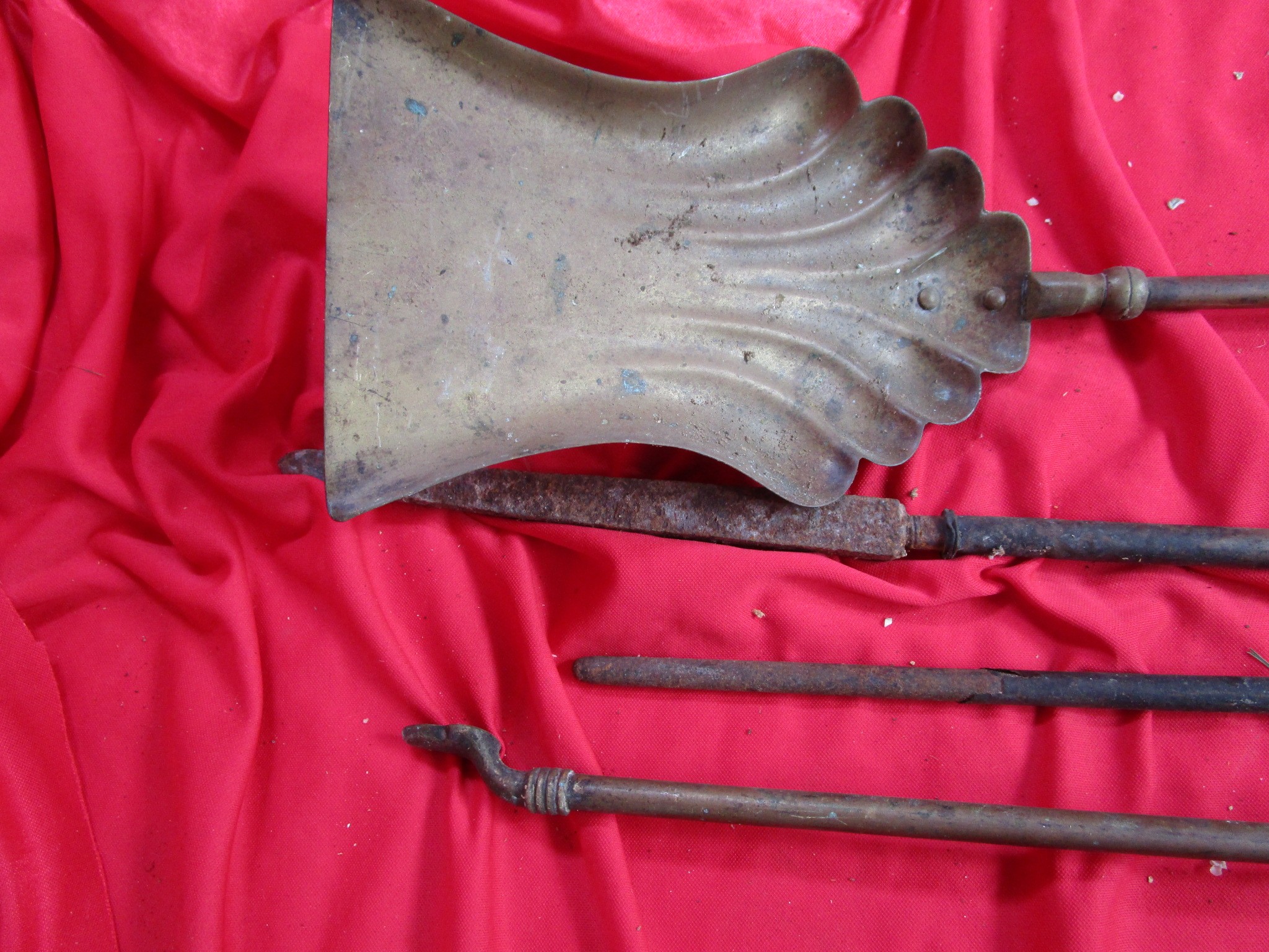 A vintage companion set in heavy brass Tongs Poker and shovel.