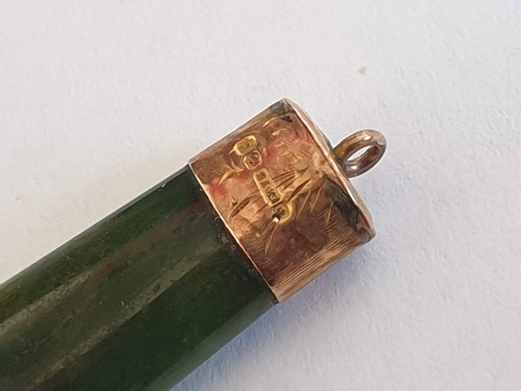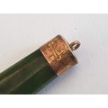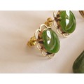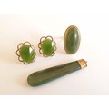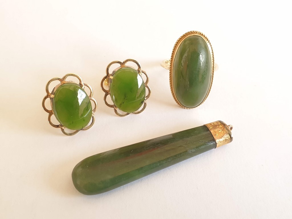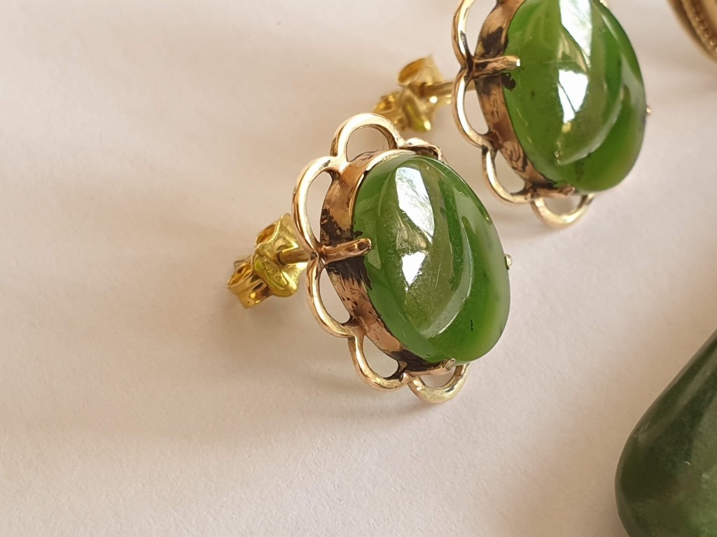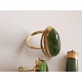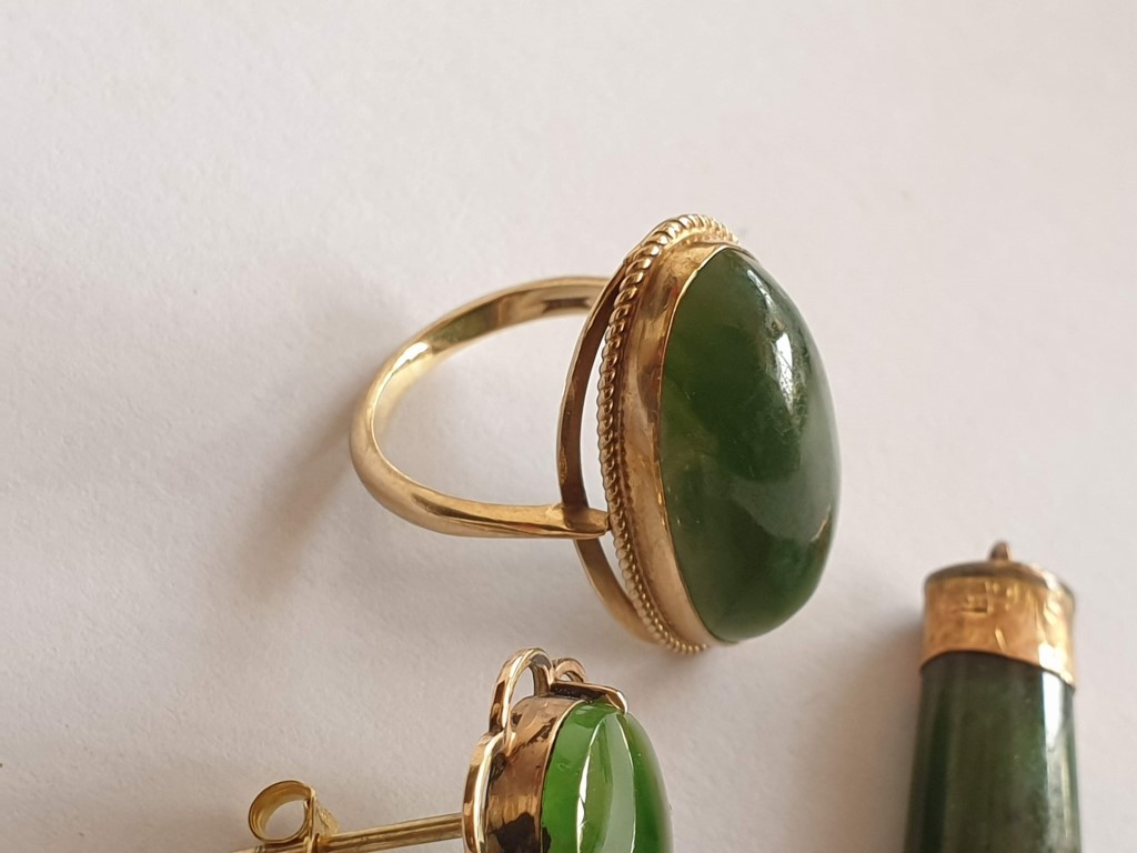 9ct Gold and Green Jade (?) Set of Jewellery inc; Ring with Oval Stones, Size K/L Weight 5.2gr, Drop Pendant with Gold Mount L:4.5cm and Pair of Earrings with Oval Stone and Decorative Gold Surround