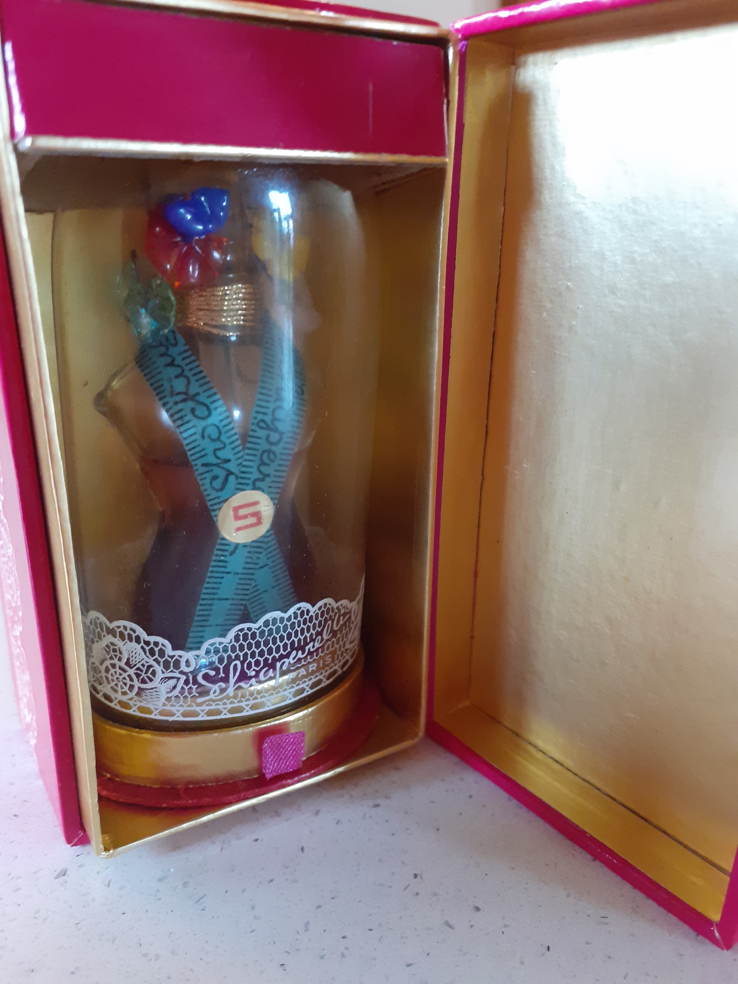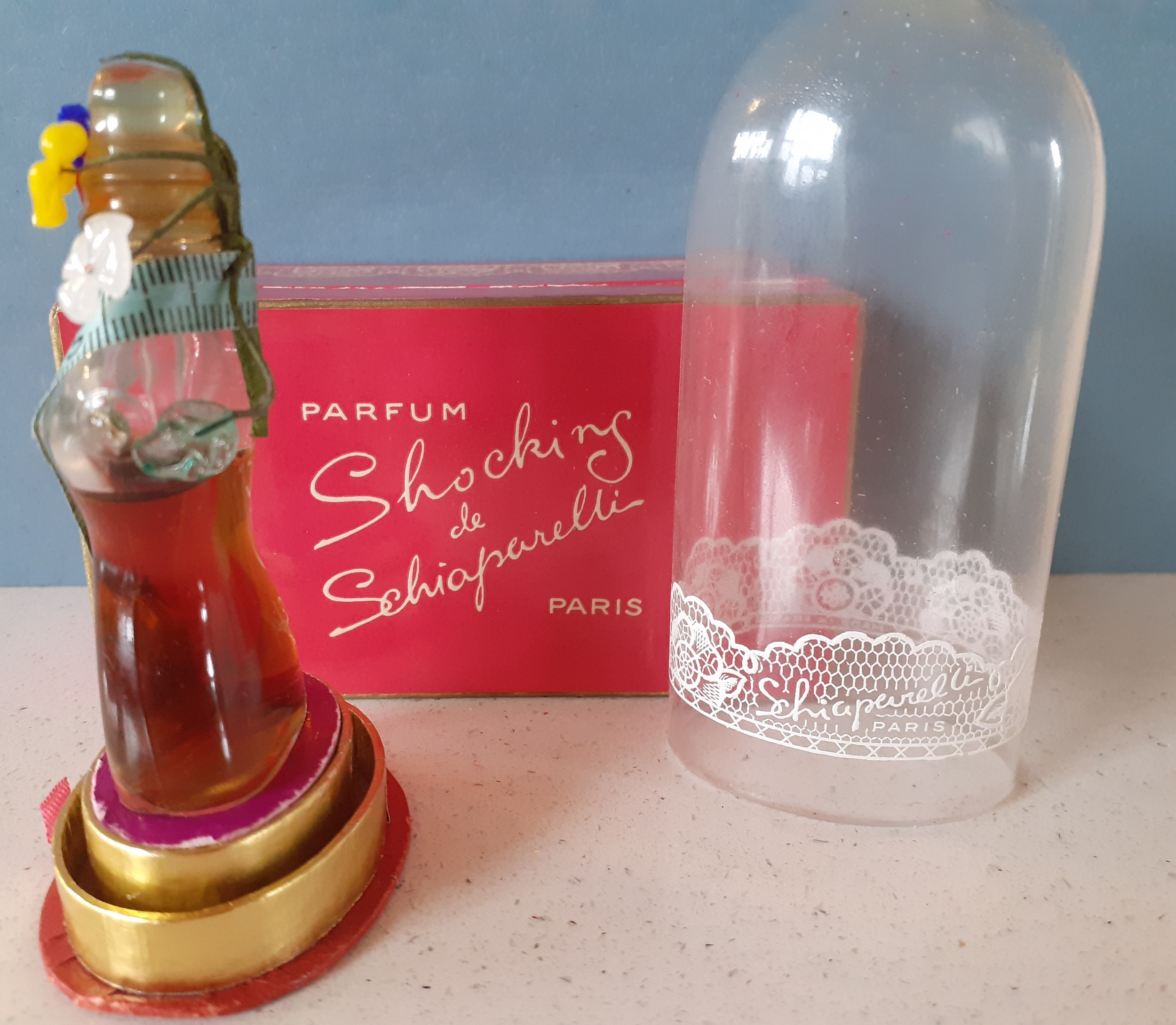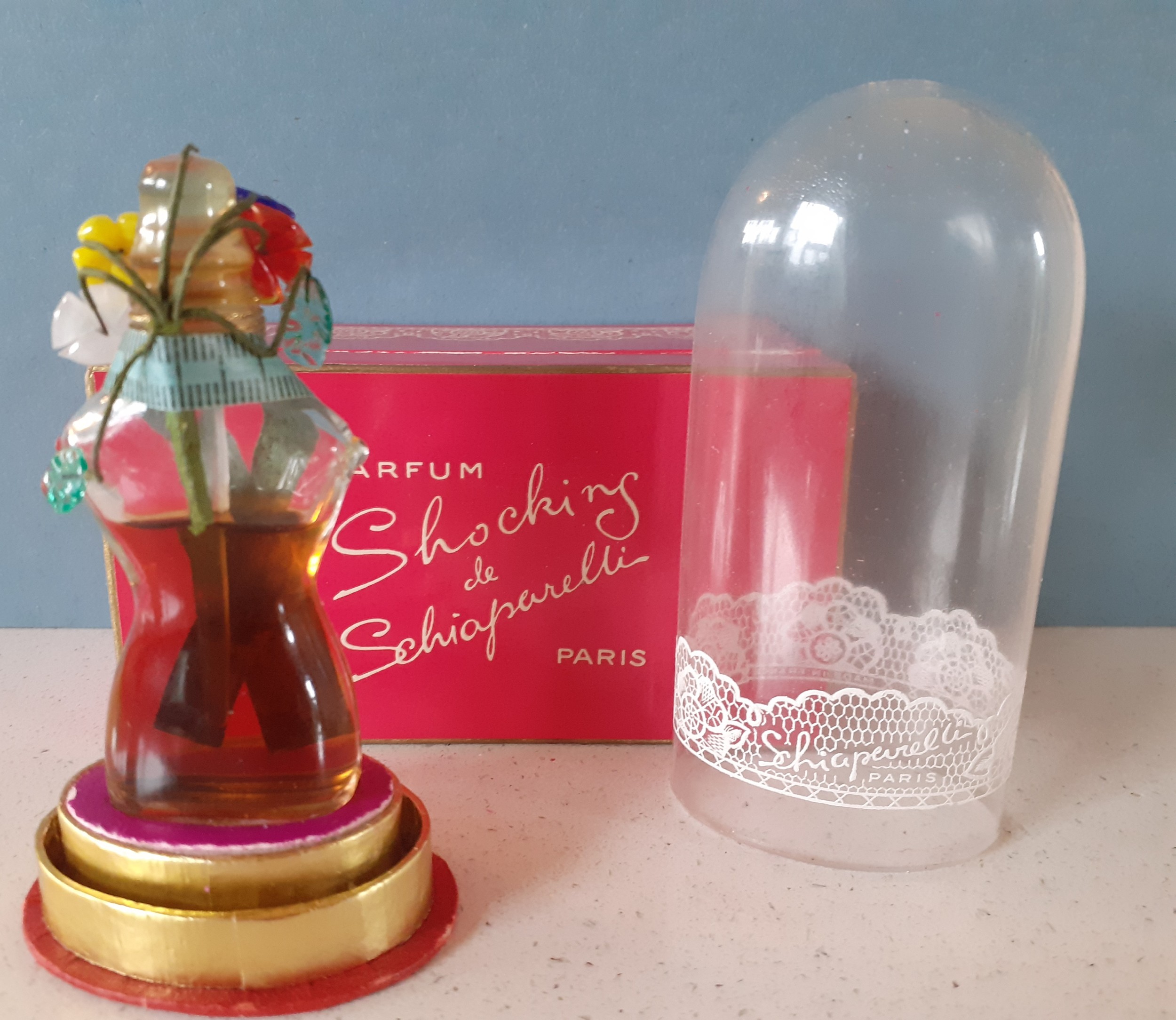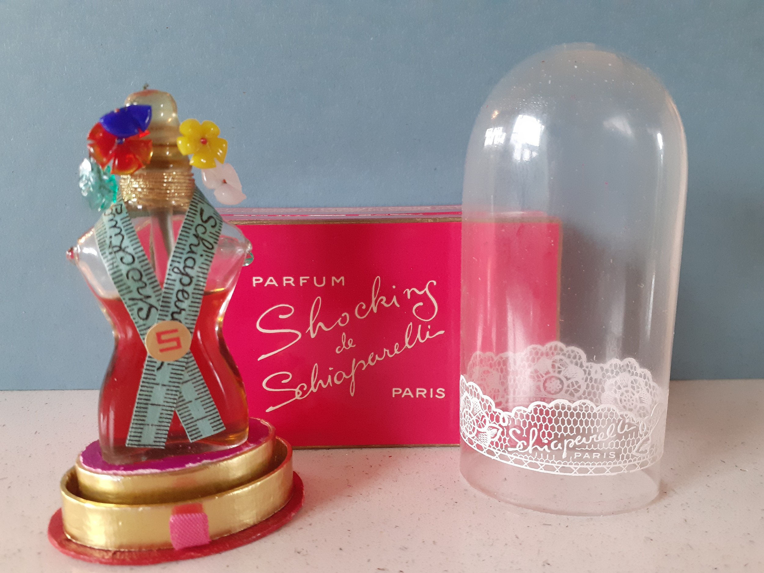 Elsa Schiaparelli-A 1930's-1950's 0.5oz bottle of Shocking de Schiaparelli parfum created by Jean Carles and based on Mae West's dressmaker dummy, three quarters full, the bottle in the female form decorated with a tape measure sash and Murano glass flowers and leaves, measuring 2.7/8" tall, under a glazed dome with original shocking pink box. Location:R1.3