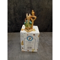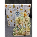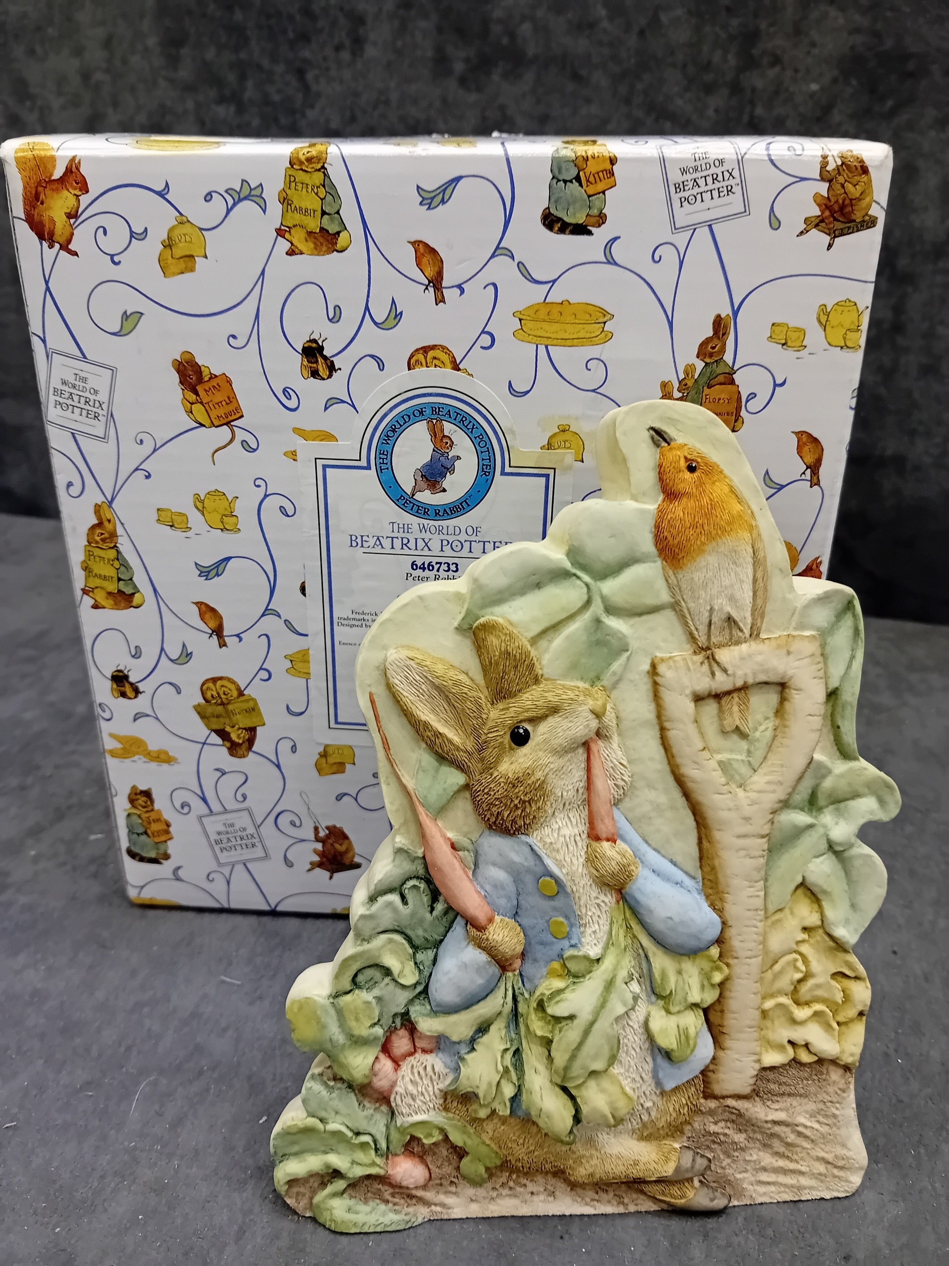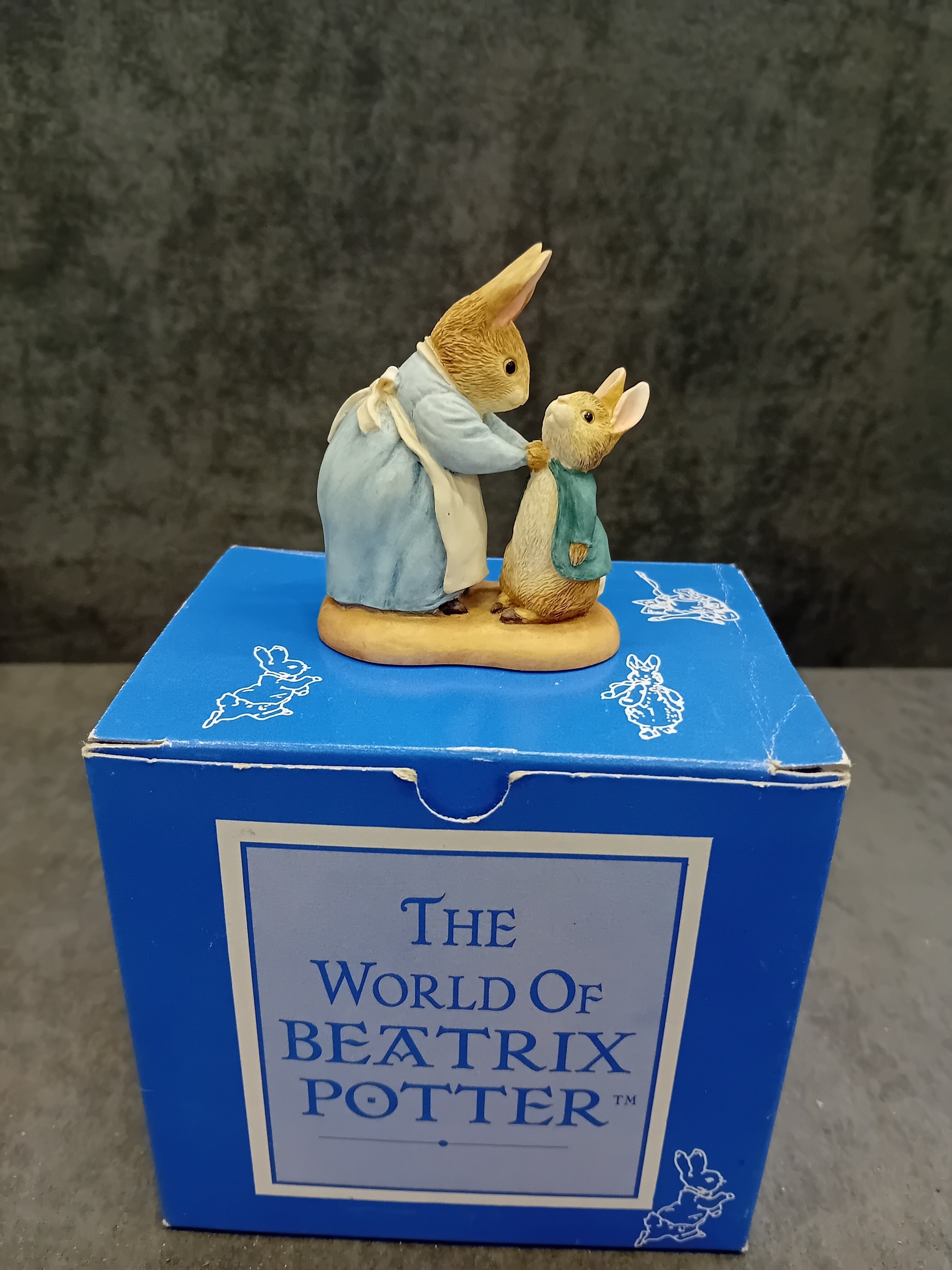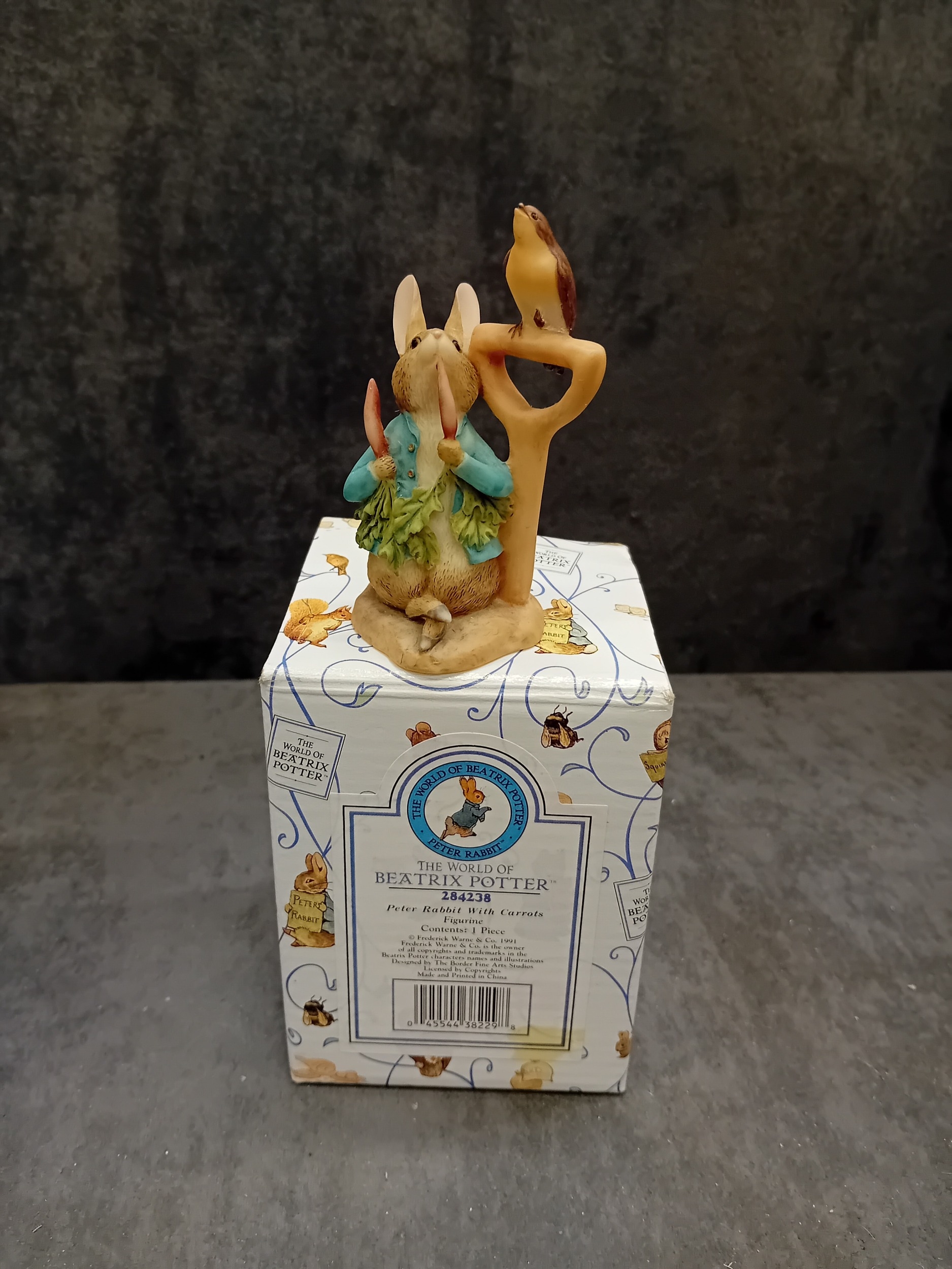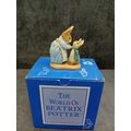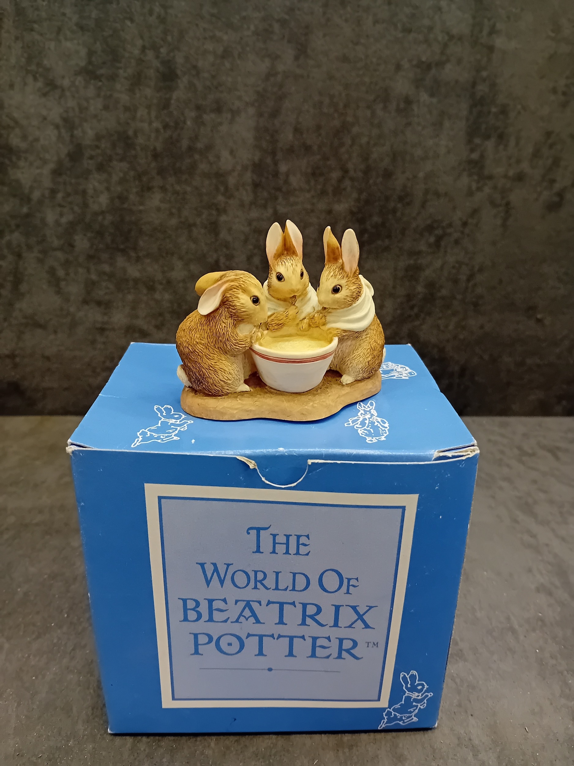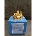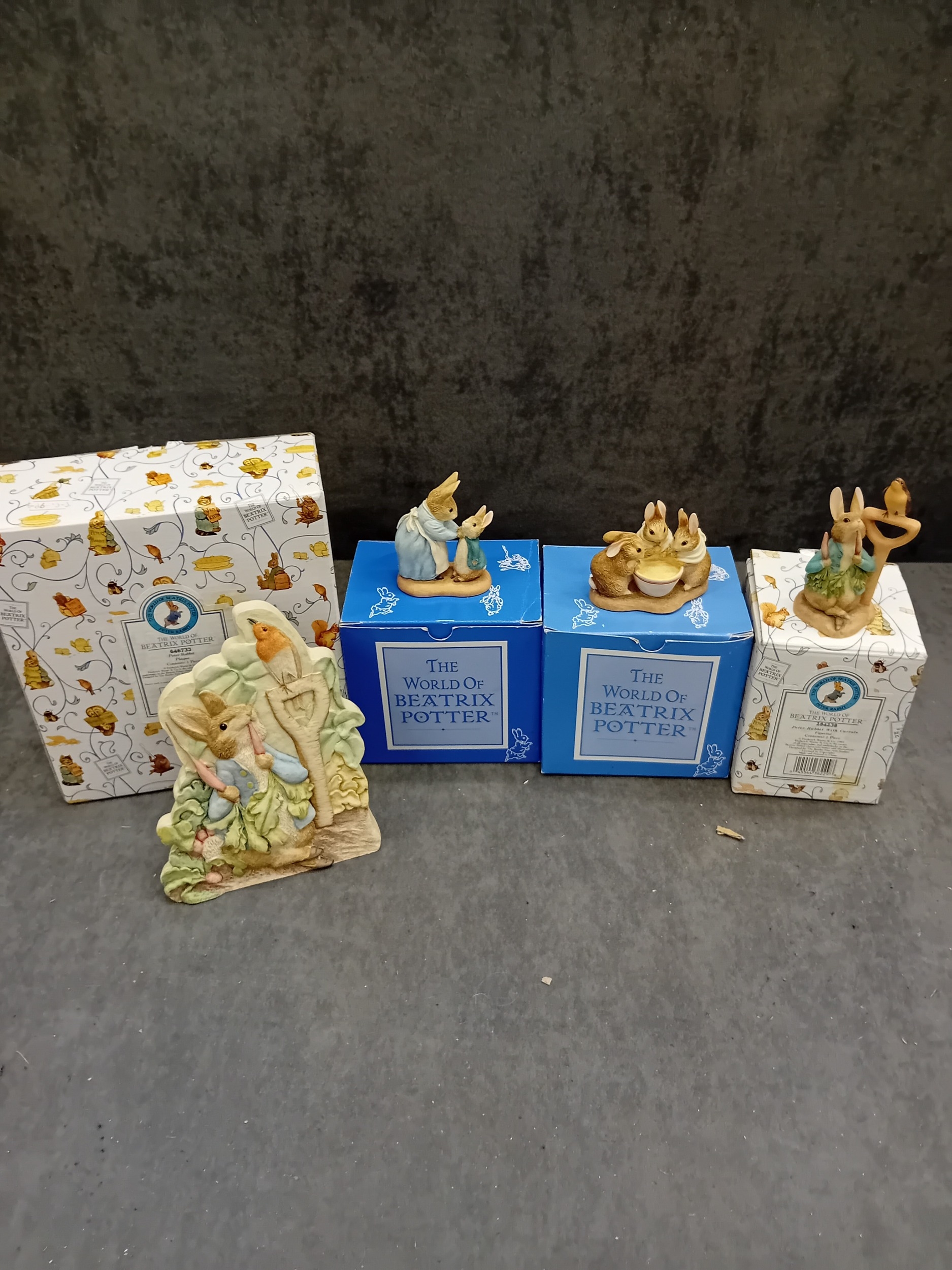 A collection of four 'The World of Beatrix Potter' figurines by Border Fine Arts, each presented with its original packaging. These decorative pieces depict anthropomorphic rabbits and groups of rabbits, crafted in an illustrative style characteristic of Beatrix Potter's beloved children's book characters. One figurine is specifically identified as 'Peter Rabbit With Carrots' holding a spade alongside a bird. The collection also includes a figurine of three young rabbits gathered around a bowl, a mother rabbit with a child, and another individual rabbit character. Constructed from hand-painted cast resin or ceramic, all items are clearly branded 'The World Of BEATRIX POTTER' on their visible blue and patterned white boxes.