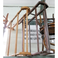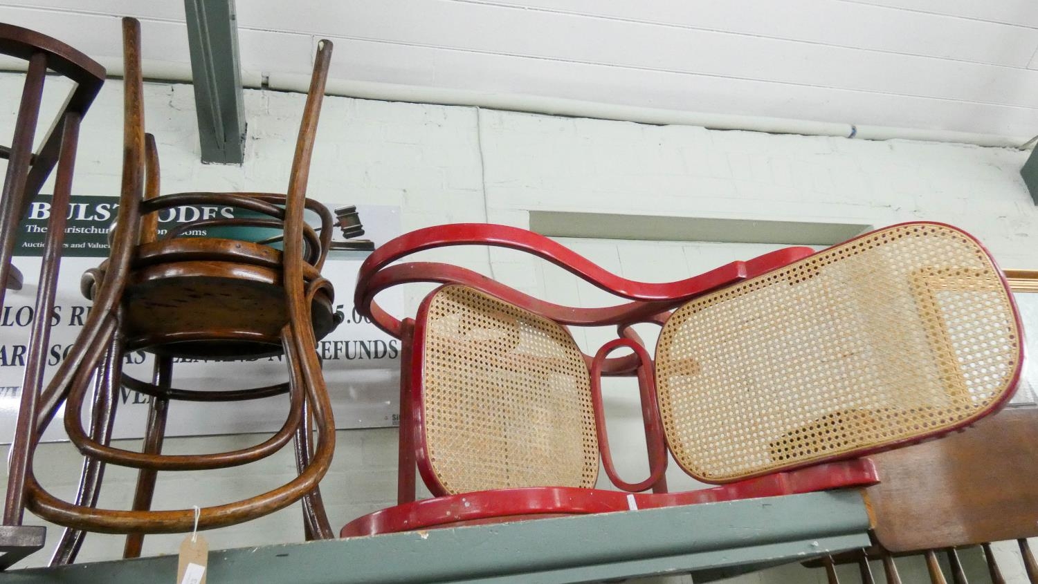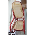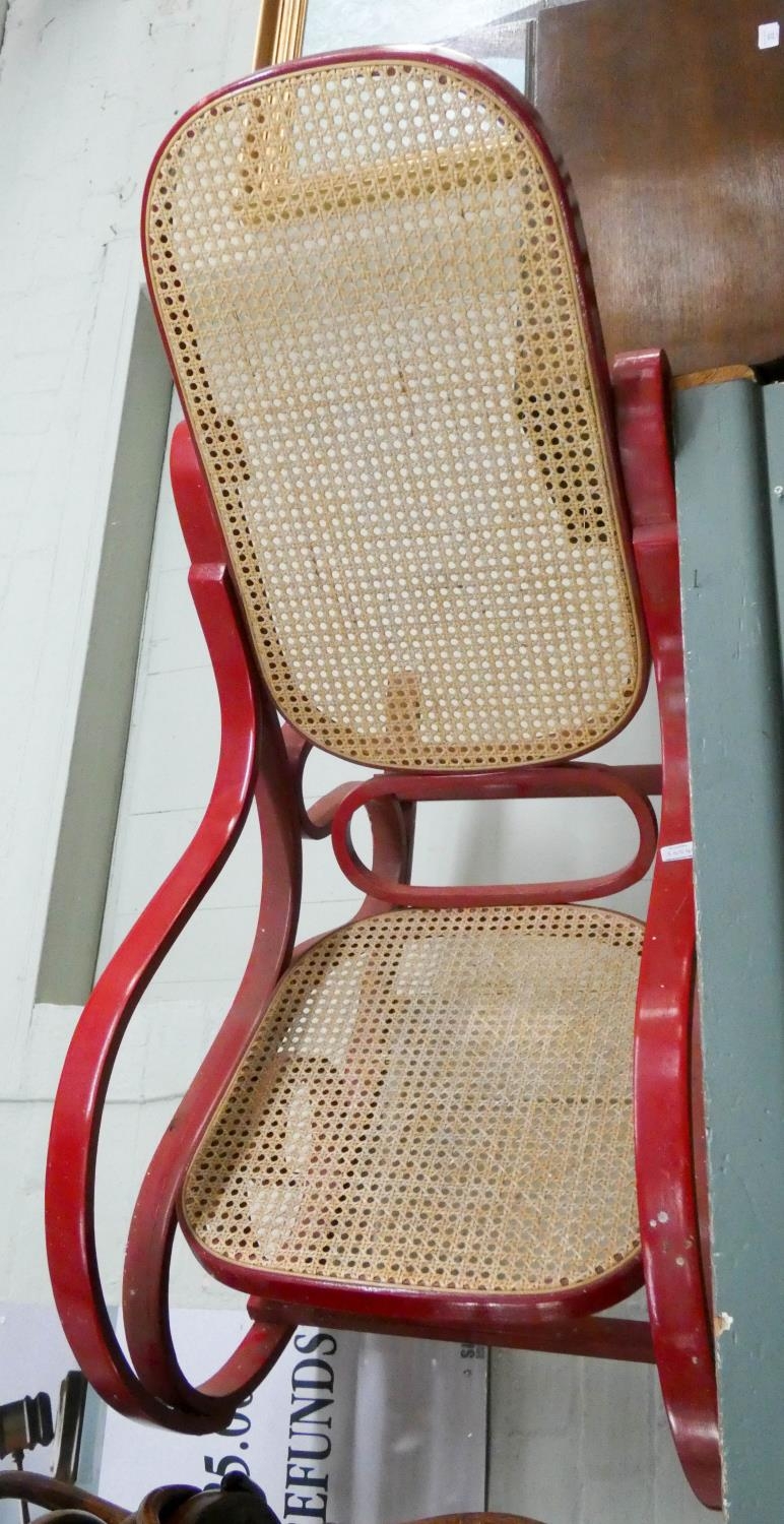 A pair of round seat Bentwood chairs and a red painted rocking elbow chair with cane panel seat and back