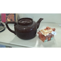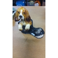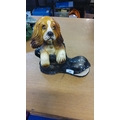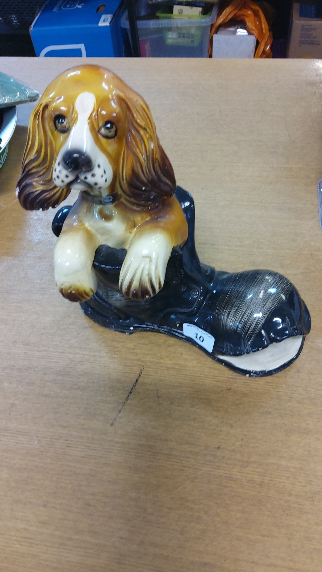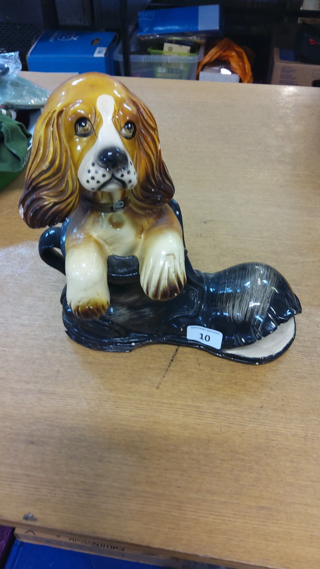Glazed earthenware model of a spaniel resting its forepaws on a black boot, naturalistically painted in brown, cream and black, with moulded fur and collar detail.
