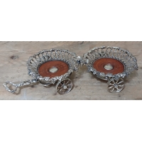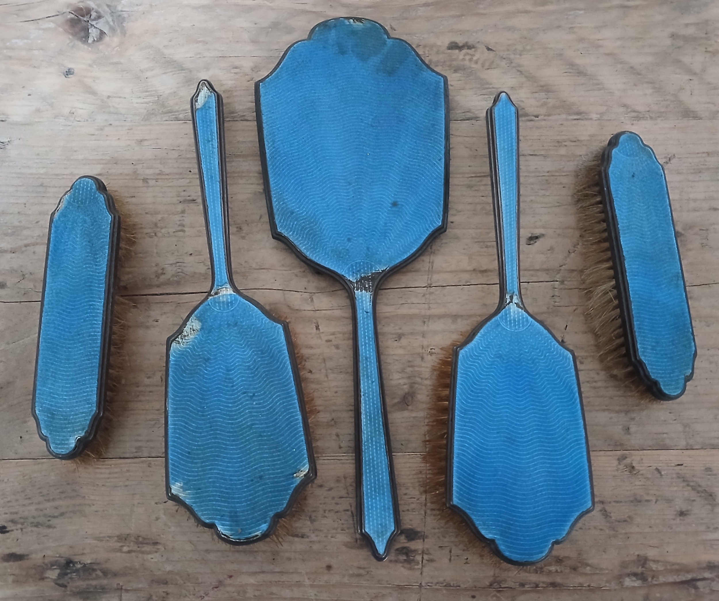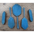 A five piece hallmarked silver and blue enamel dressing table set, as found.