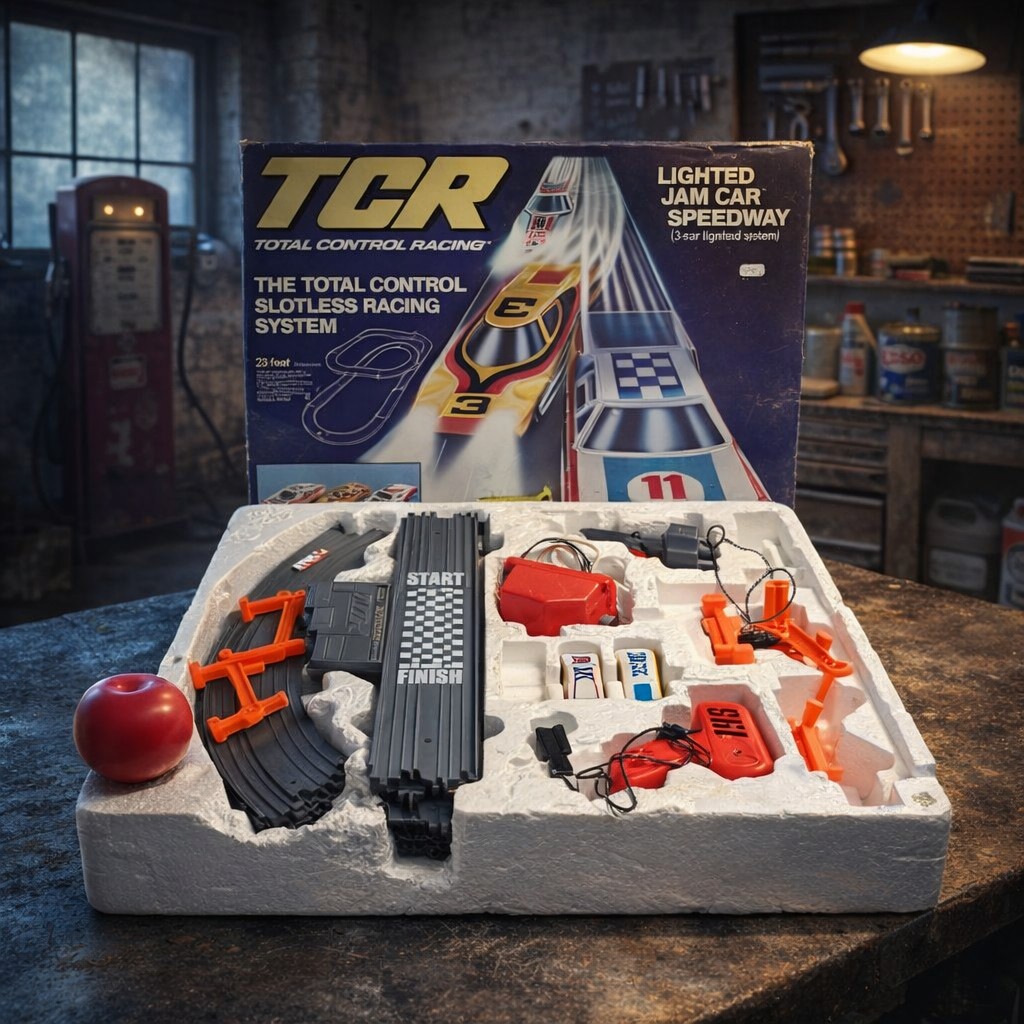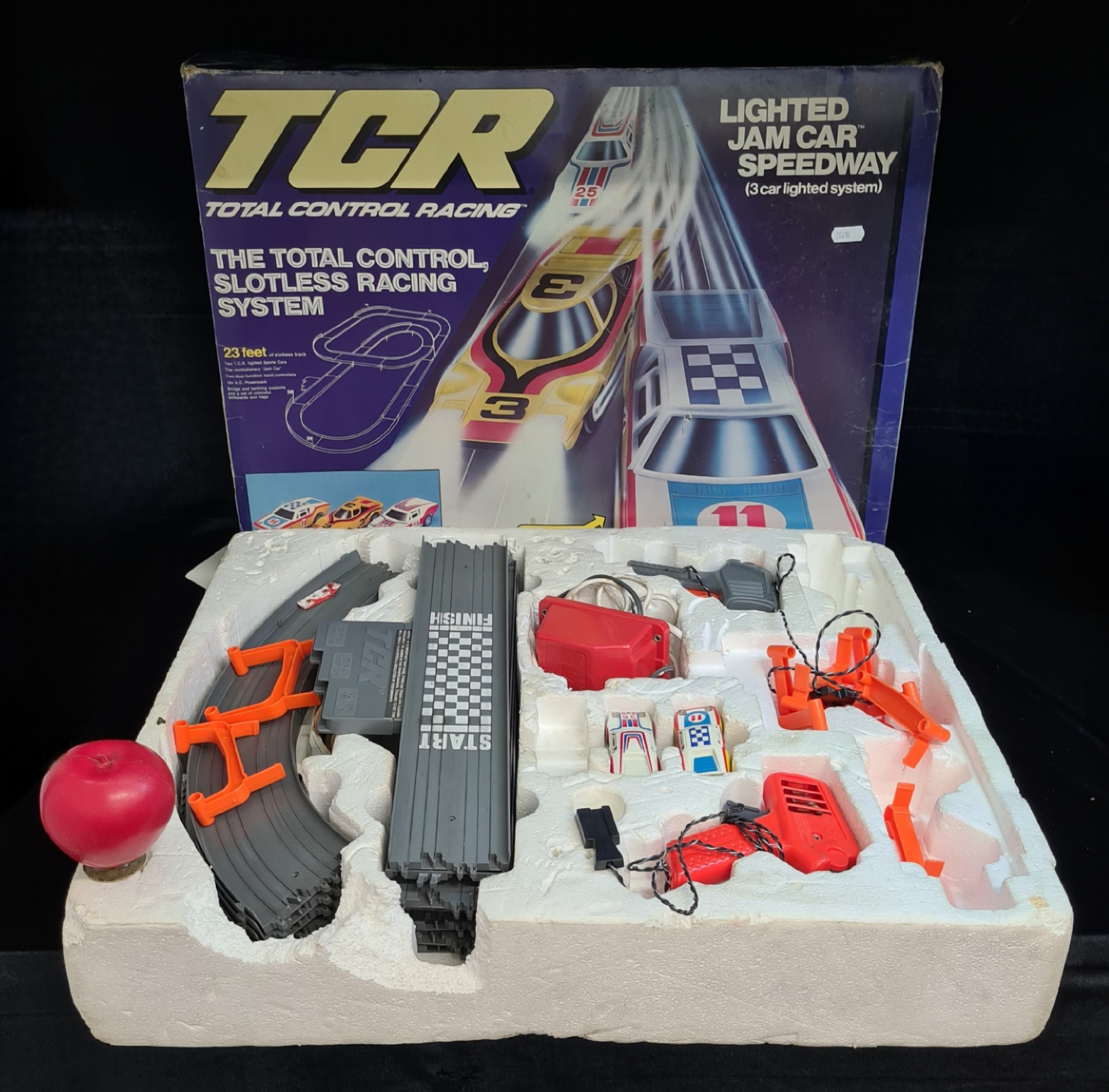 An awesome retro 'TCR (Total control racing) game. In original box, includes 23 ft of Slotless track, missing one car.