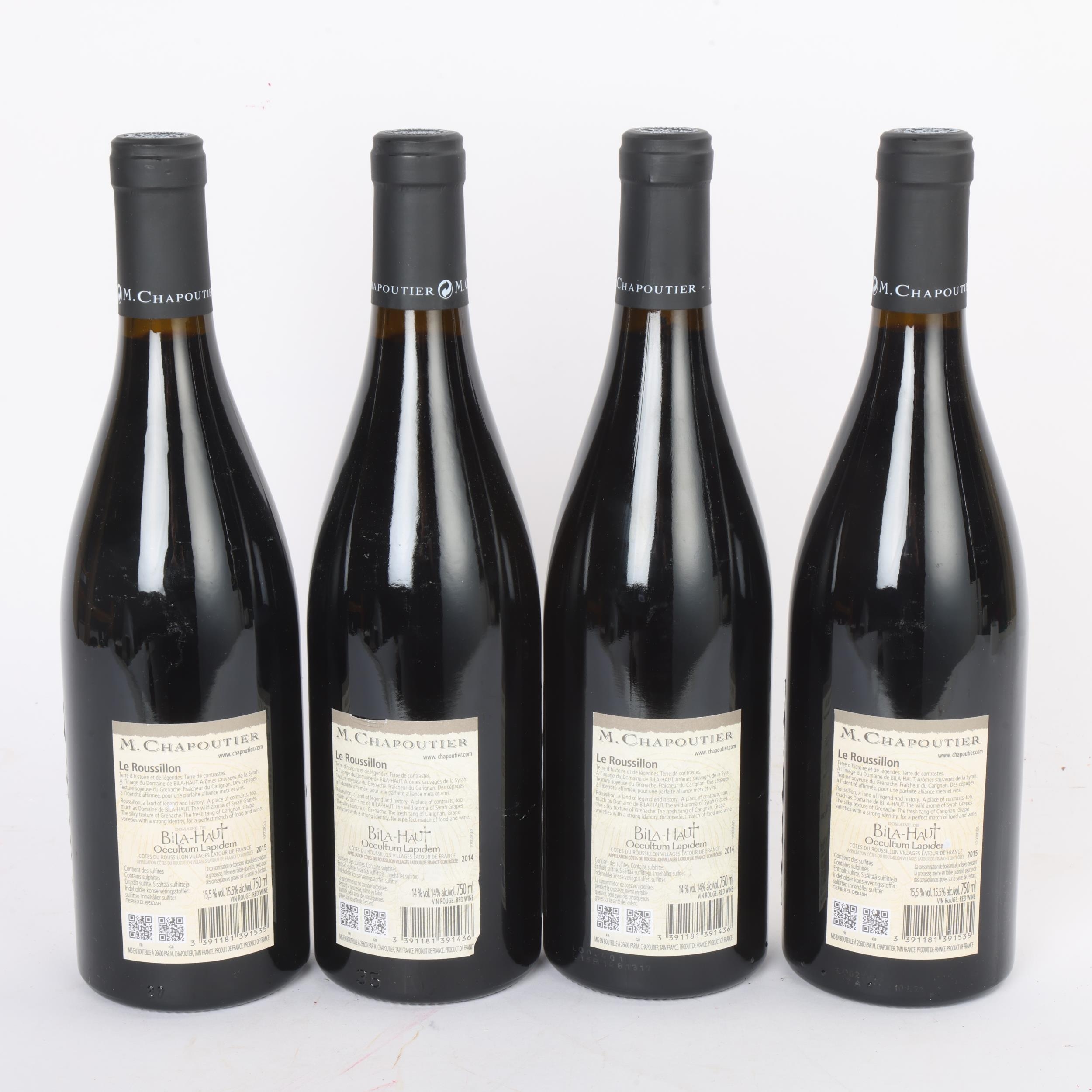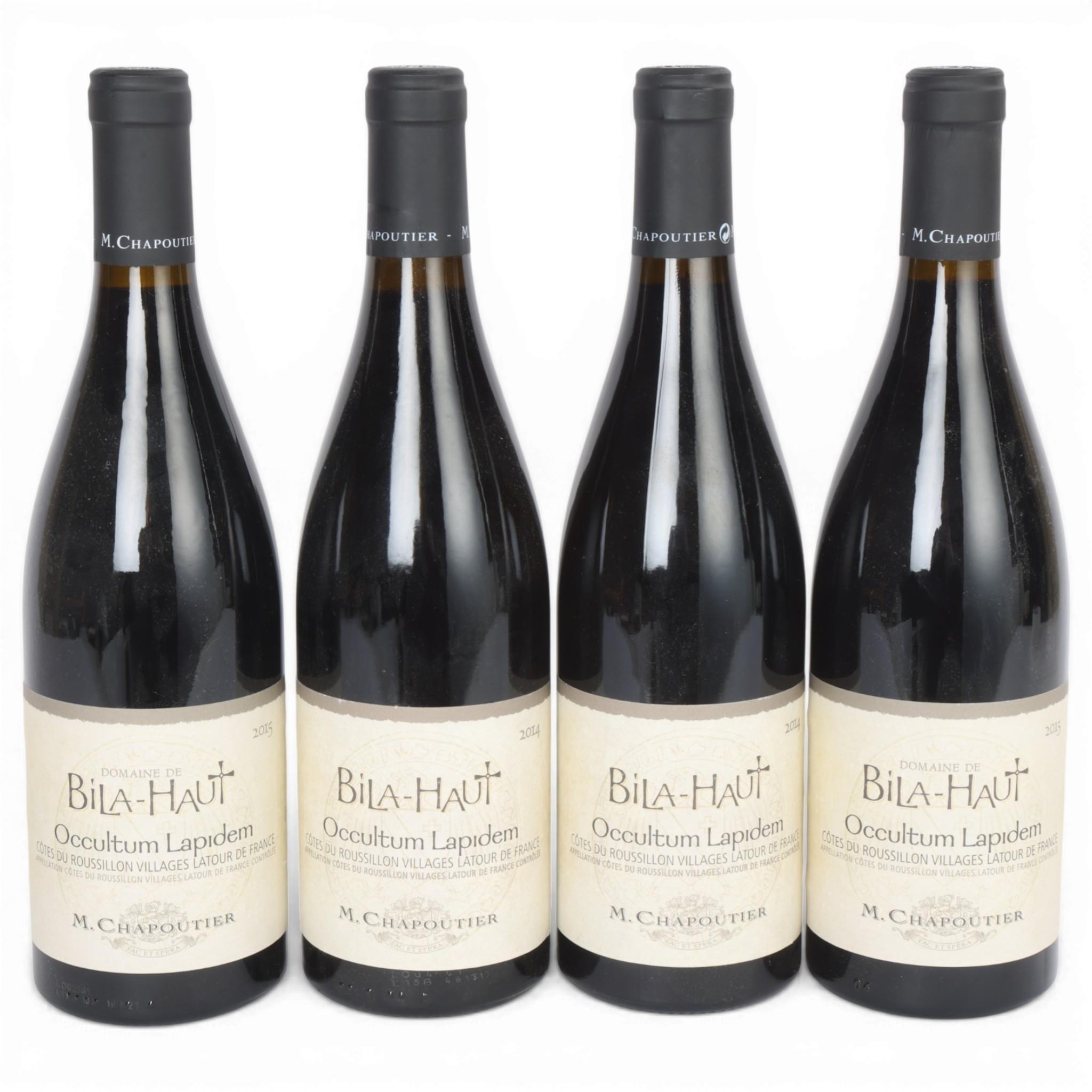 4 bottles of Cotes De Roussillion Villages red wine, M Chapoutier, Bila-Haut, Occultum Lapidem, 2 x 2014 and 2 x 2015, 750ml, 15.5% vol