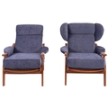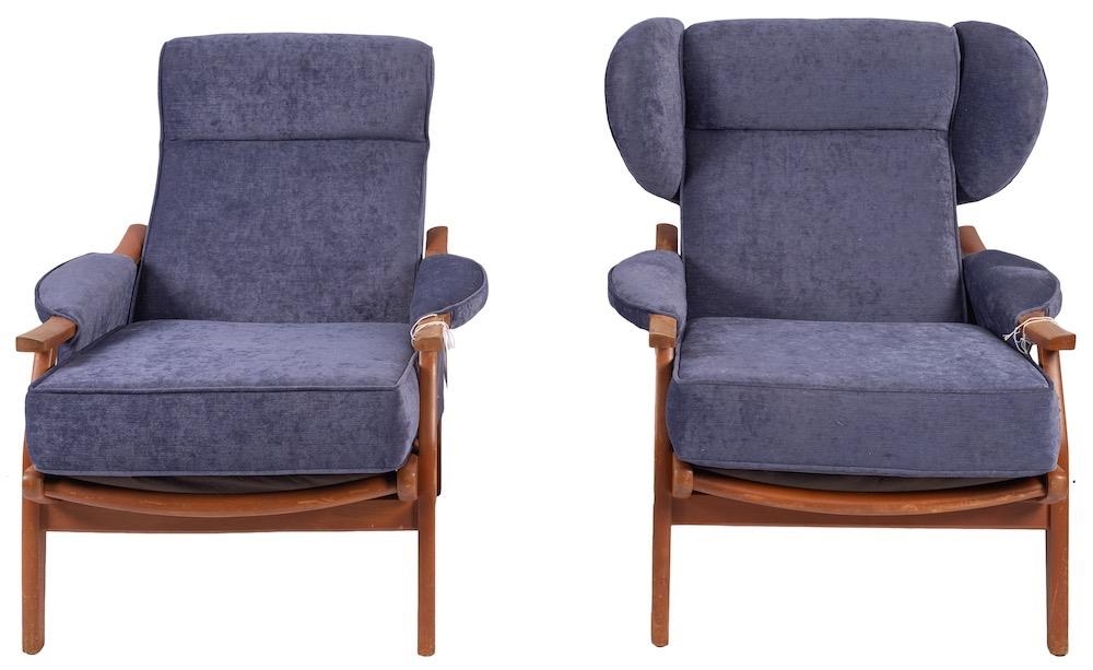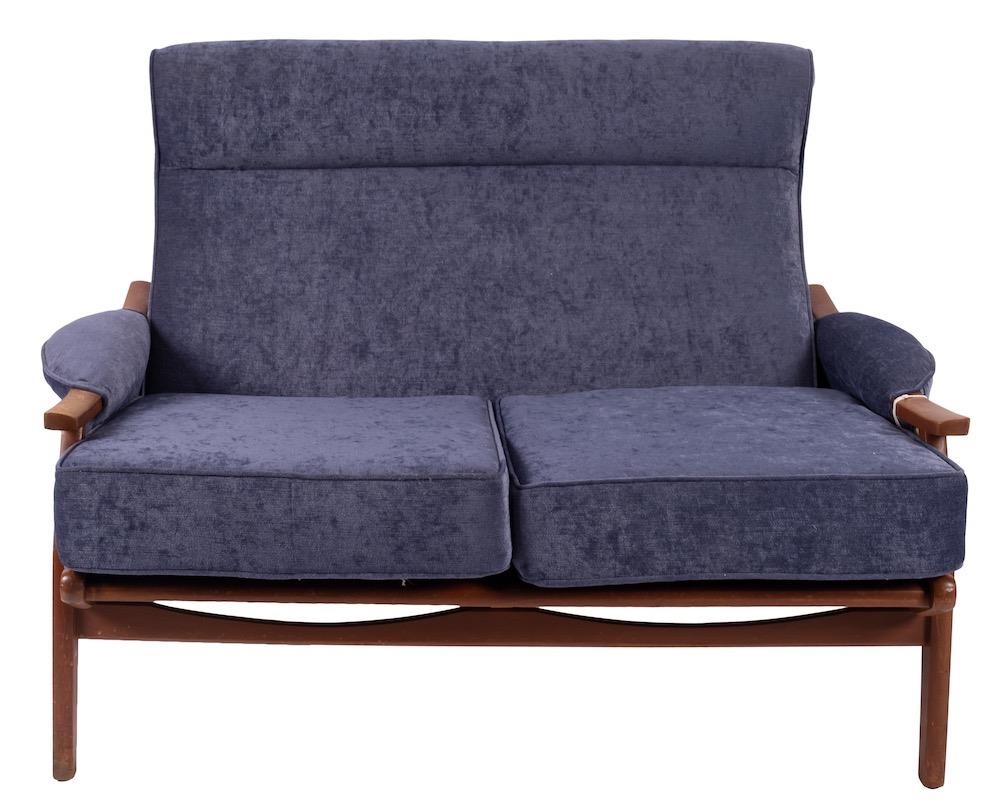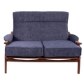A beech and blue upholstered lounge suite, probably Parker Knoll, circa late 1980s; comprising sofa and two armchairs -one with winged back; the sofa 88cm high, 124cm wide