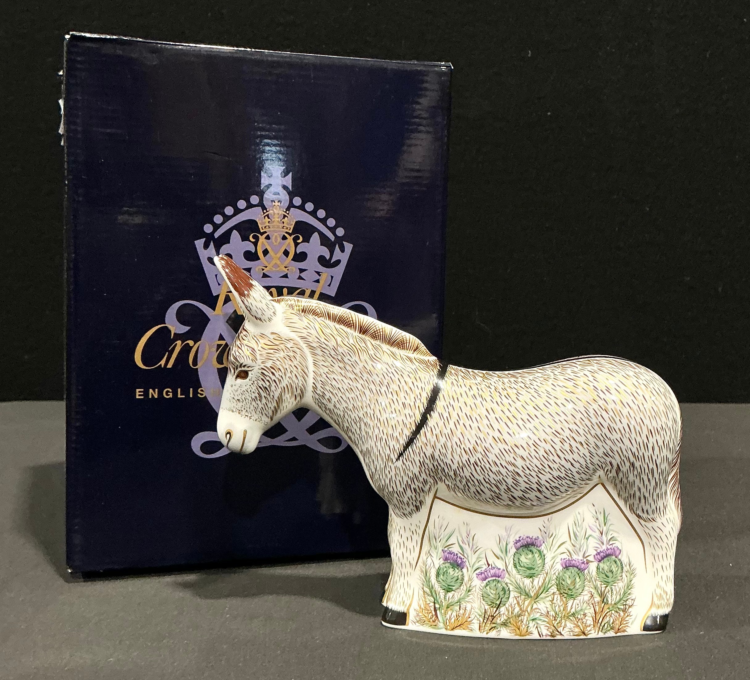 A Royal Crown Derby paperweight, Donkey, gold stopper, 16cm high, 19cm long, printed mark in red, boxed
