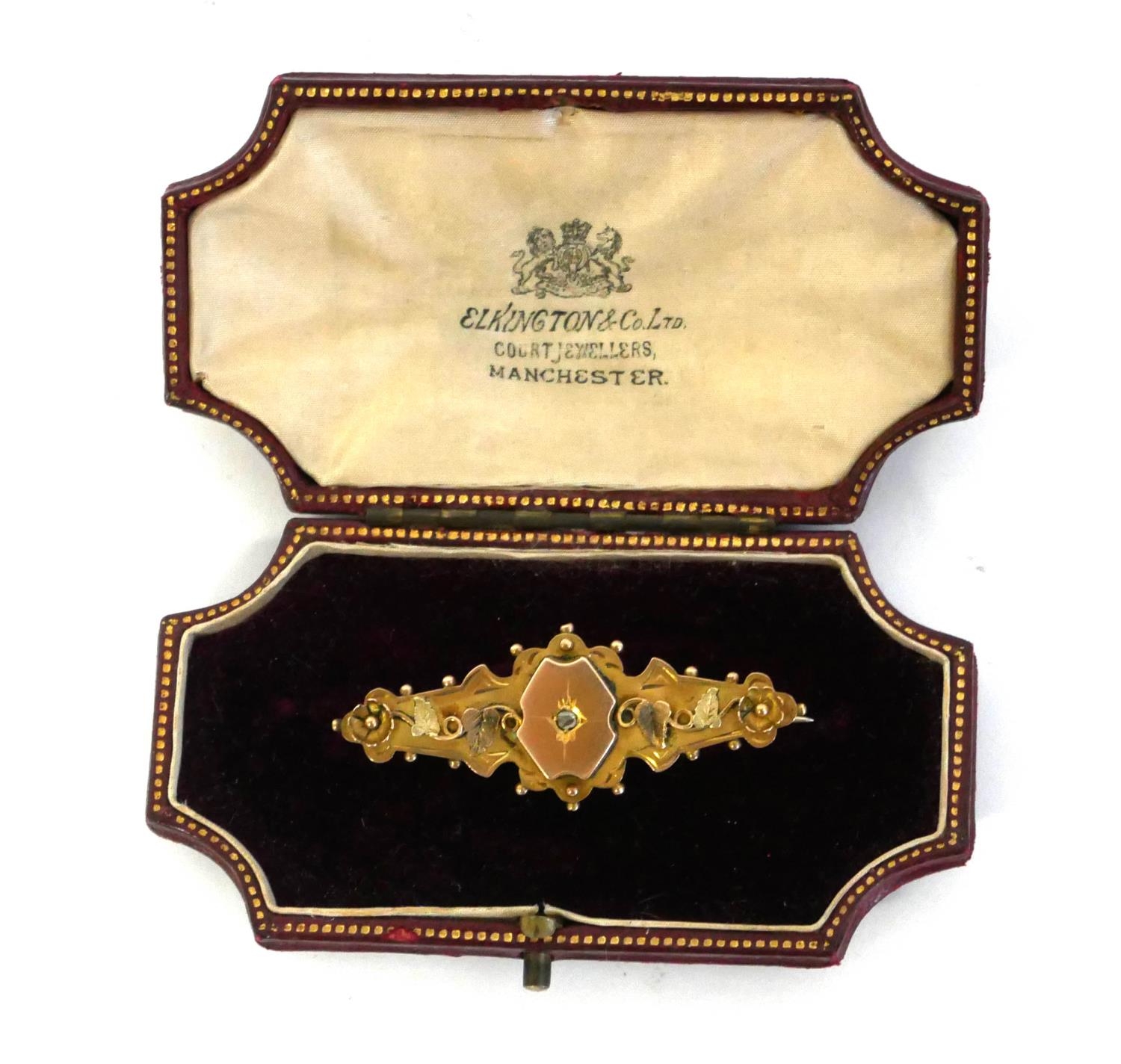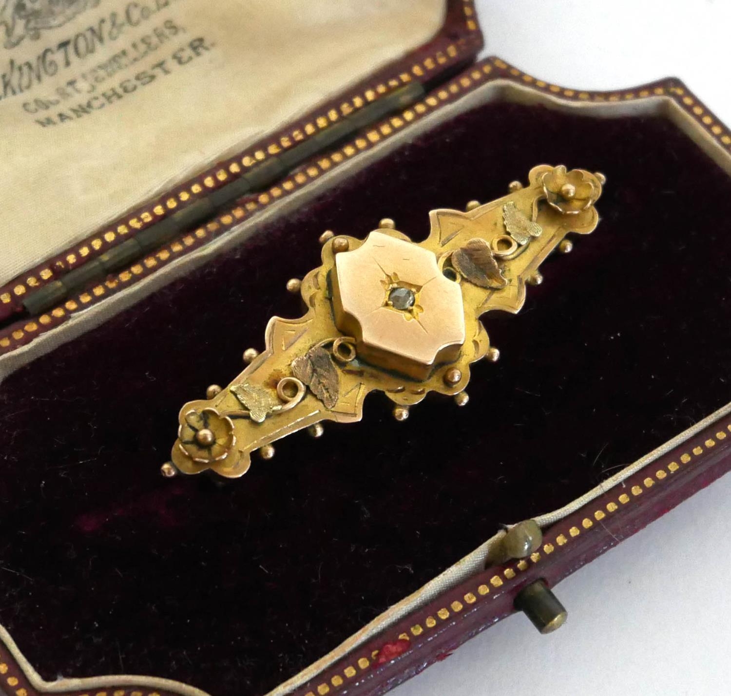 A 19TH CENTURY 9CT YELLOW GOLD BROOCH IN ORIGINAL BOX