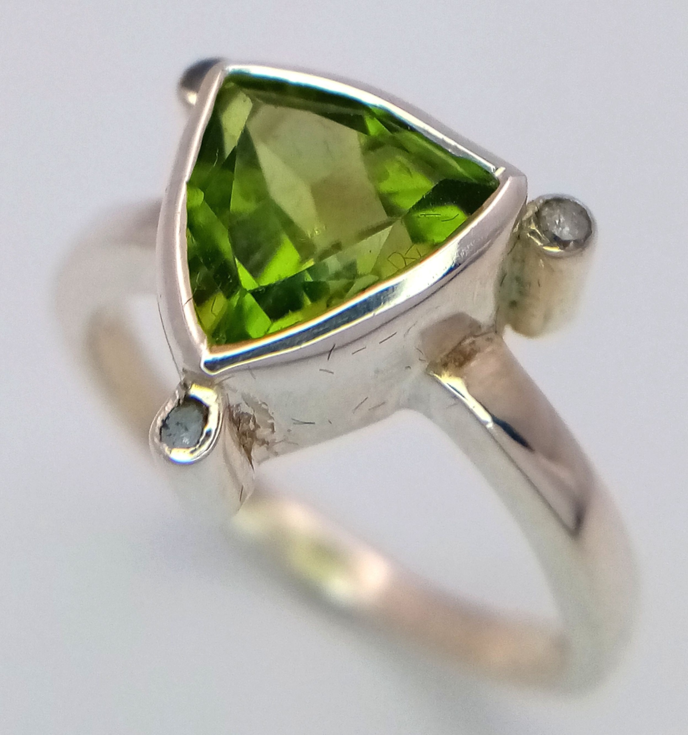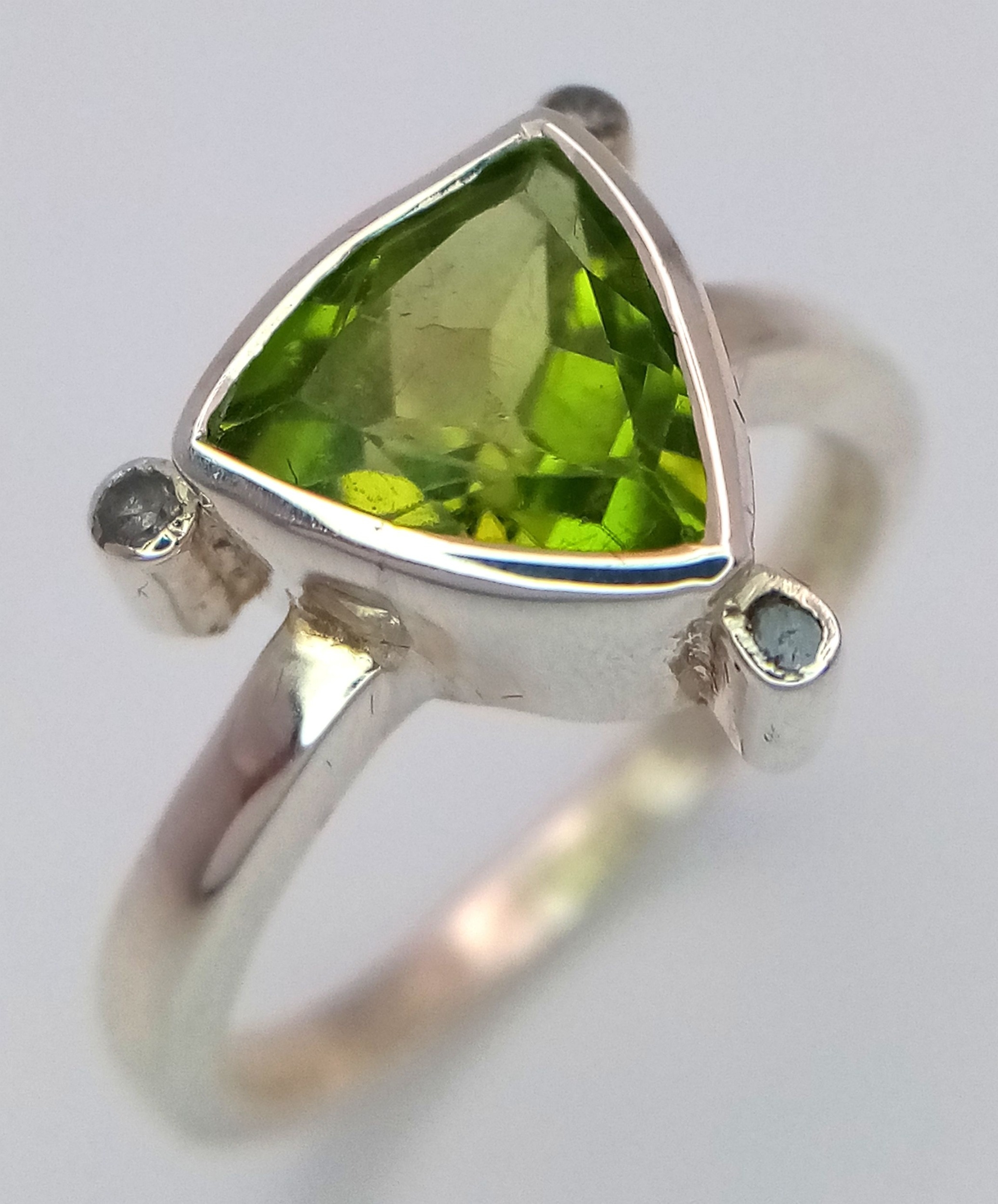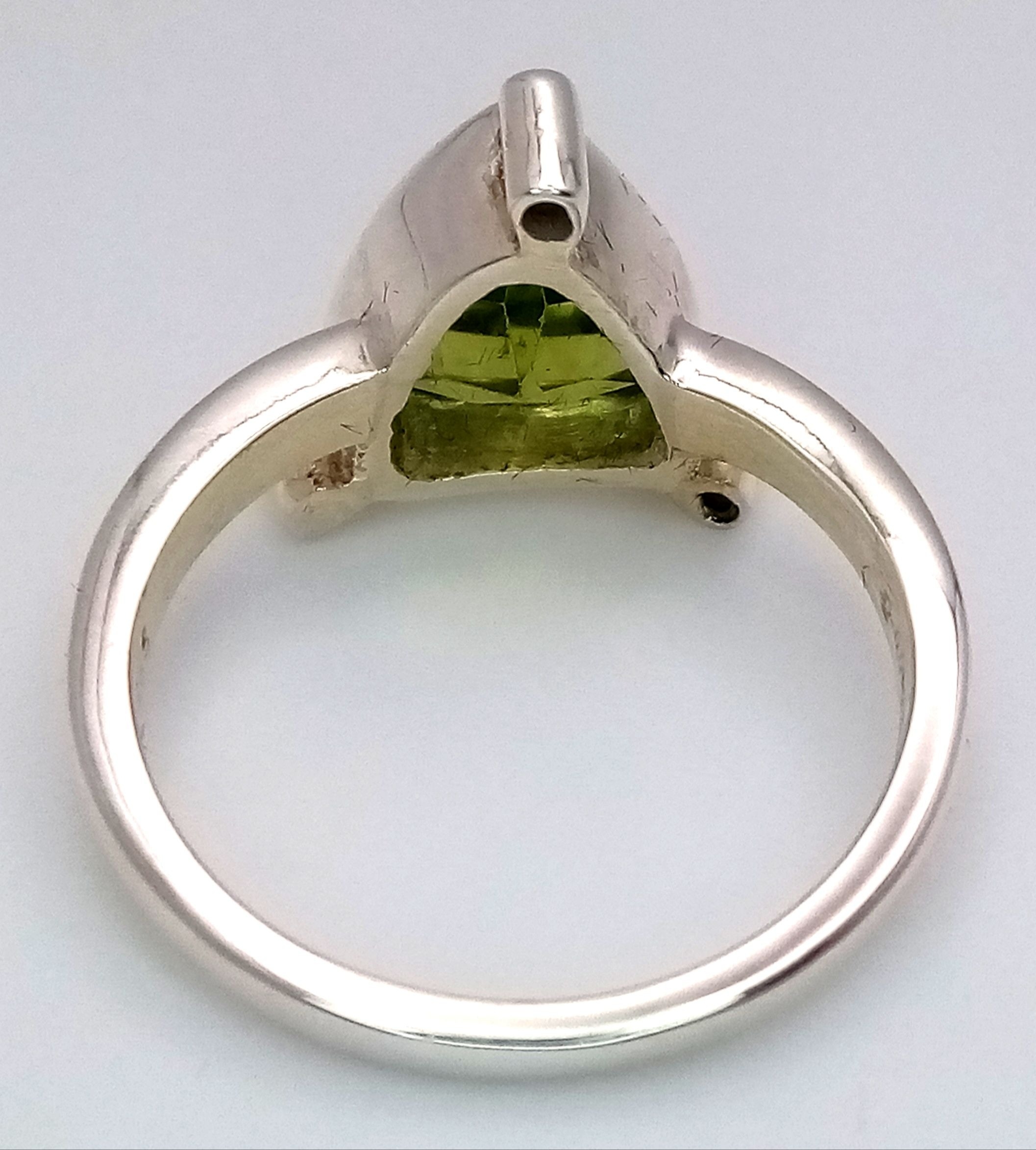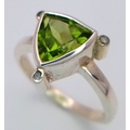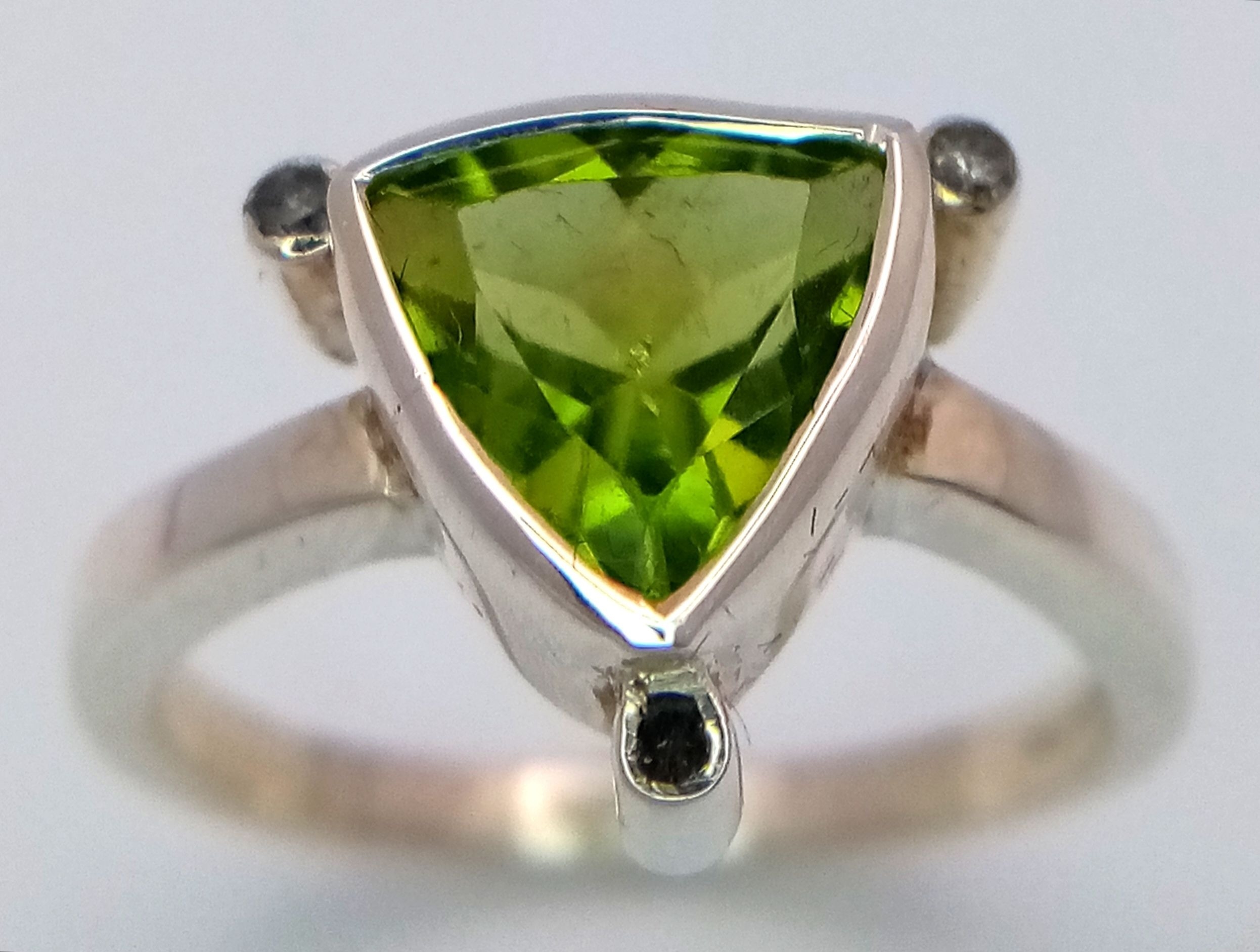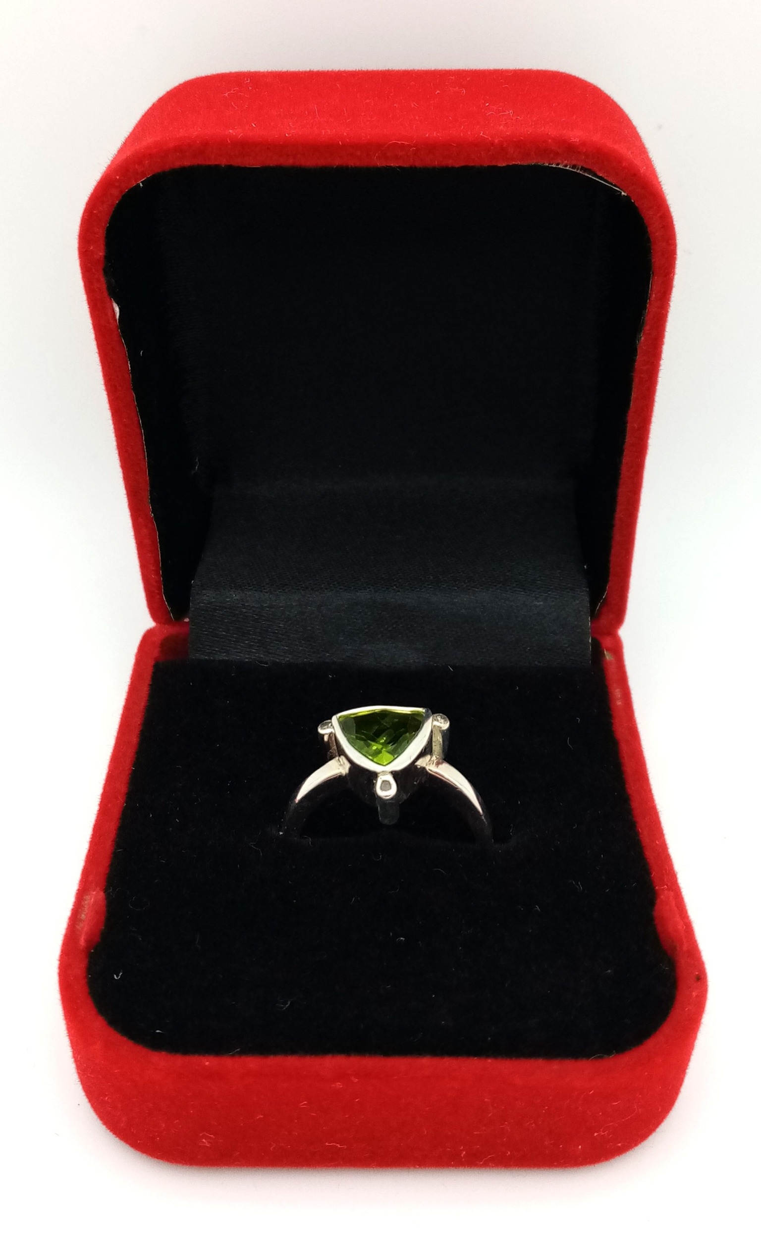 A 925 sterling silver ring featuring a vibrant green peridot stone, size N, with a total weight of 3.8g. Comes with a presentation box.