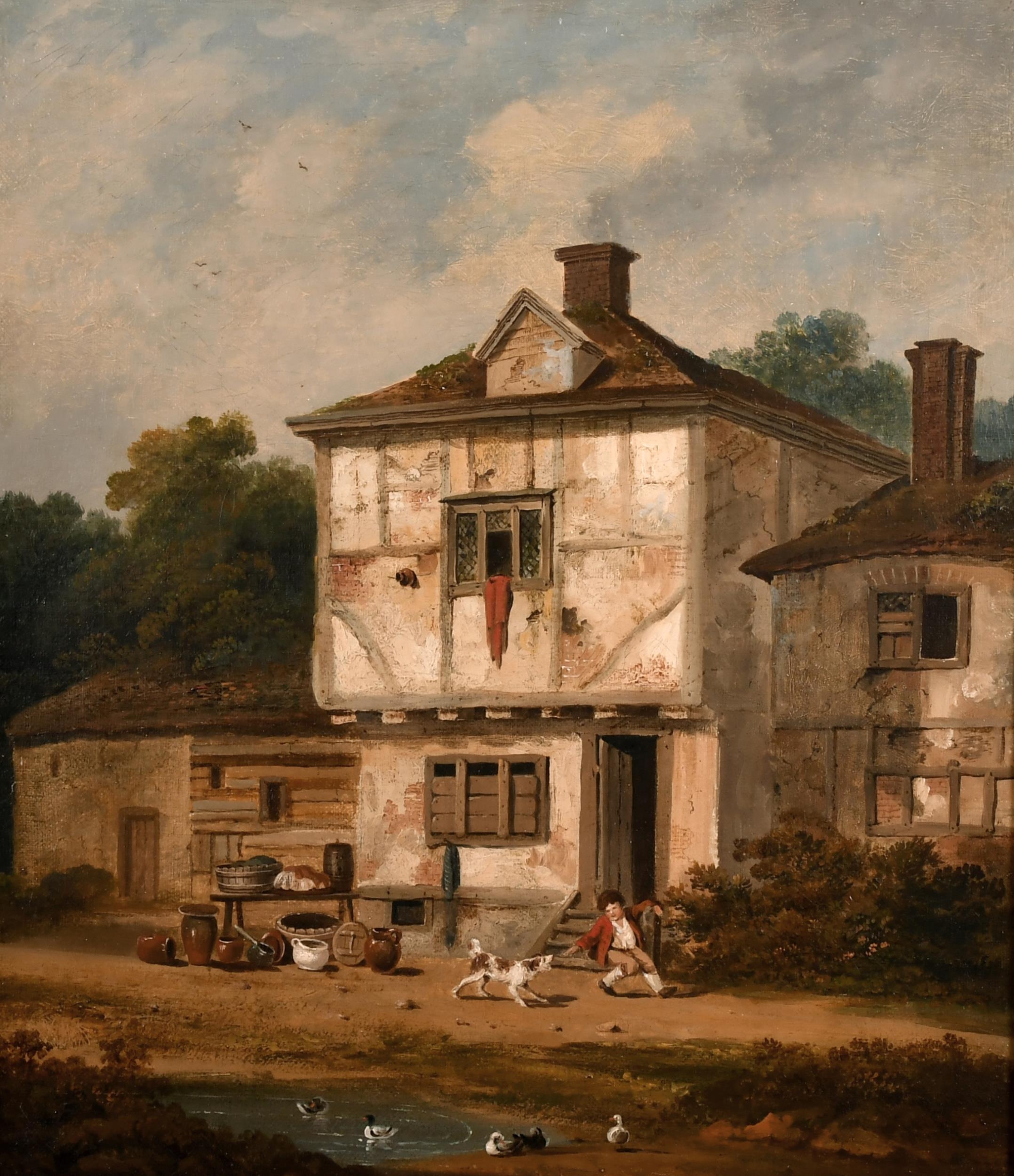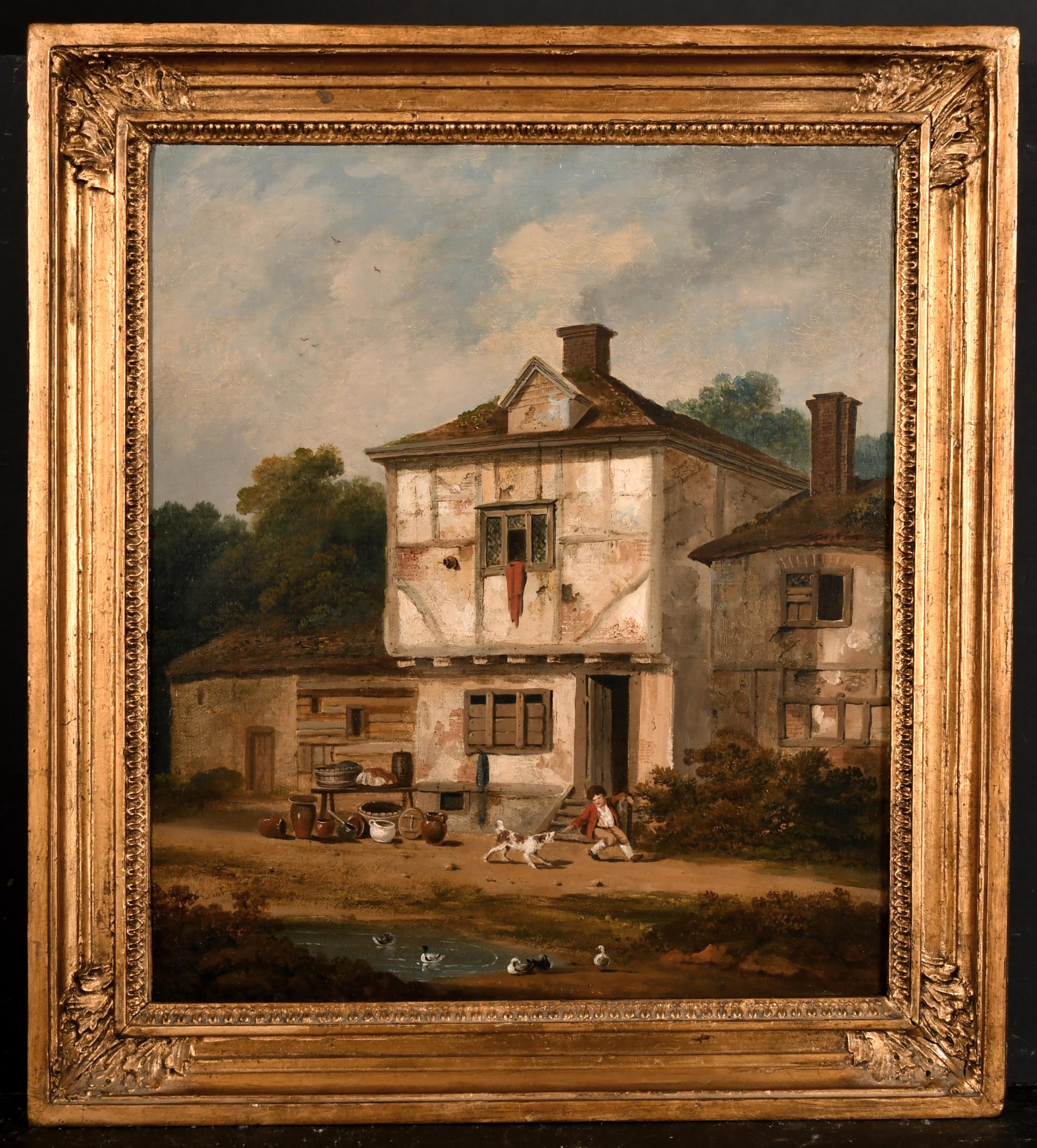 Michael Angelo Rooker (1743-1801) British. A Cottage Scene with a Young Boy playing with a Dog, Oil on Canvas, 16" x 13.75" (40.6 x 34.8cm)