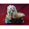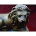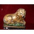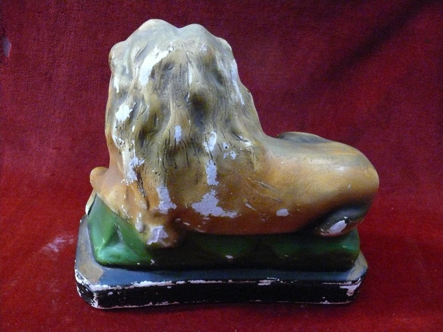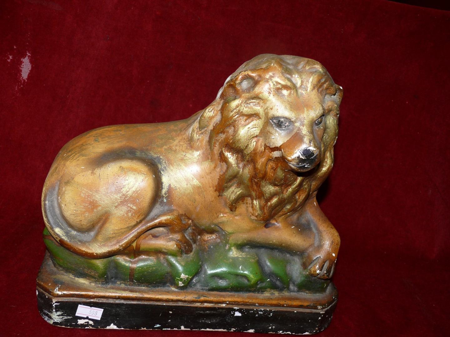 Early 20thC carnival chalkware statue of a recumbent lion. Approx 24cm tall.