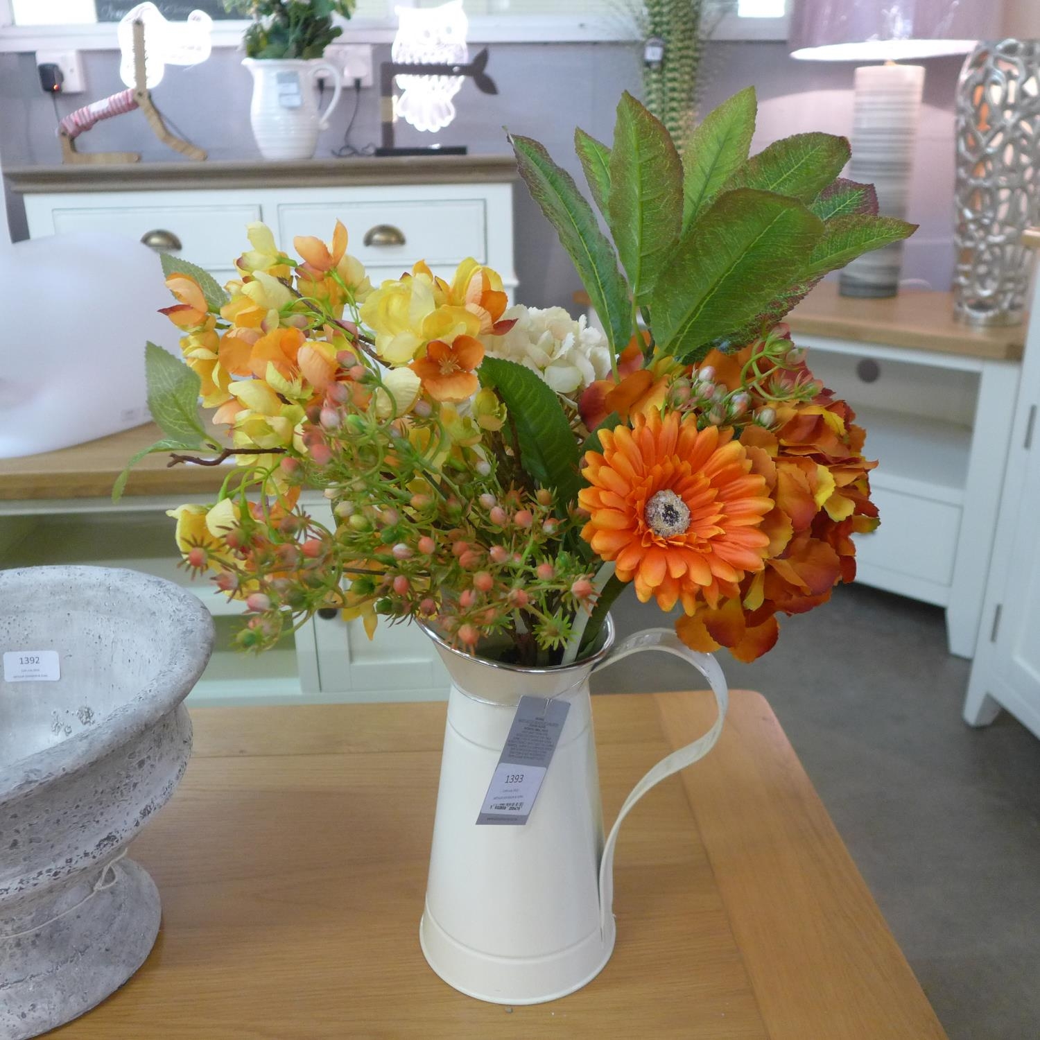 Hydrangeas and blossom in a cream enamel jug (55028313) #