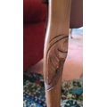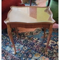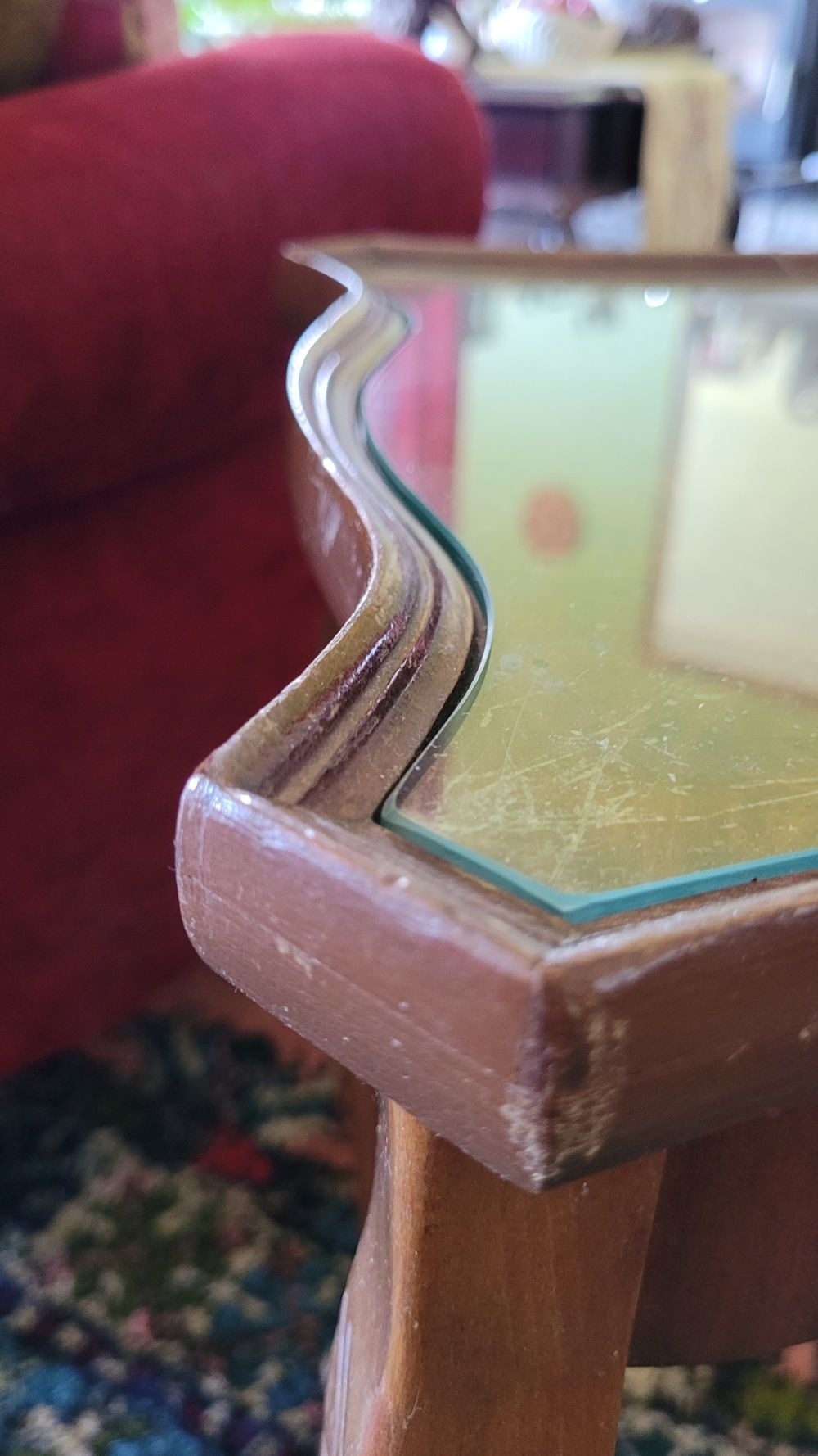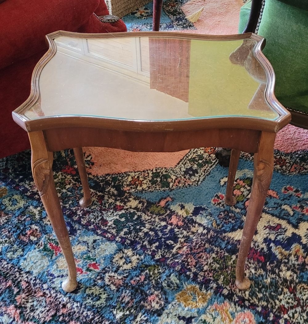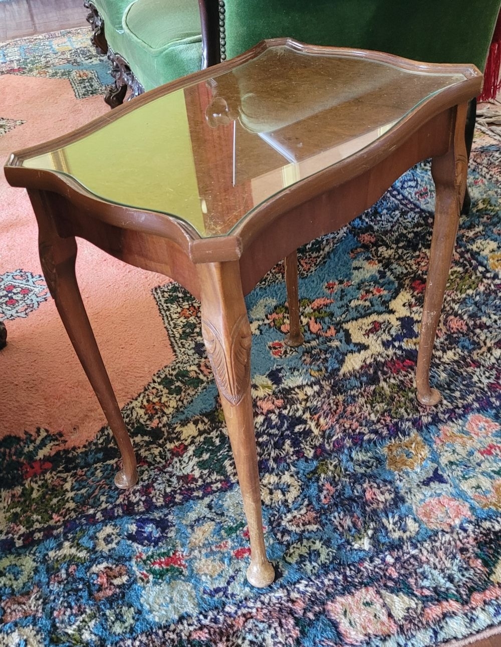 A NEATLY SIZED SERPENTINE SHAPED GLASS TOP SIDE / LAMP TABLE, the table top with shaped glass surface and burr wood beneath is raised on cabriole shape legs with carved foliage detail to the knees and pad foot. Dimensions: 48 x 42 x 53cm (W x D x H)