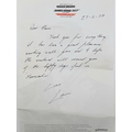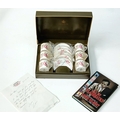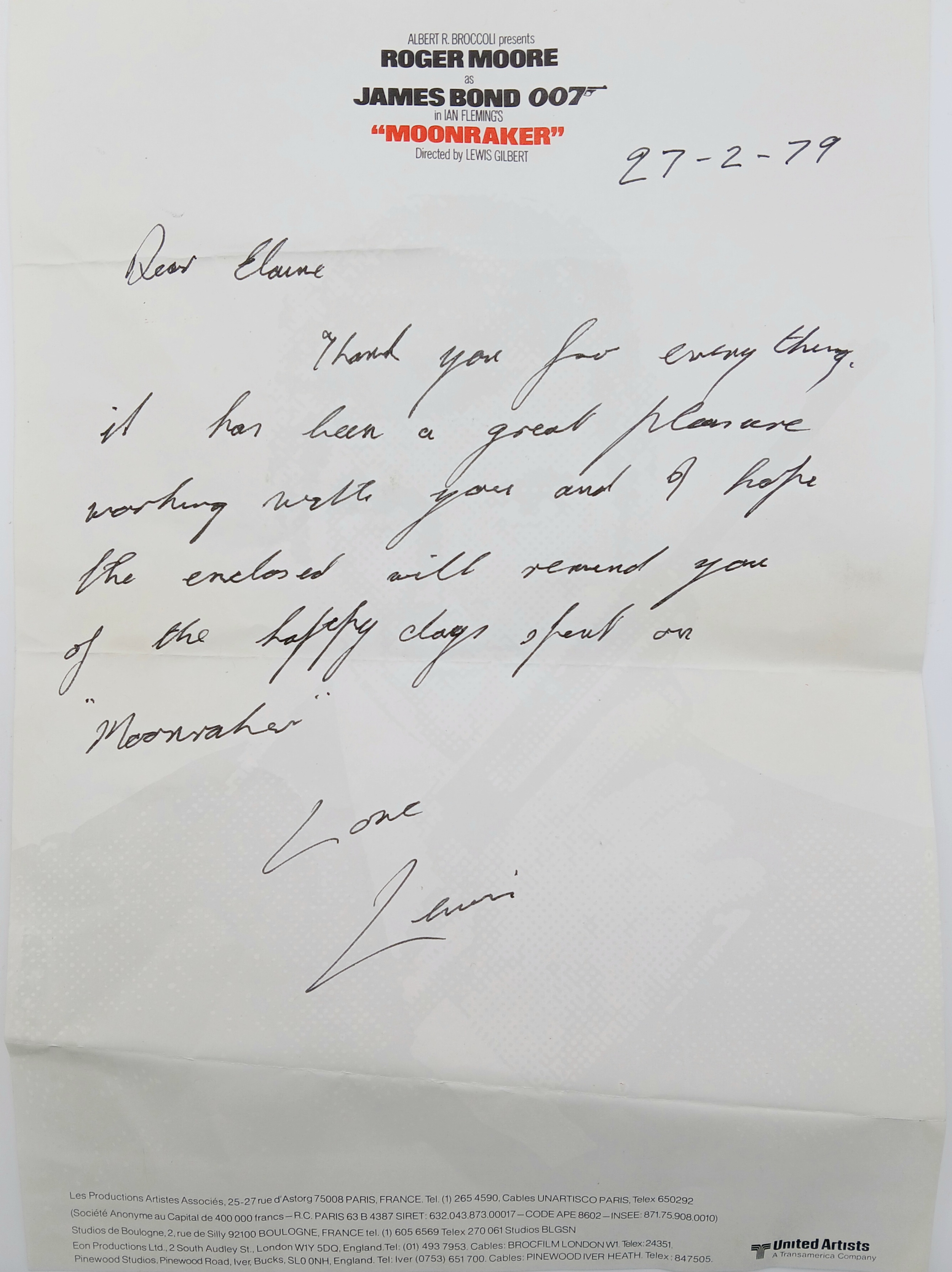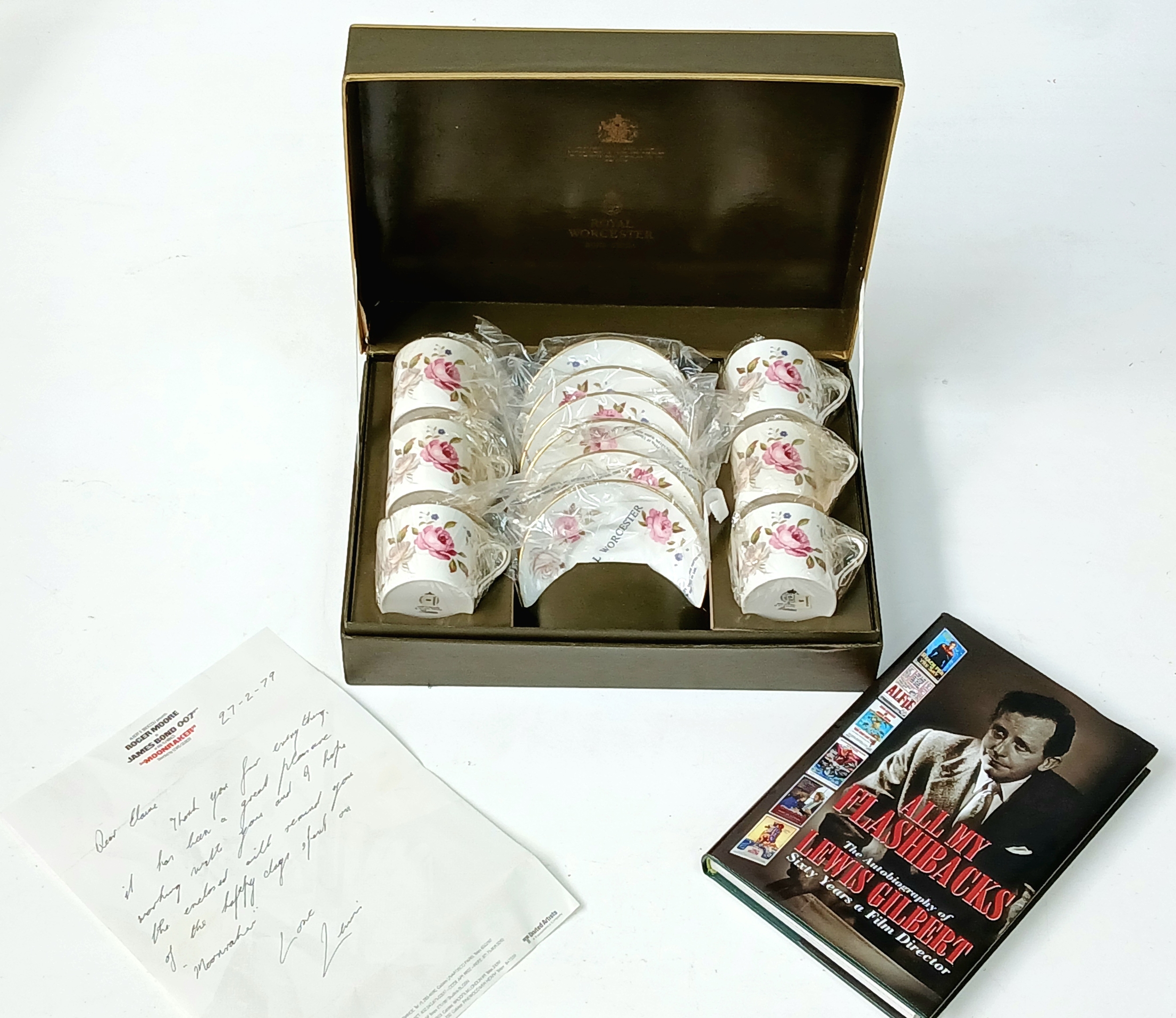 A Fascinating Gift From Acclaimed British Film Director Lewis Gilbert to his Continuity Editor Elaine Schreyeck for her stellar work on the James Bond movie "Moonraker". Includes a handwritten thank-you note on James Bond, Moonraker Letter headed paper and a signed copy of his autobiography "All my Flashbacks" PLUS a 12 Piece Royal Worcester Bone China Coffee cups and Saucers Set - Still unused in their plastic wrapping!