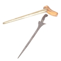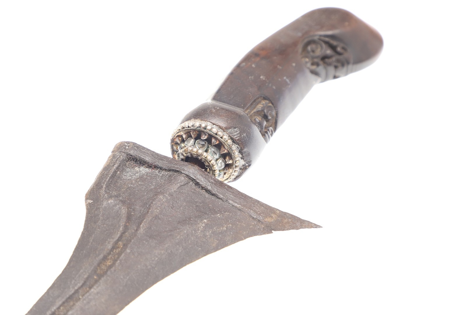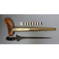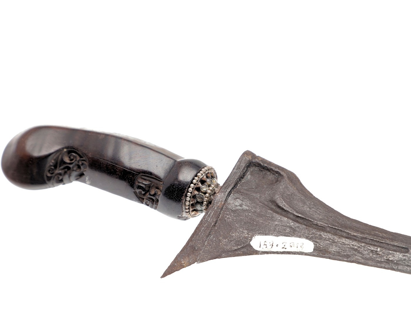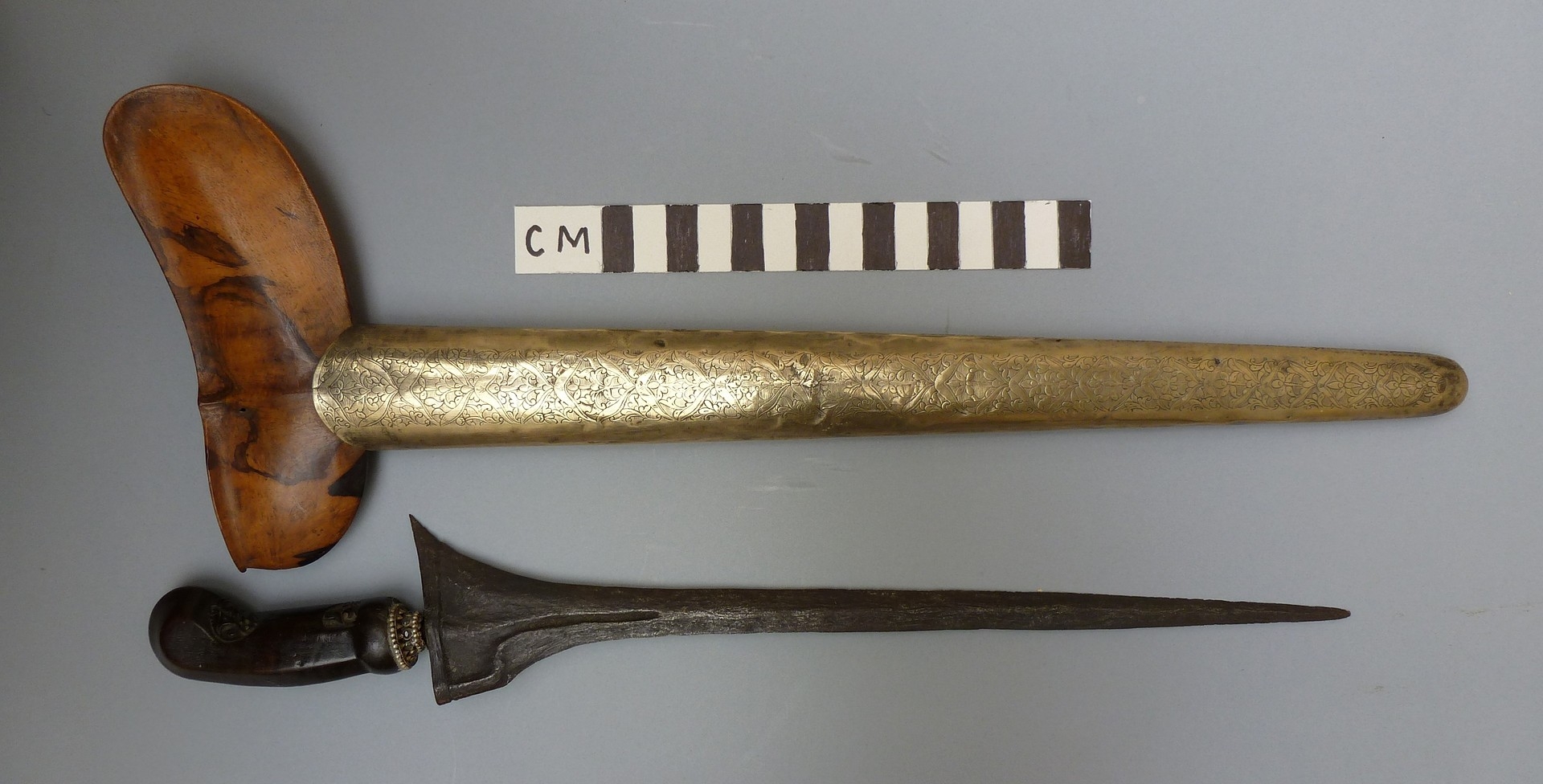 A 19TH CENTURY 'JEWEL' MOUNTED JAVANESE KRIS AND SCABBARD. The 29 cm slender, straight edged blade with pronounced pamor. The hilt of Java type, with rough cut 'white stones', the scabbard with a pendok of a light alloy of copper chassed with scrolling floral patterns. 47 cm. "This Kris has a very interesting blade which could be of considerable age".