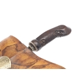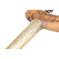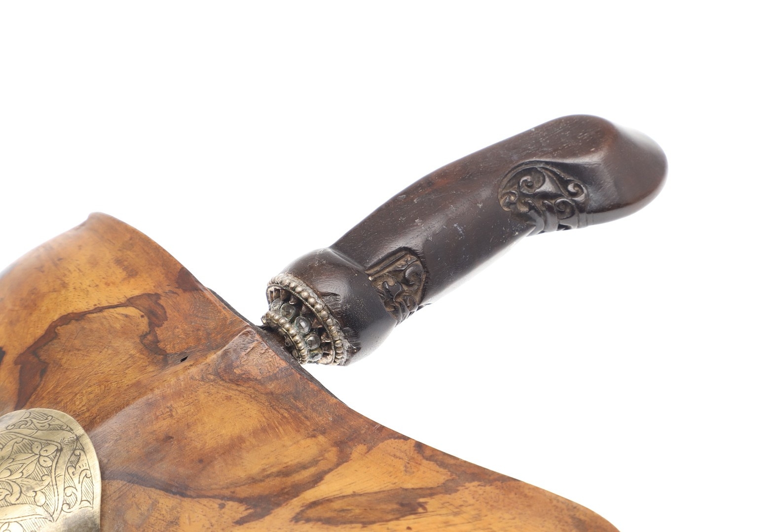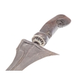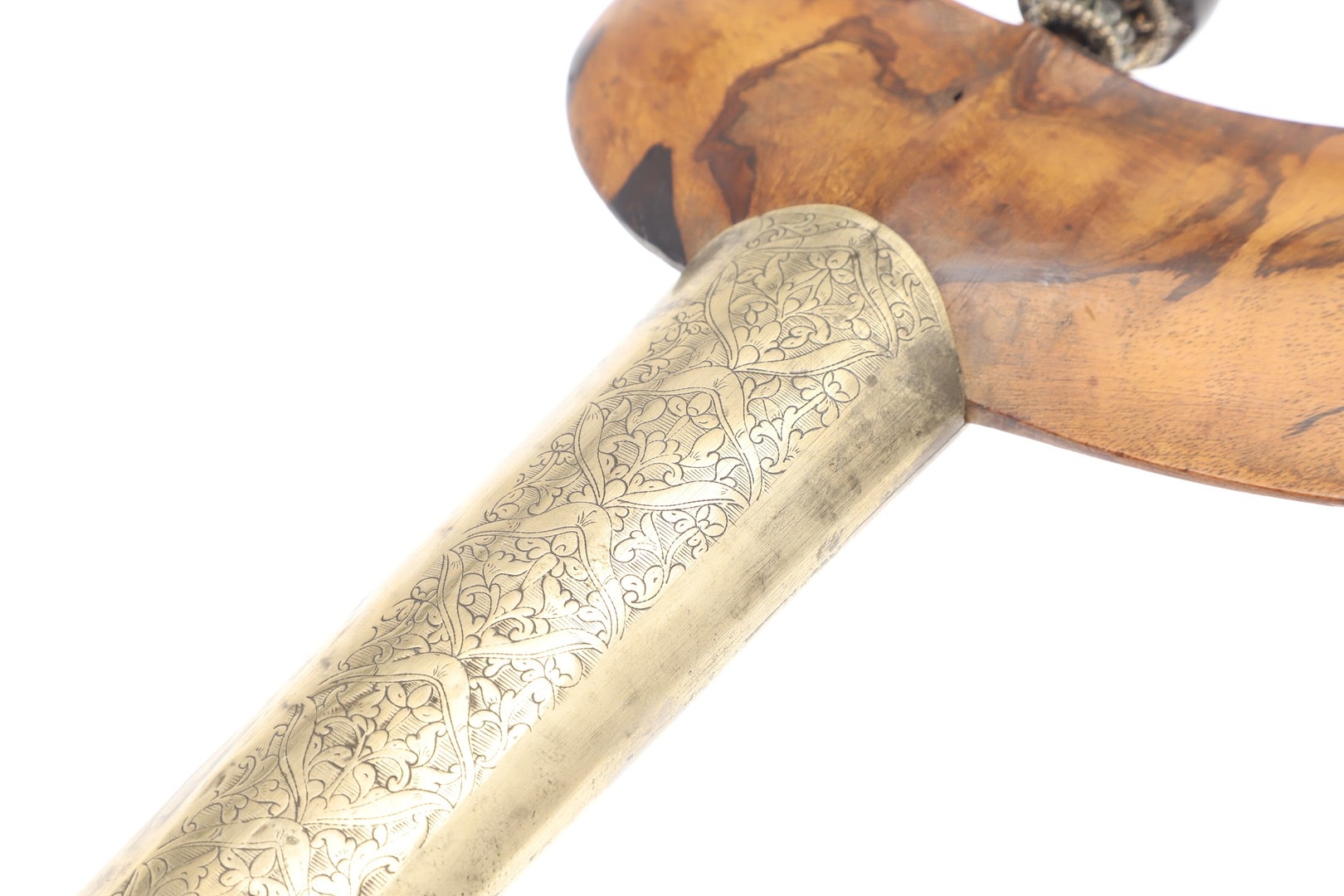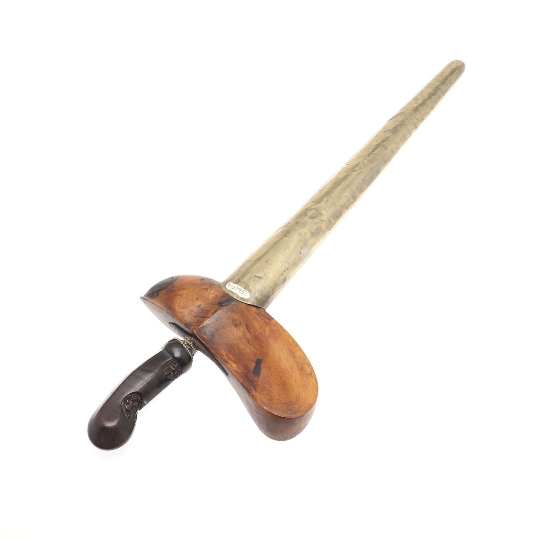 A 19TH CENTURY 'JEWEL' MOUNTED JAVANESE KRIS AND SCABBARD. The 29 cm slender, straight edged blade with pronounced pamor. The hilt of Java type, with rough cut 'white stones', the scabbard with a pendok of a light alloy of copper chassed with scrolling floral patterns. 47 cm. "This Kris has a very interesting blade which could be of considerable age".