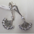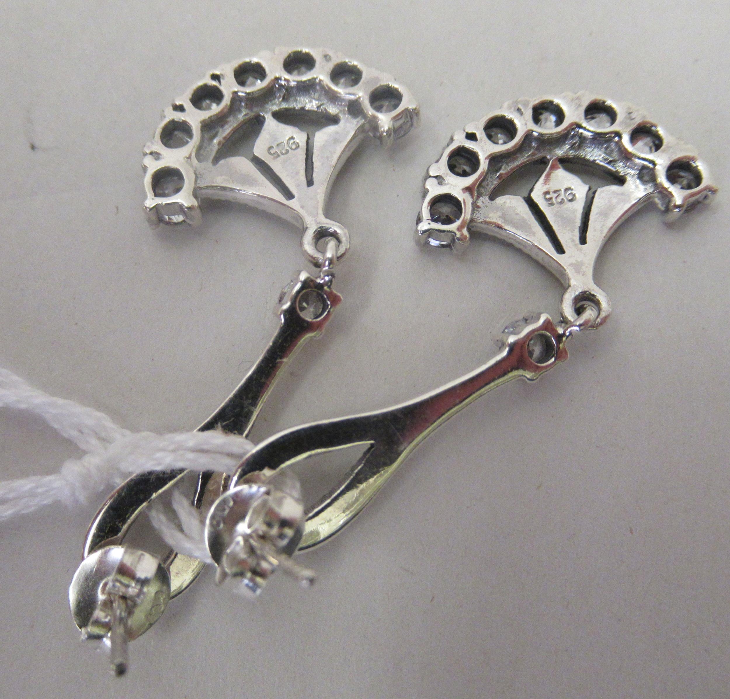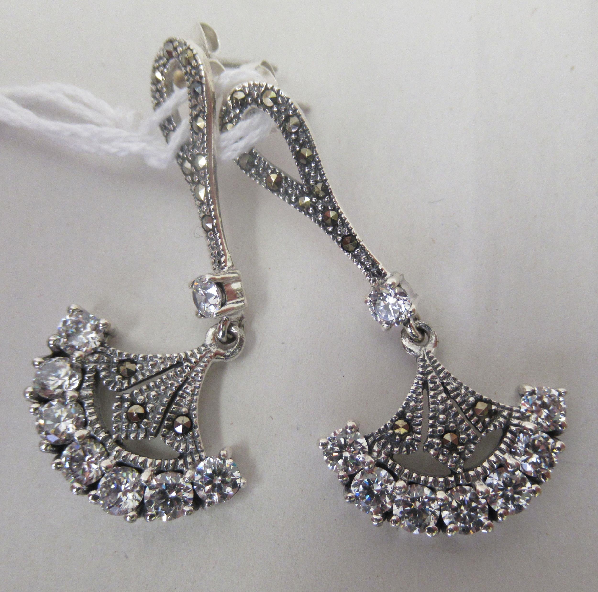A pair of Art Deco style silver coloured metal pendant earrings, set with marcasite and cubic zirconia