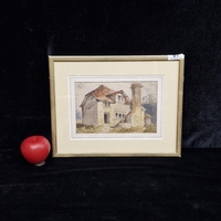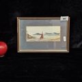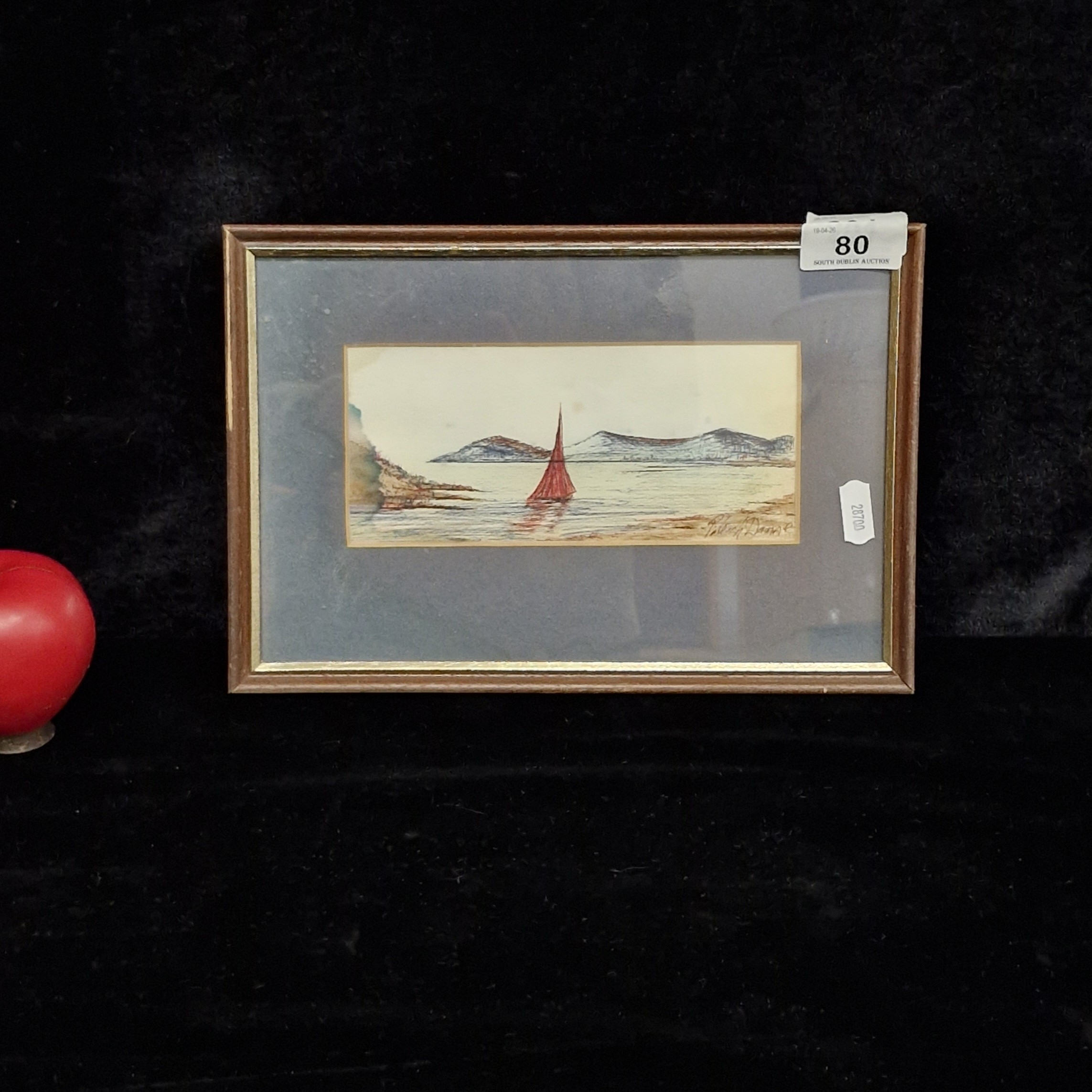A sweet original watercolour and felt pen on paper painting. Features a coastal nautical scene with sailing boats and mountains to distance. Rendered in loose brushstrokes with delicate highlights. Signed 'Pilch Danne' lower right. Housed in a wooden gilt frame behind glass.