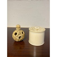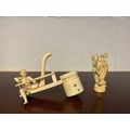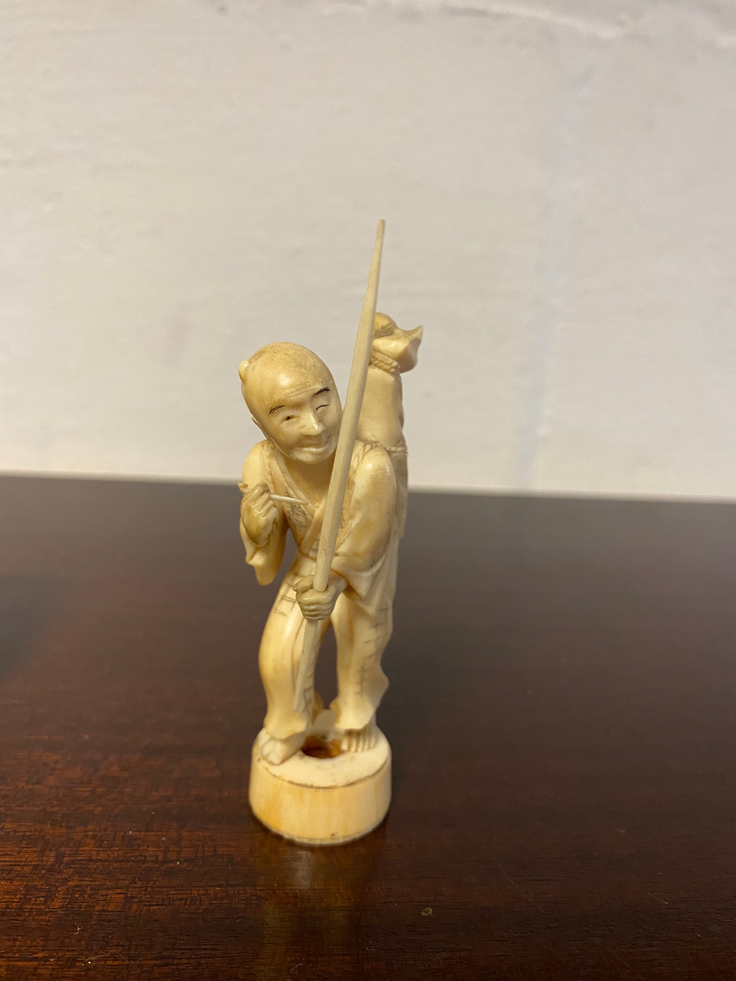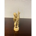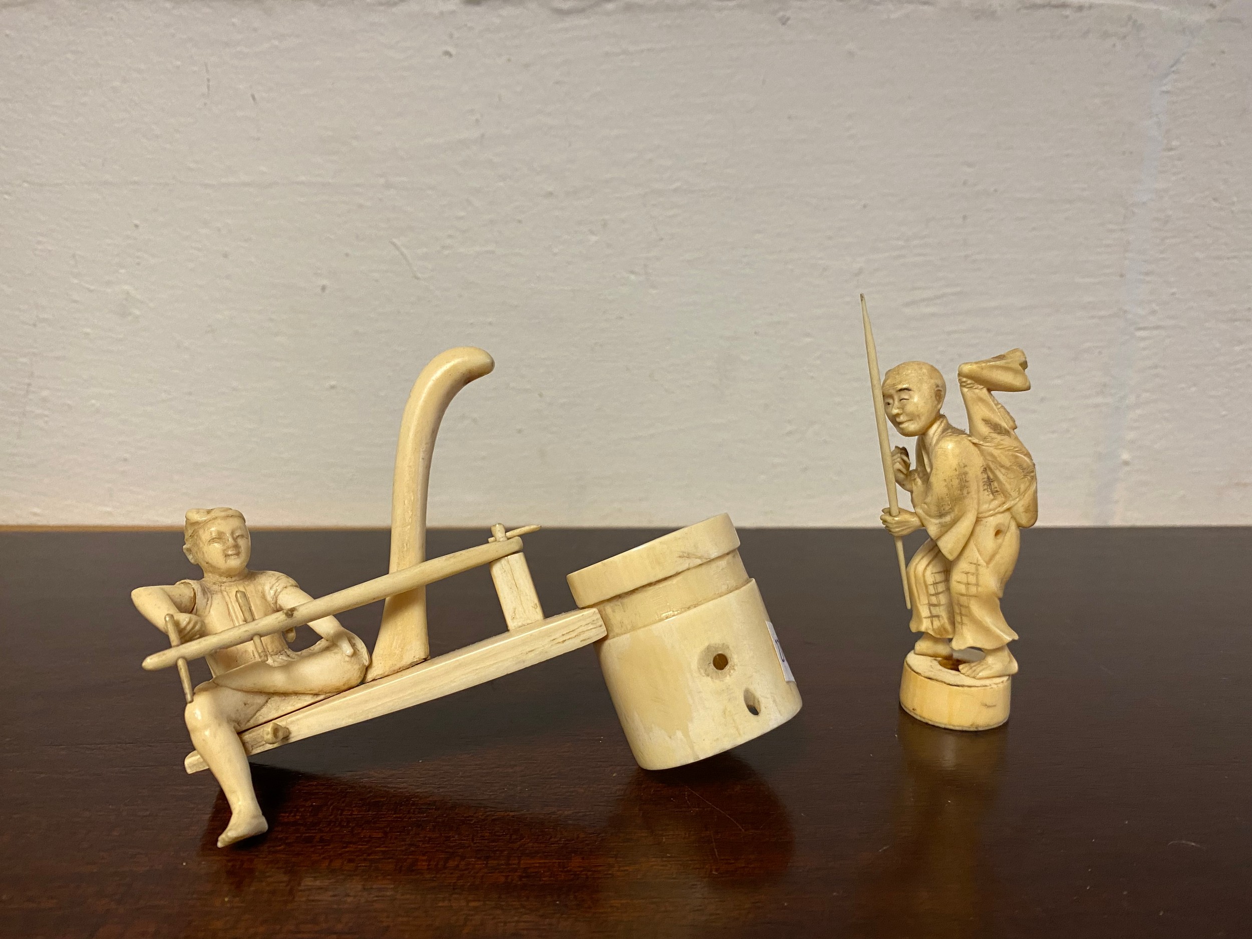 Two Japanese antique ivory okimono, of small size, the first depicting a walking man, the second a figure at a well (both a/f) -