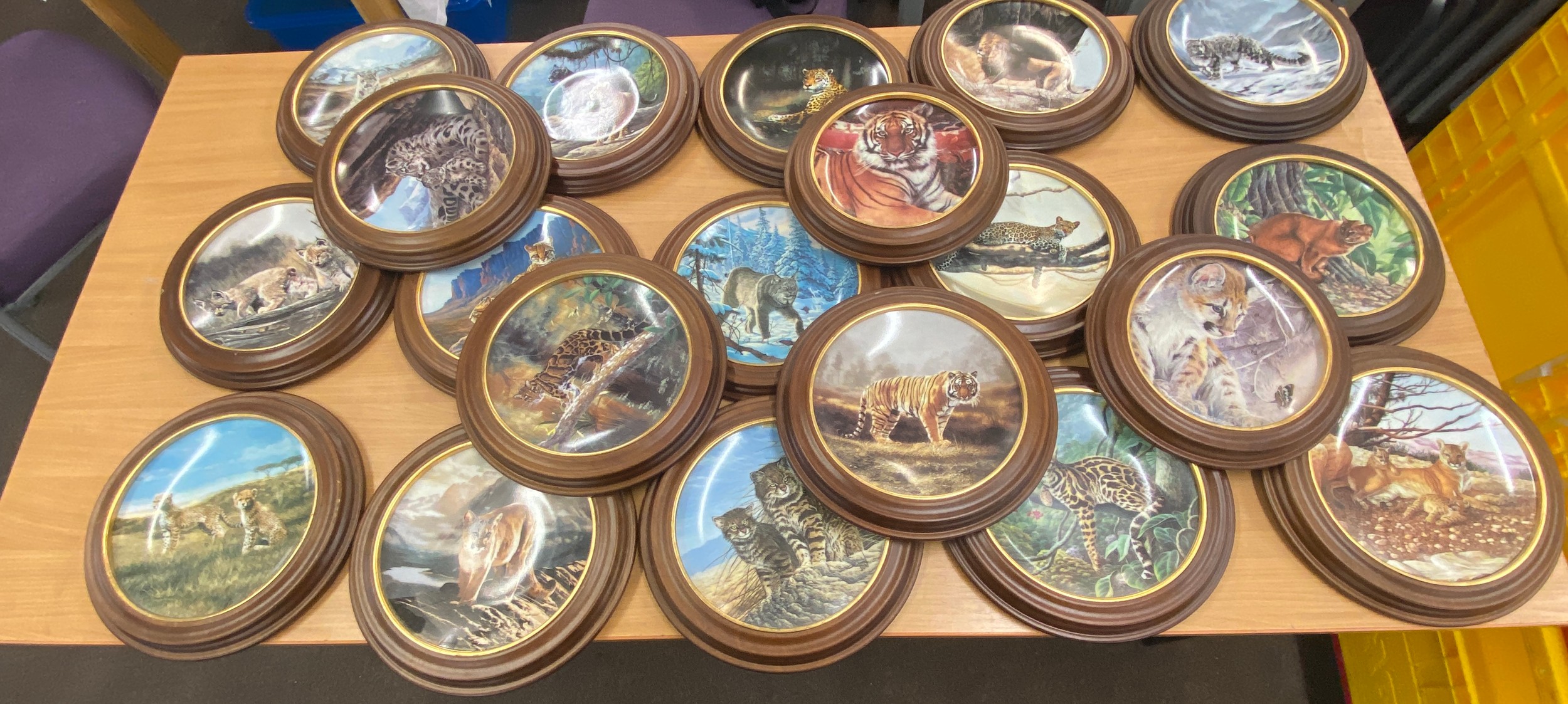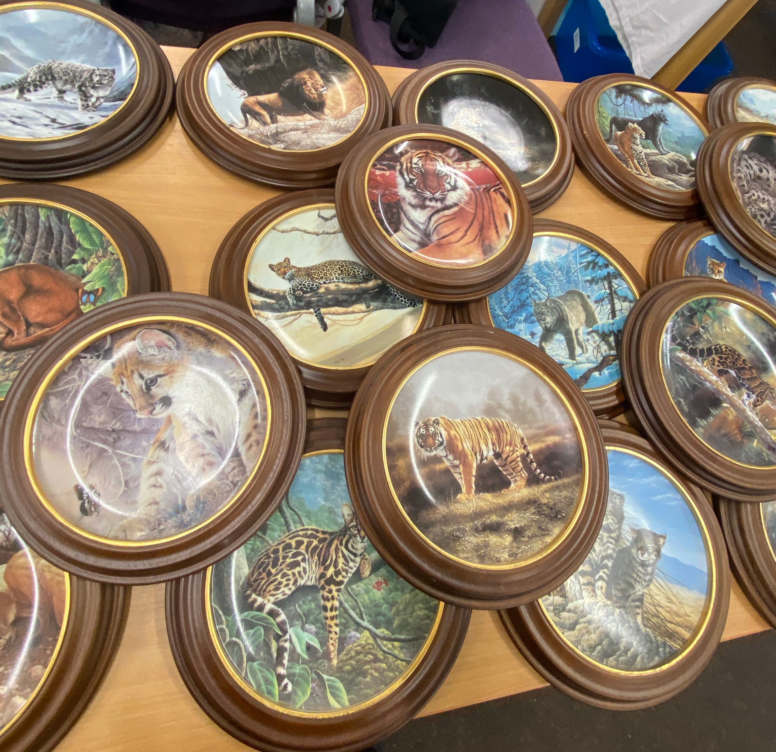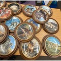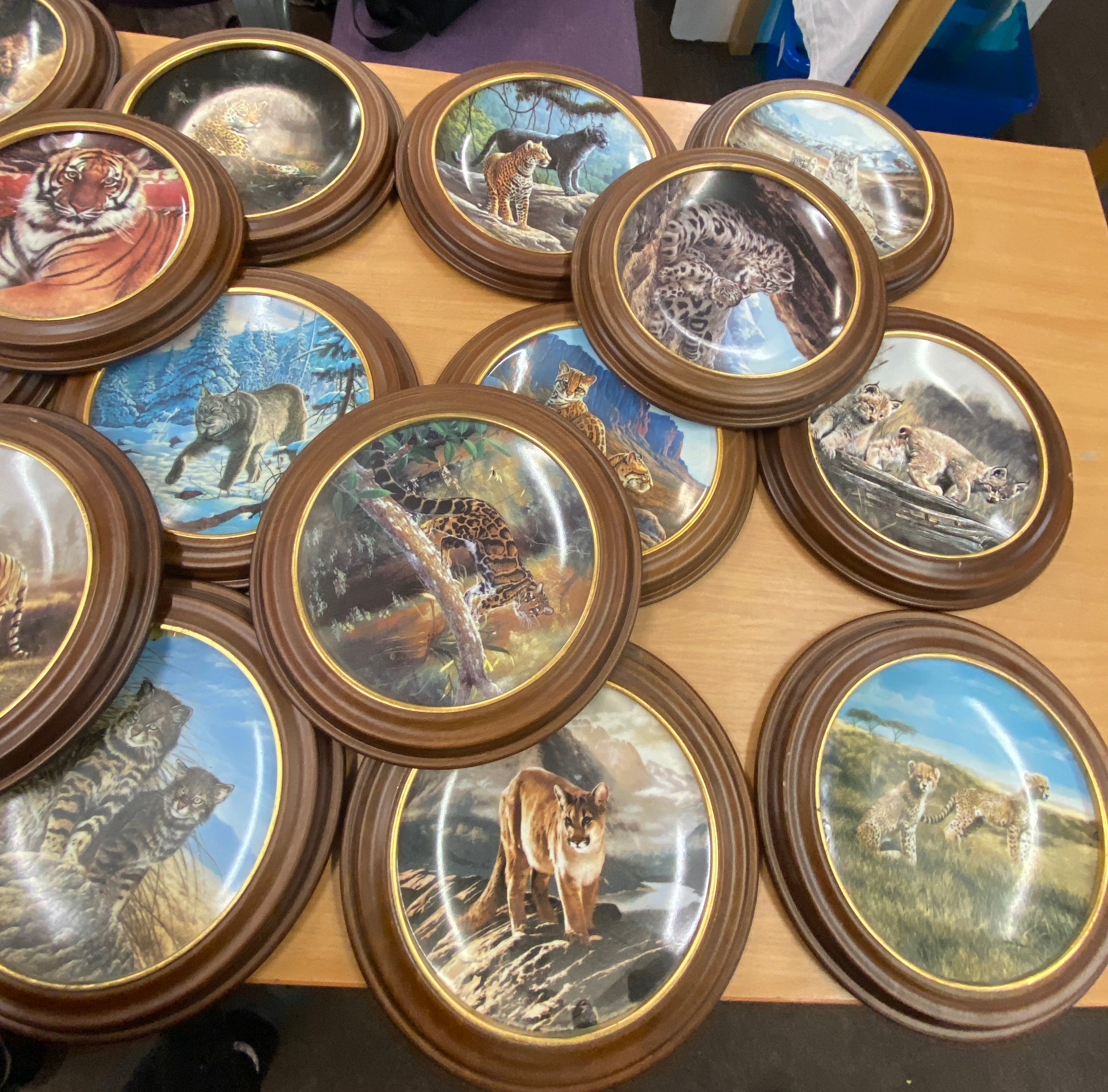 Large selection of wooden framed collectors plates includes Edwin E Knowles, Jaguar in the hills etc