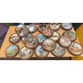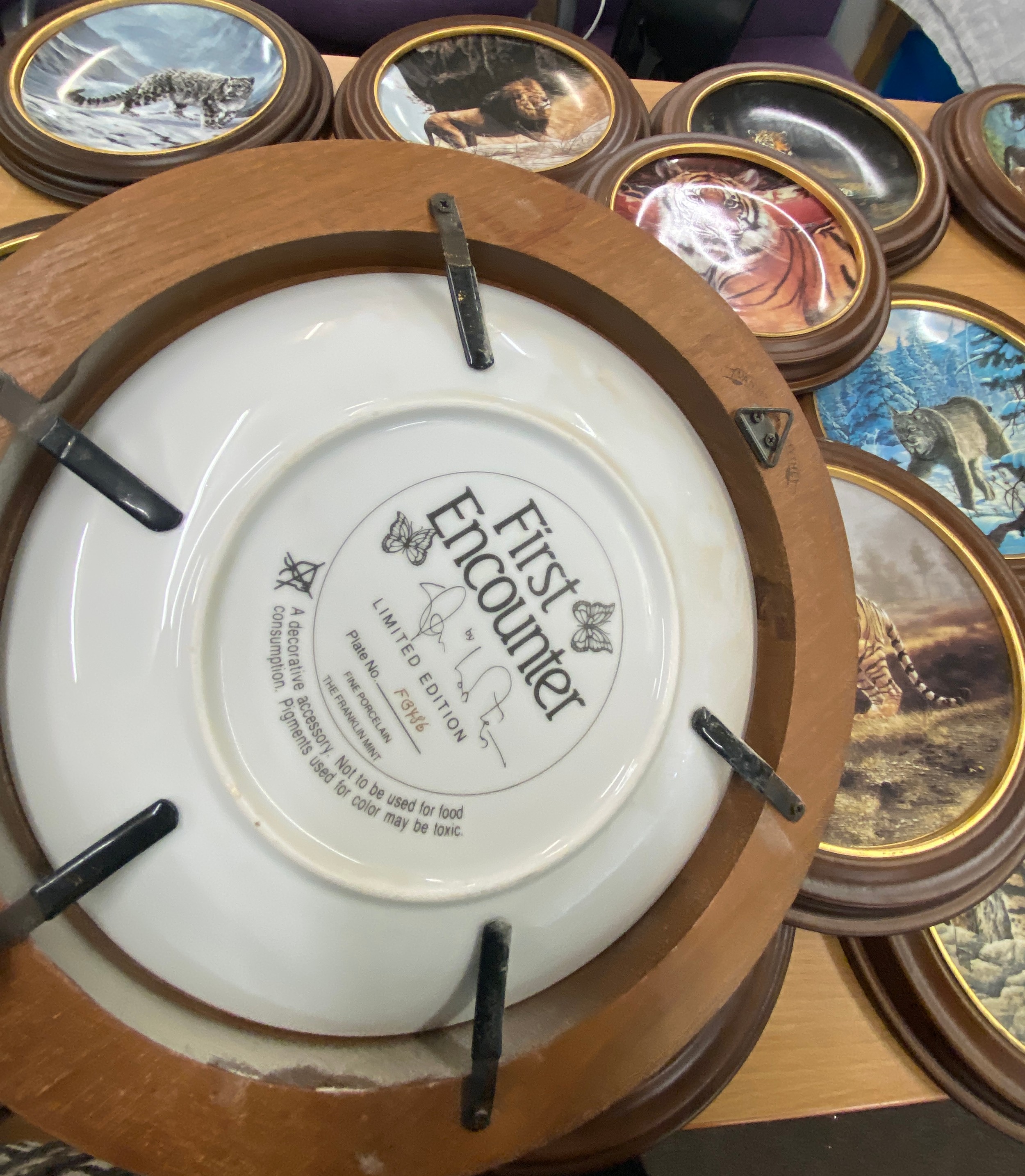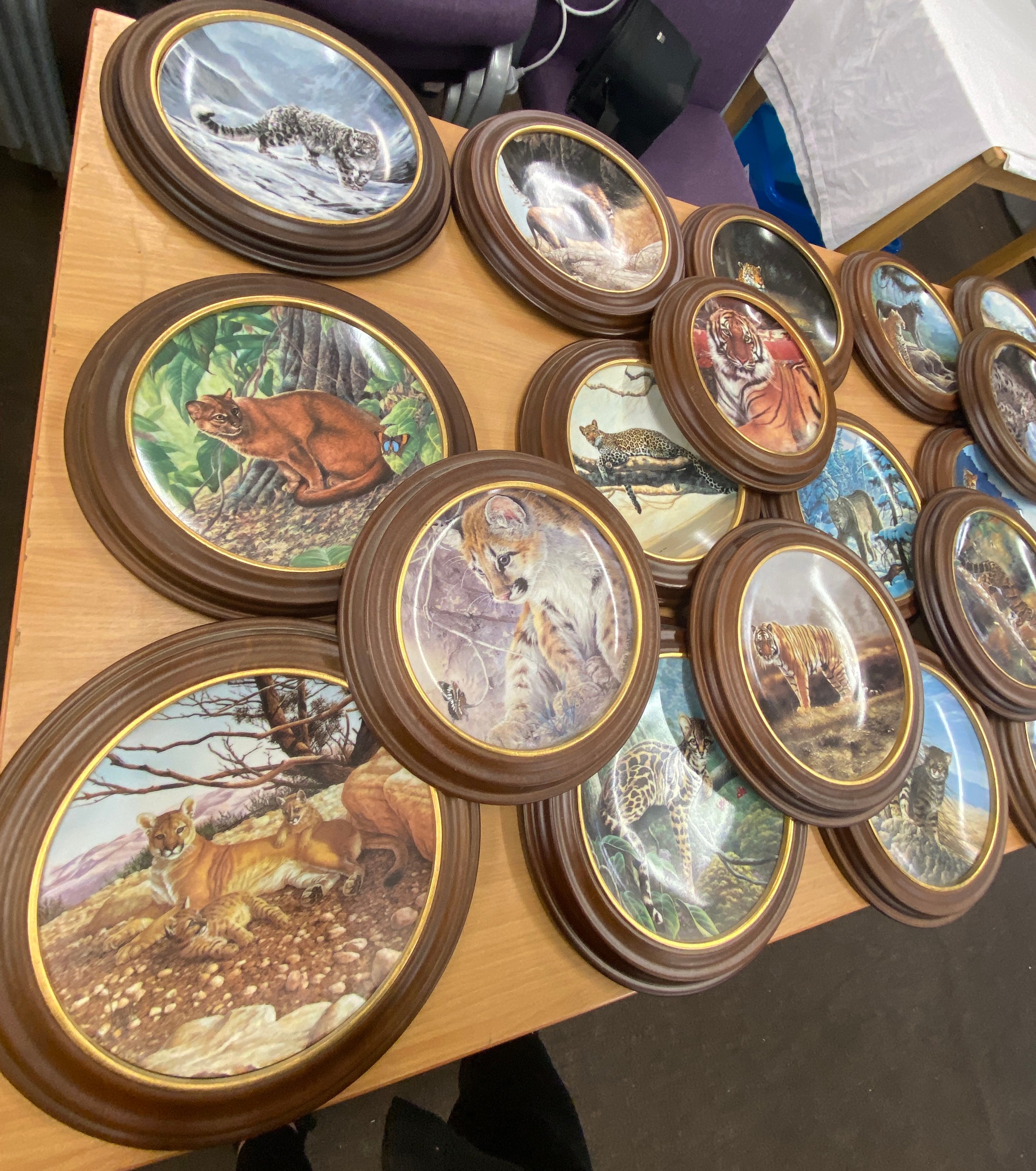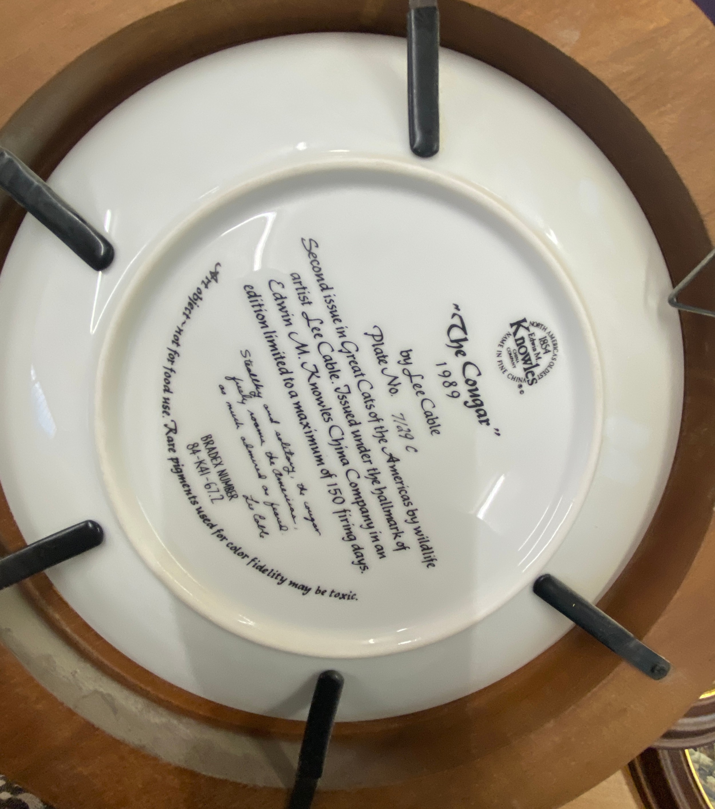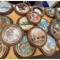 Large selection of wooden framed collectors plates includes Edwin E Knowles, Jaguar in the hills etc