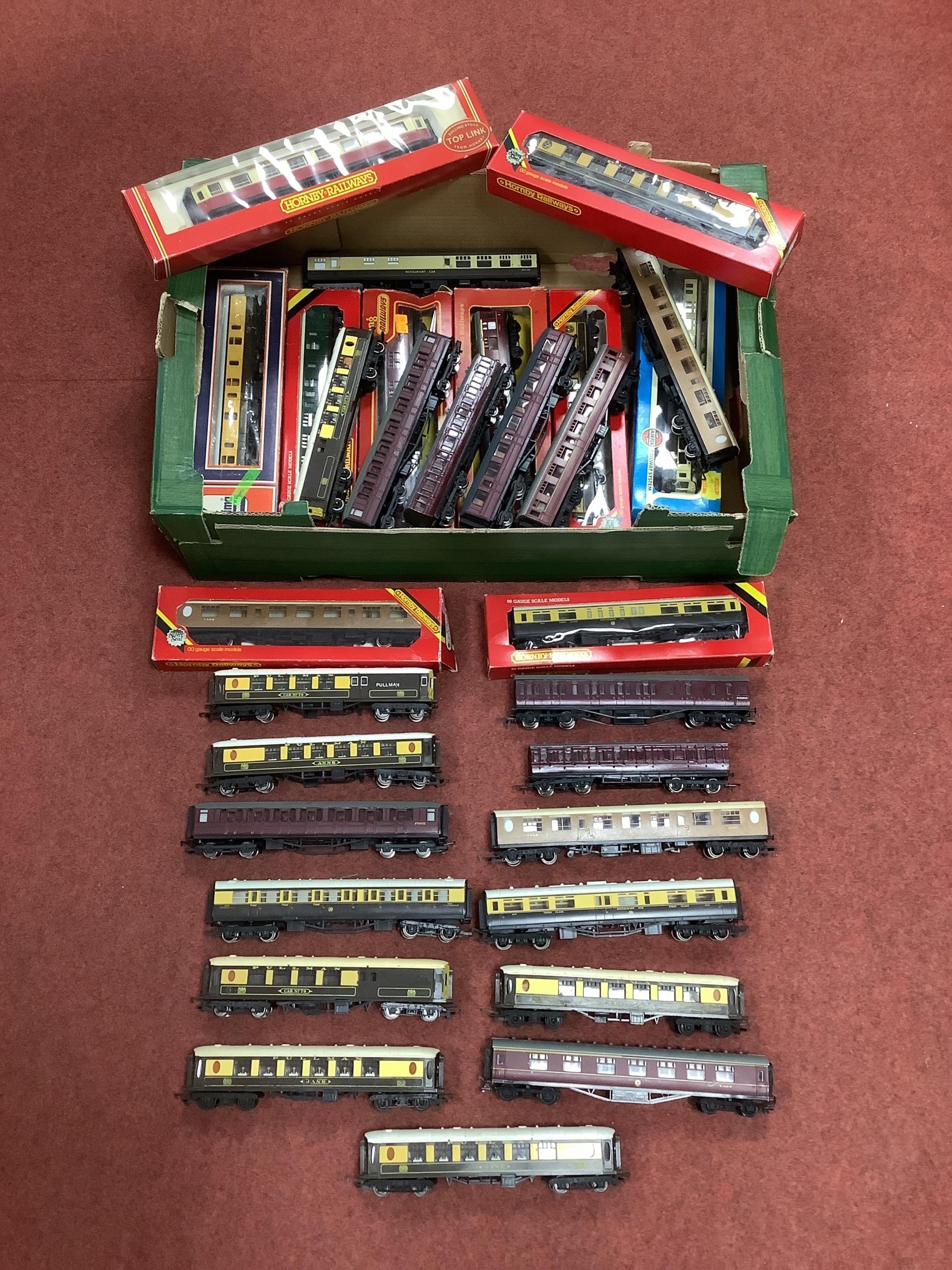 Approximately thirty 00 gauge coaches including ten boxed by Lima, Triang, Hornby and others, playworn.