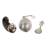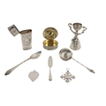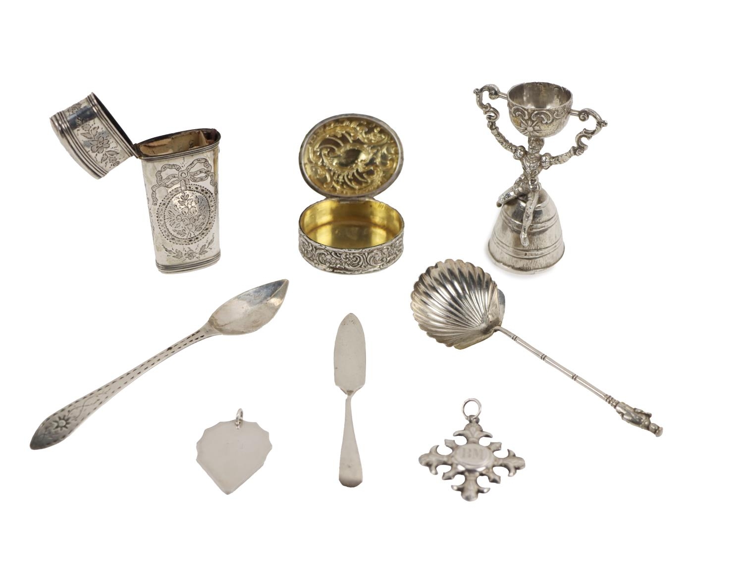 Silverware: An attractive etched design silver plated Etui, c. 1800; a miniature silver German Marriage Cup, Chester, Berthold Muller, 1902; a Chinese Export silver figural shell shaped Spoon, c. 1900; a Hanau silver gilt Pill Box, G. Dingeldein c. 1910; an early 19th Century silver Italian Coffee or Chocolate Spoon, c. 1818; a Queen Elizabeth Coronation Butter Knife; a silver 'walnut' Pick, London 1999, and an Italian white metal Medal, BM, as a lot. (1)