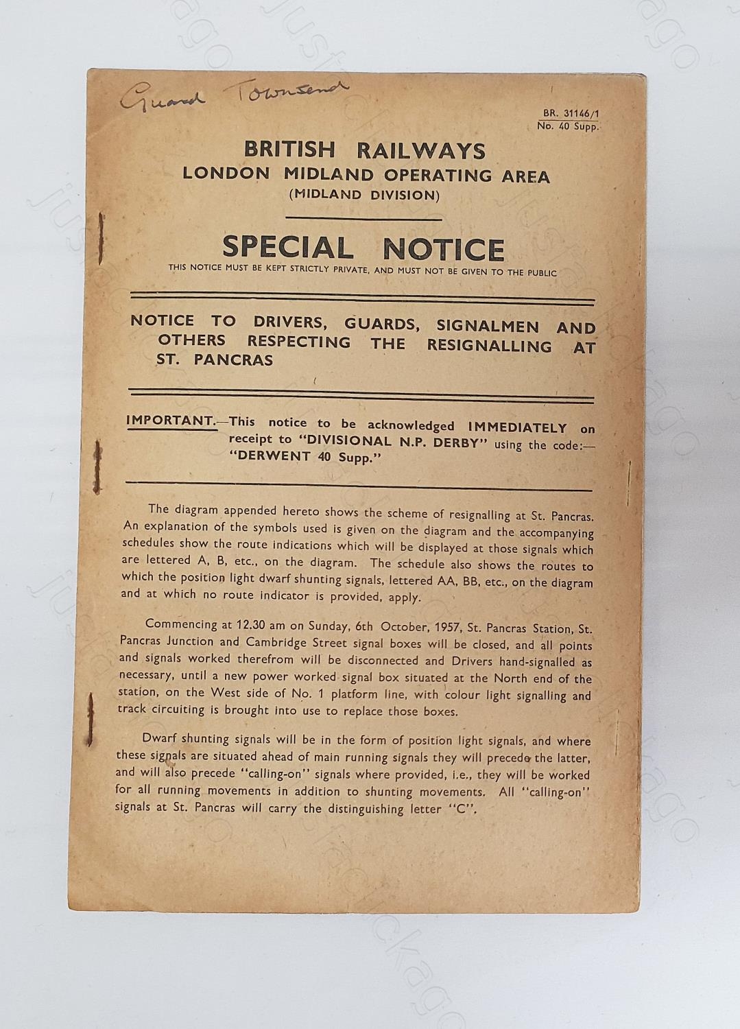 Railway. A B.R. London Midland Special Notice. 1957. 5 pages with good sized fold out signalling diagram of St Pancras station.
