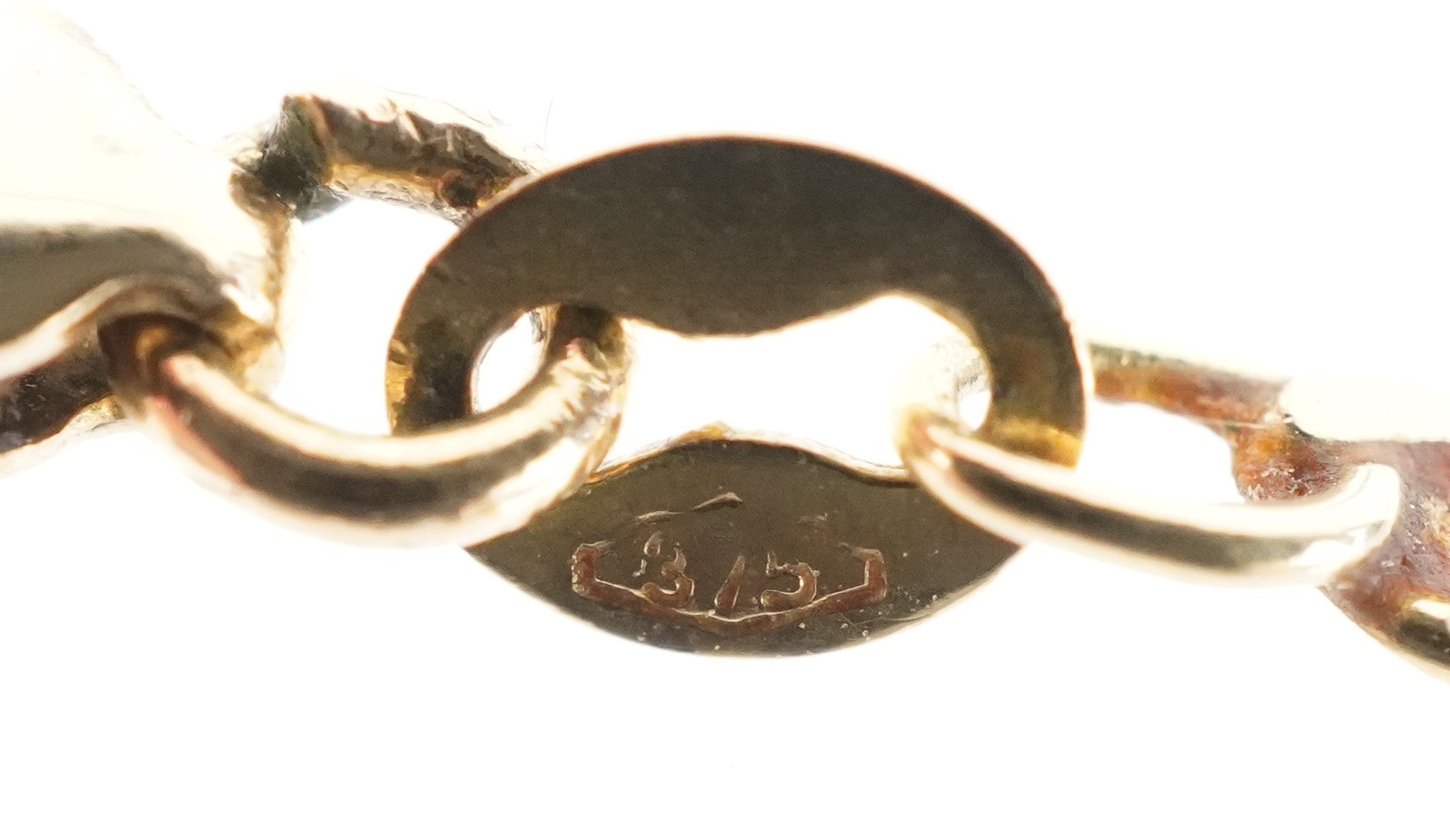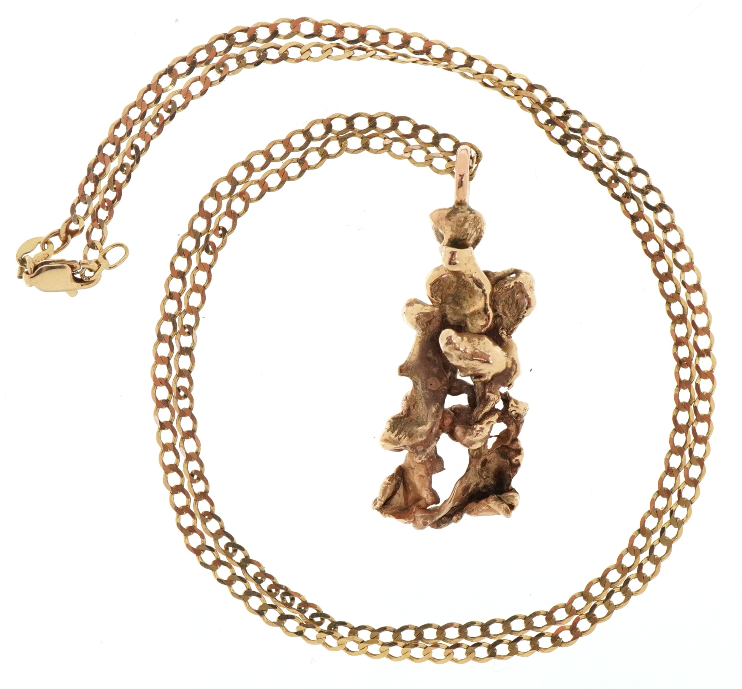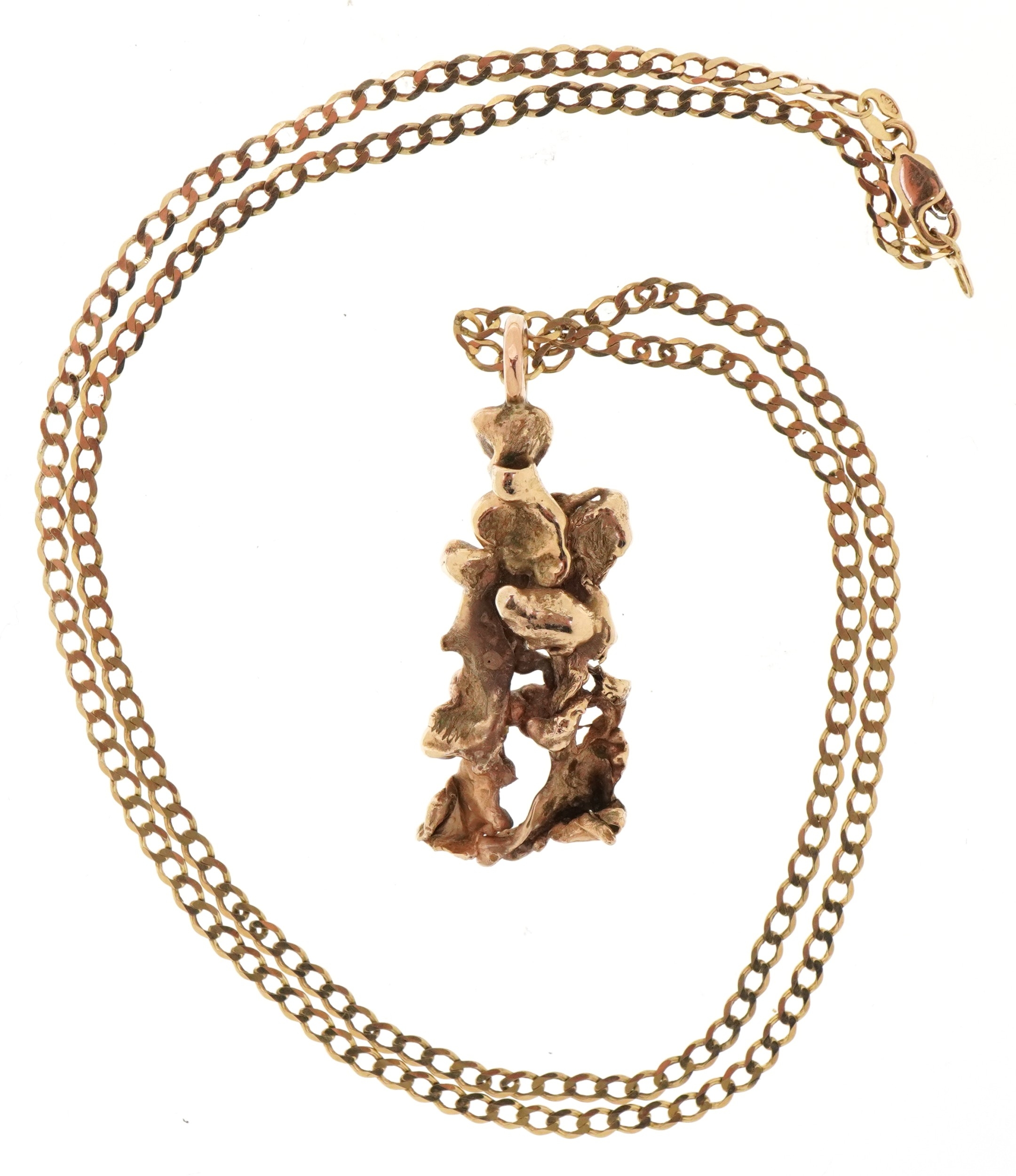 An unmarked gold naturalistic pendant, tests as 9ct gold, on a 9ct gold curb link necklace, 3.5cm high and 48cm in length, total 10.8g.