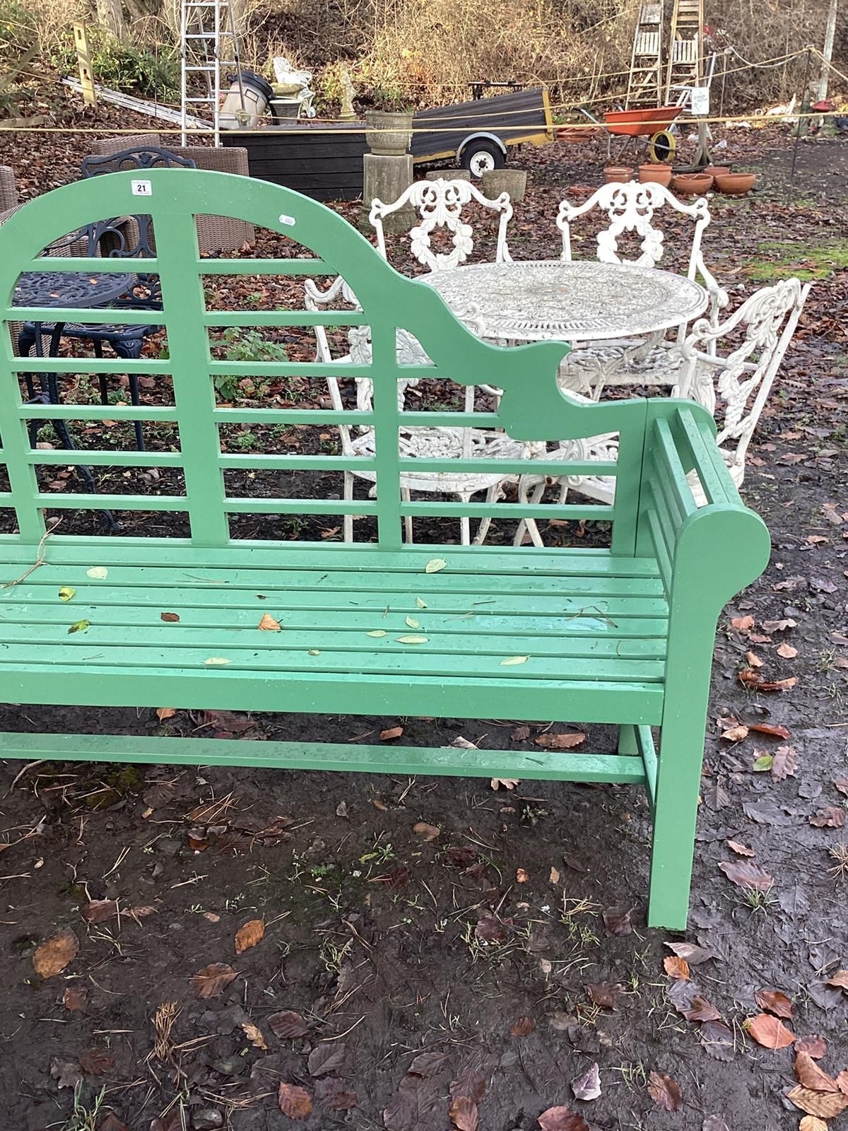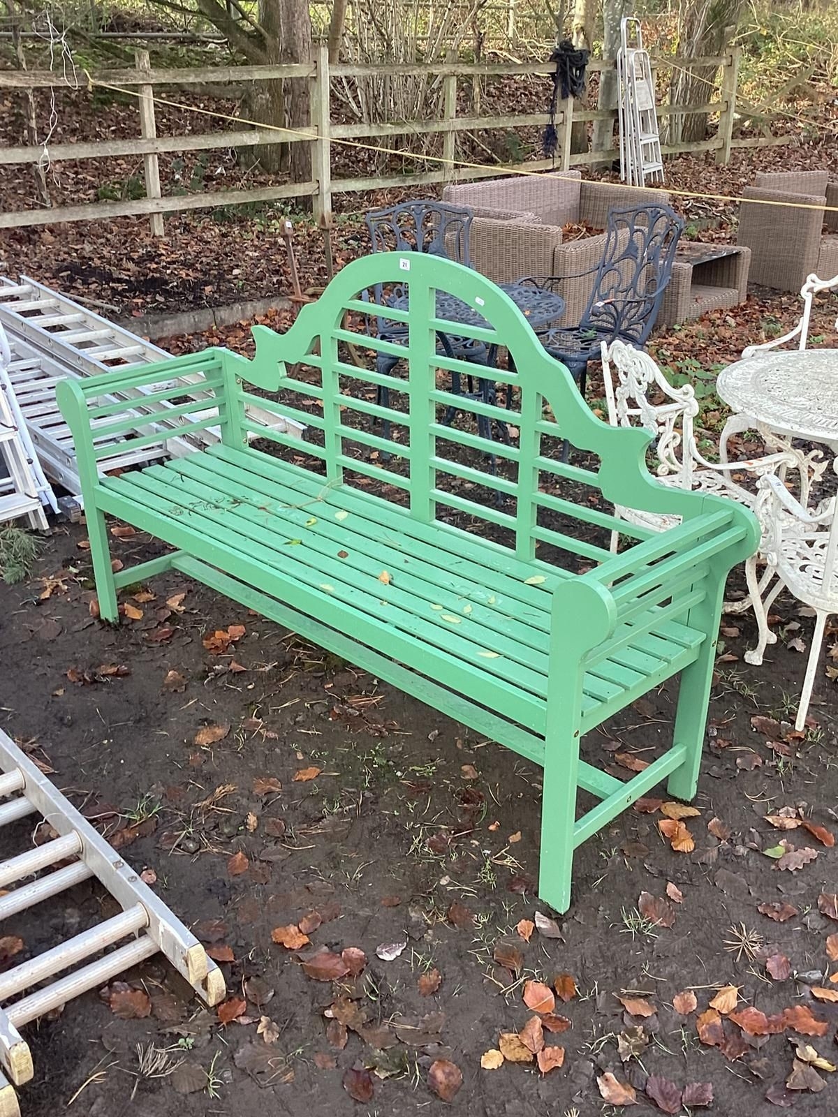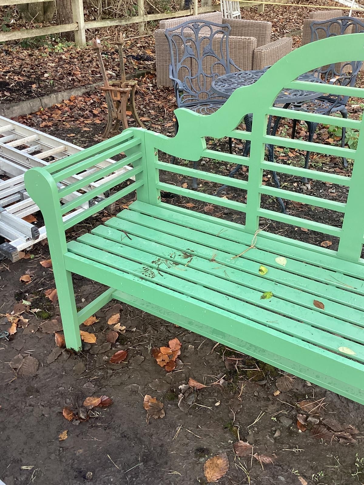 A MODERN GREEN PAINTED LUTYENS BENCH, length 180cm x depth 50cm x height 109cm, condition report: appears nearly new