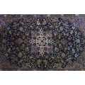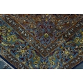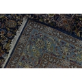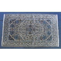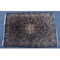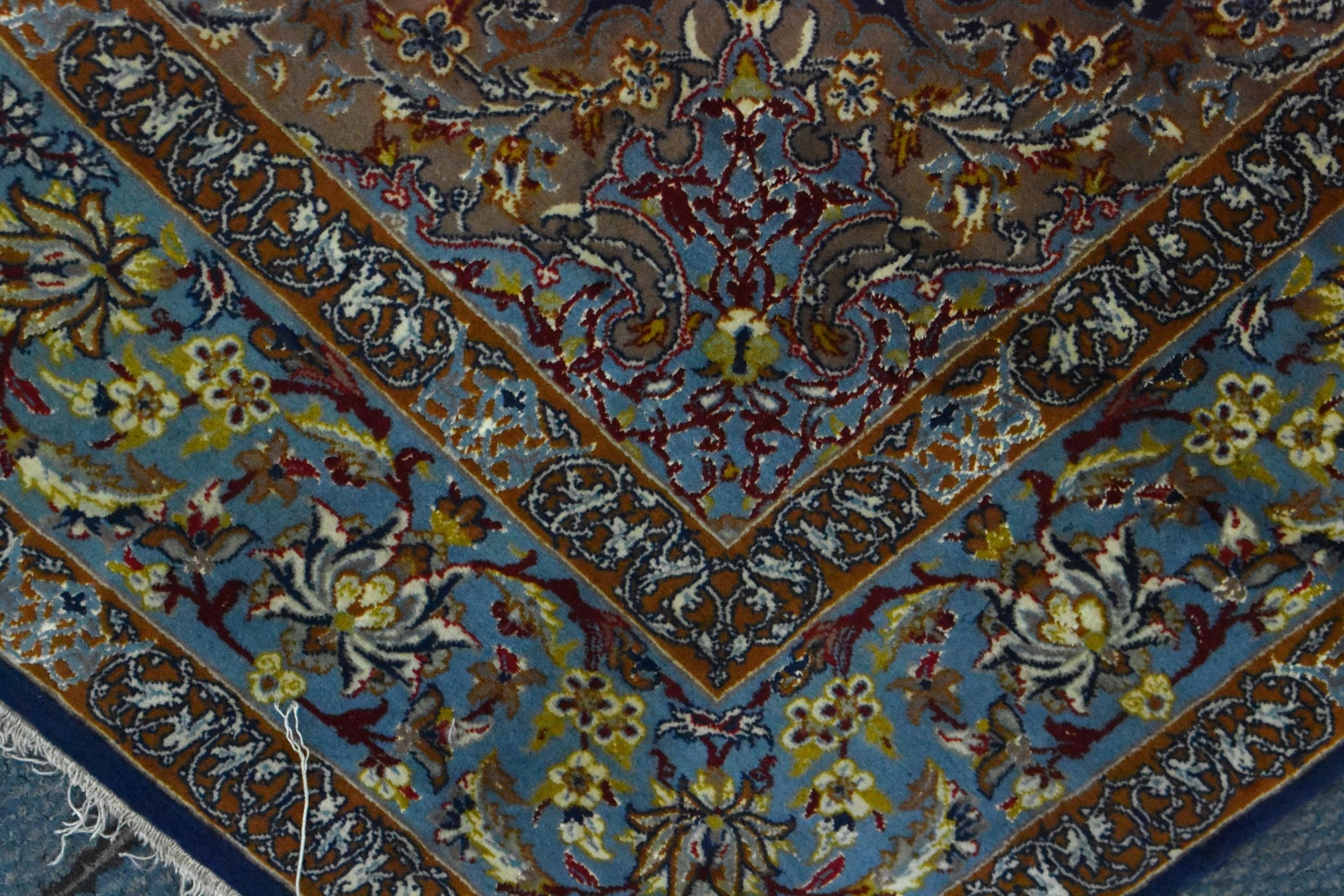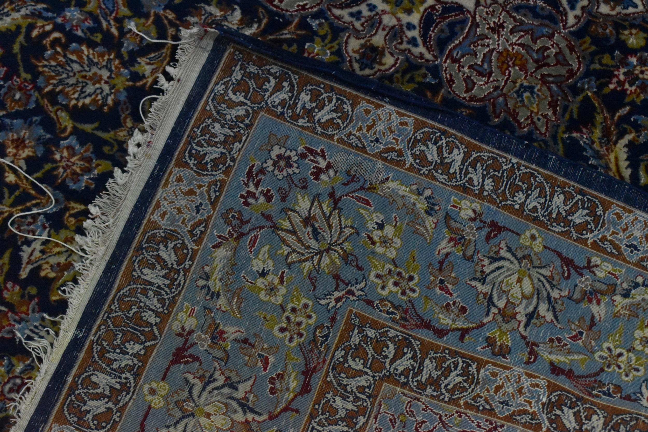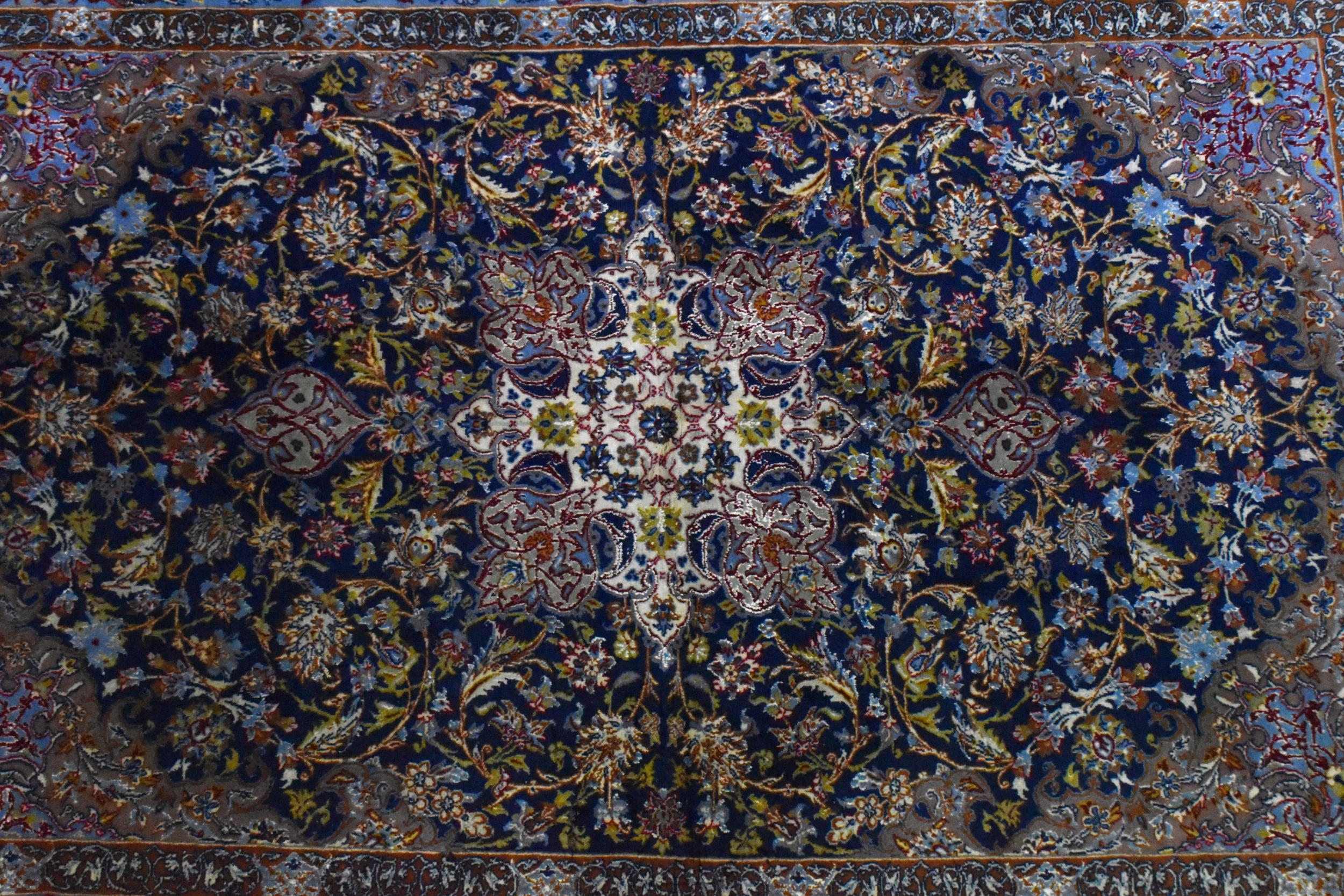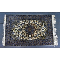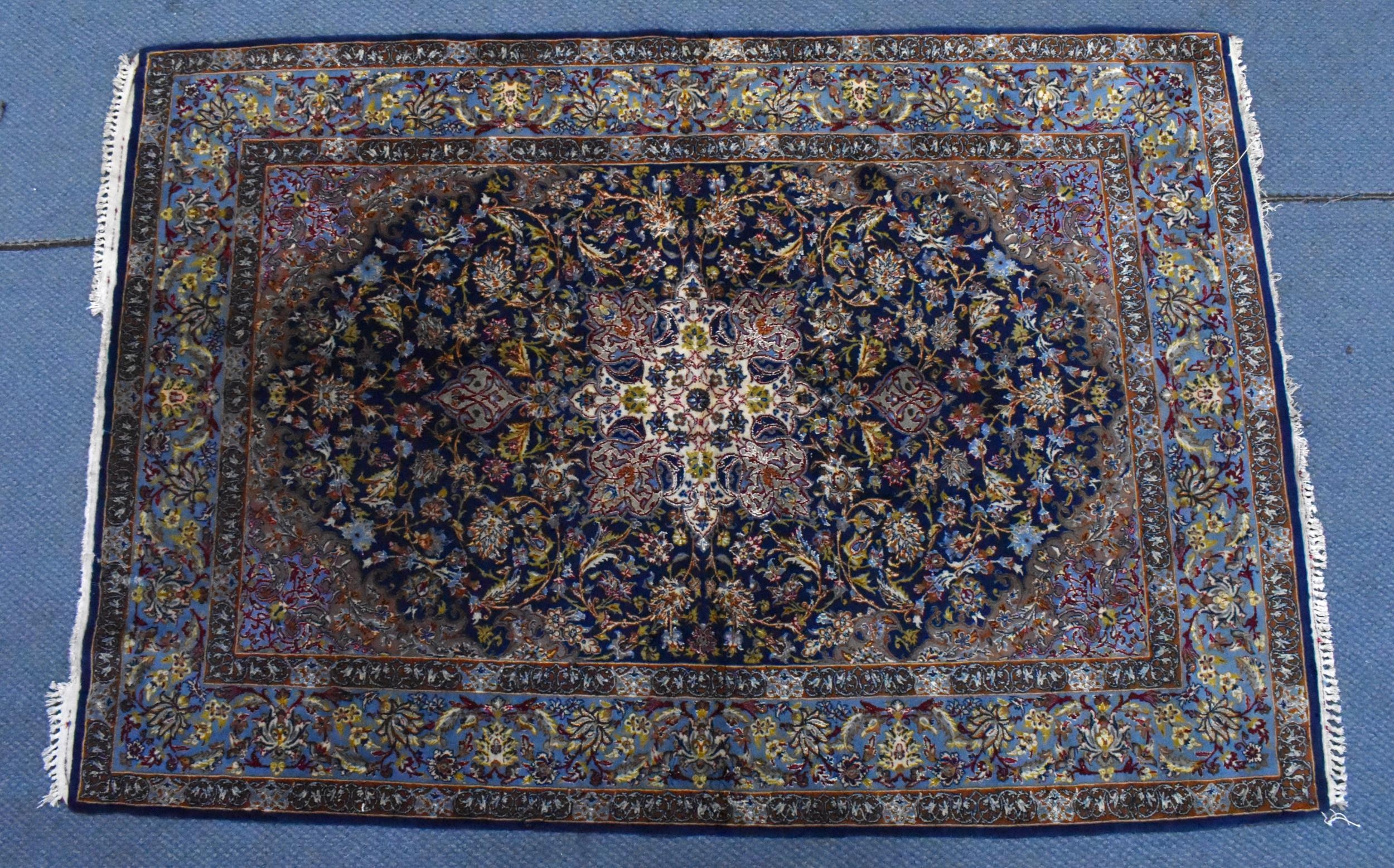 A Persian hand-woven Isfahan silk rug, the blue ground with central floral medallion, surrounded with foliage and shah abbas floral pattern, multiple guards, and fringed ends, 159 cm x 110 cm