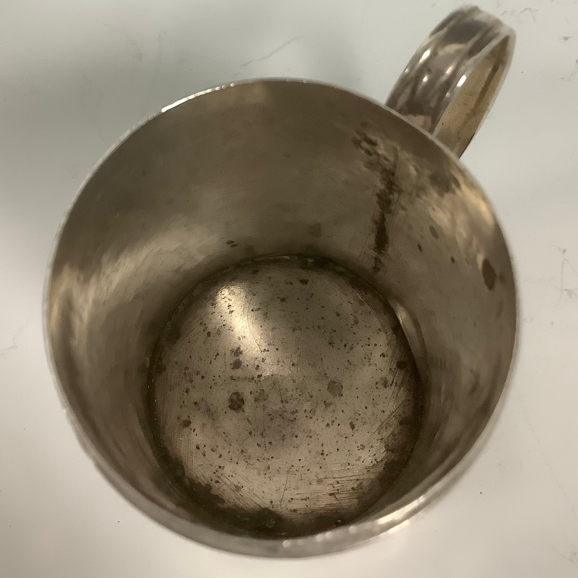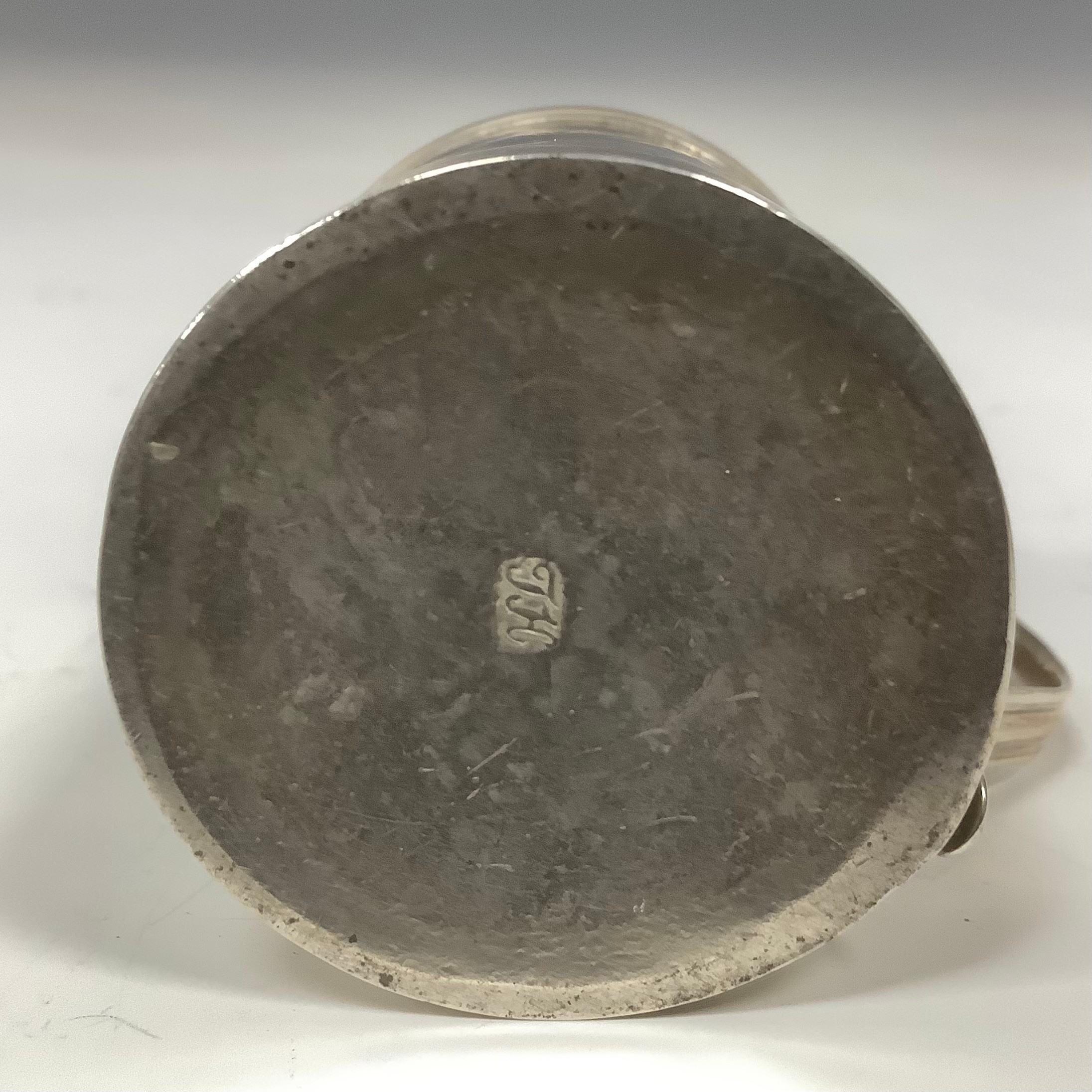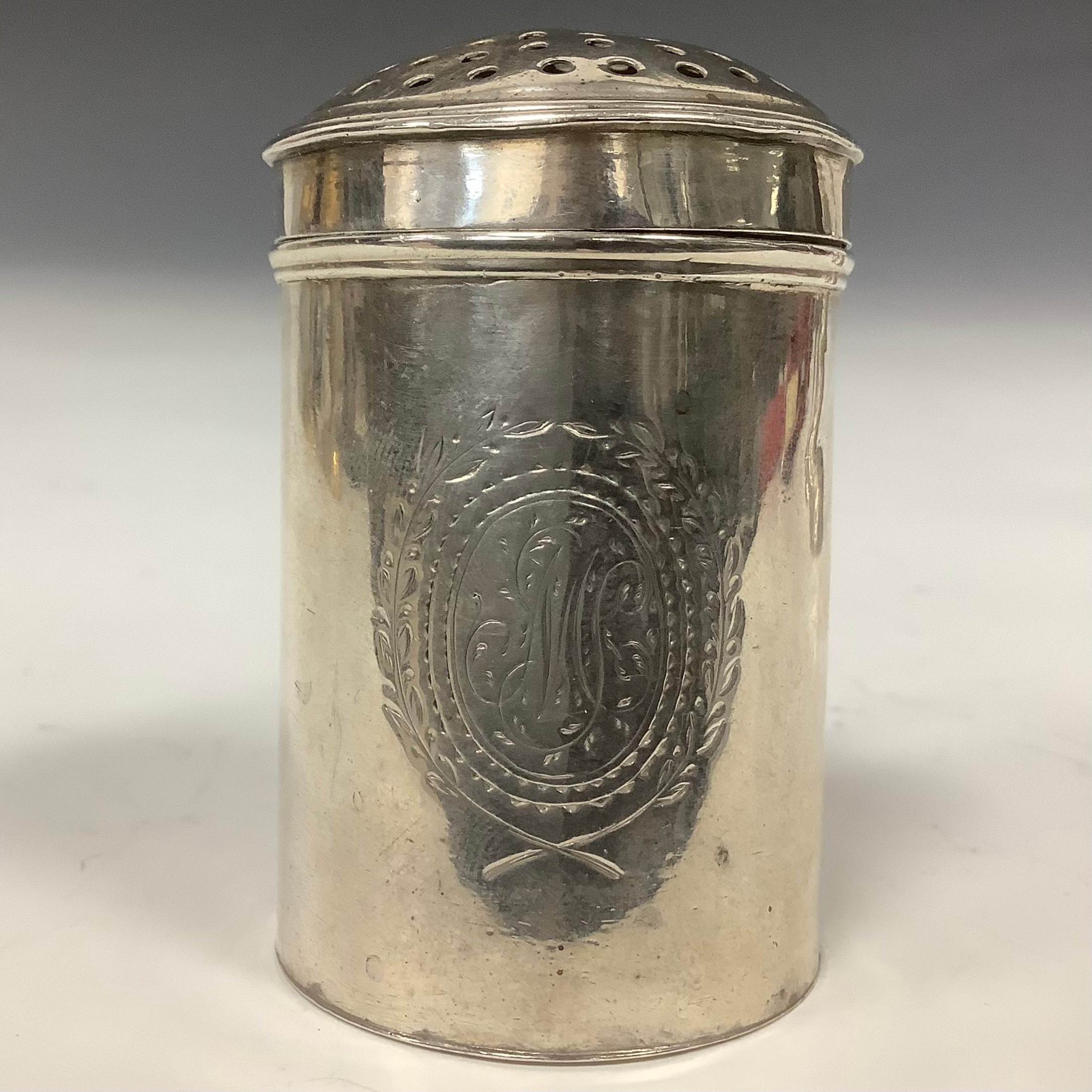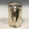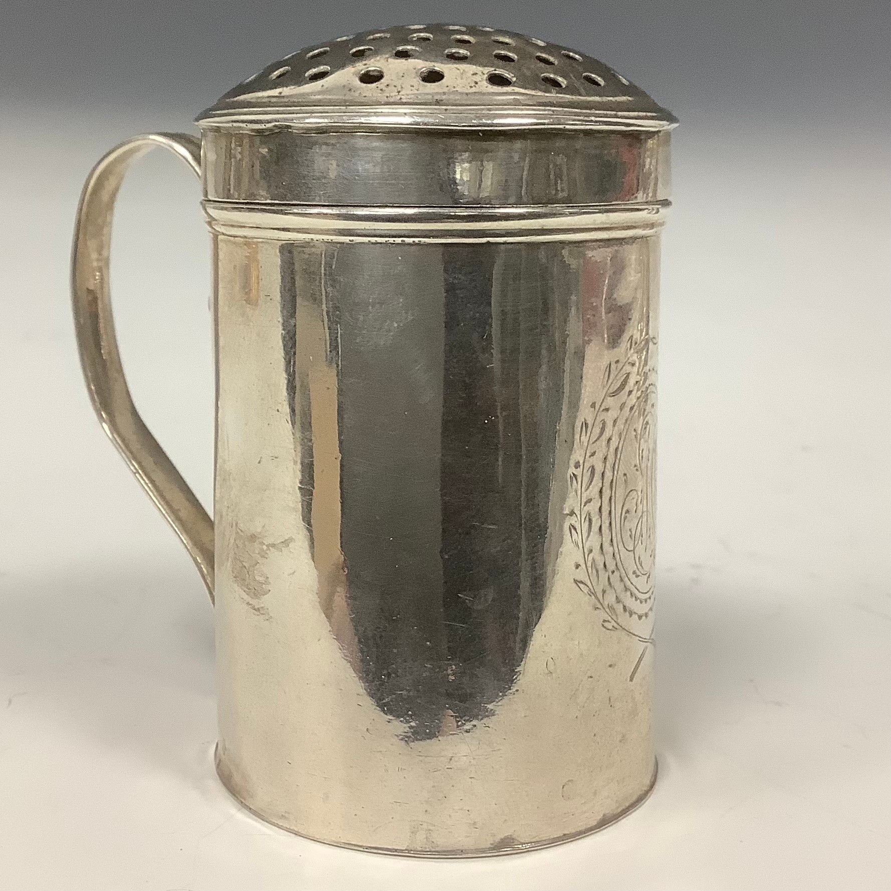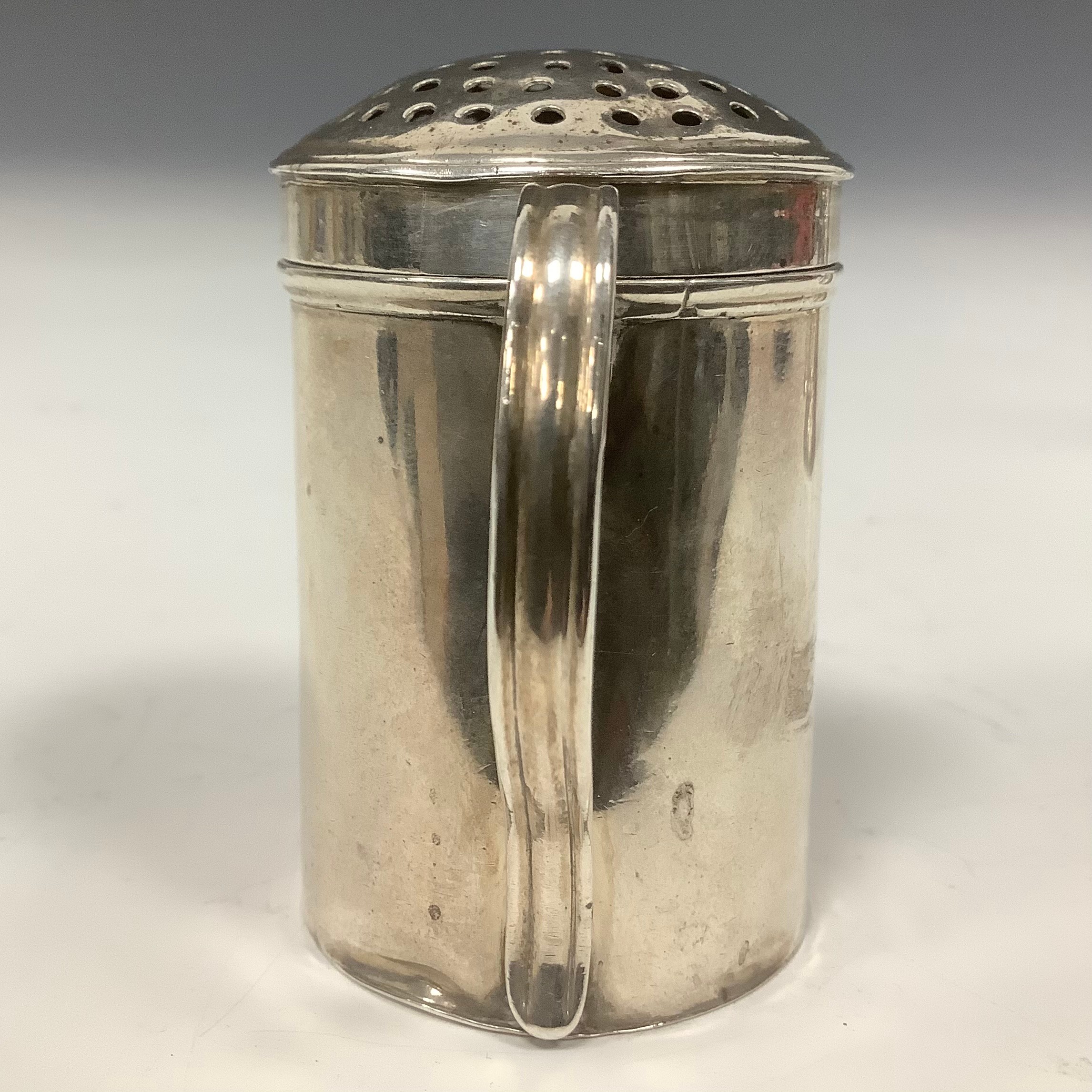 A George II silver kitchen pepper, domed cover, scroll handle, 6.5cm high, maker's mark only, John Harvey I, London c.1745, 45g