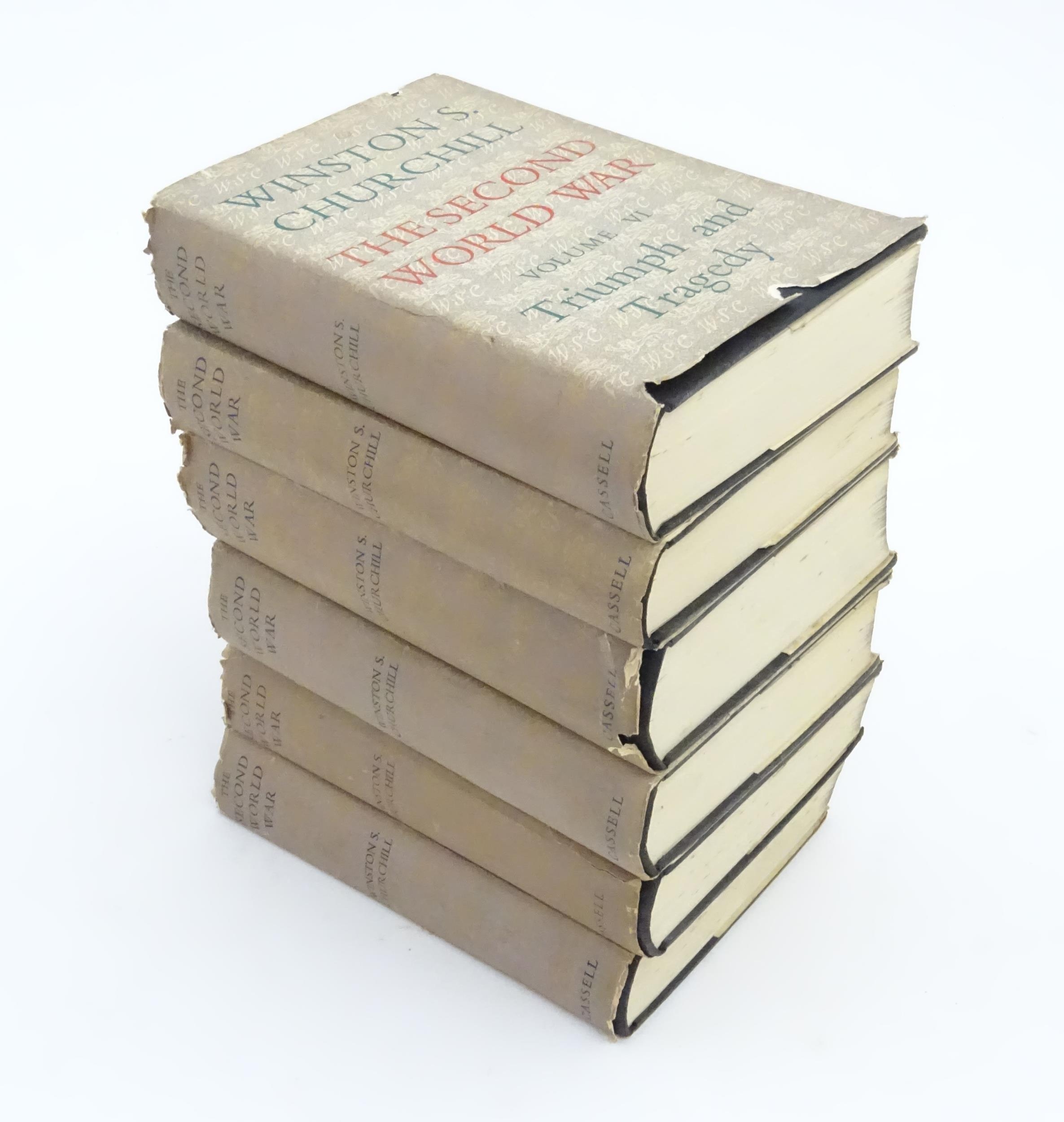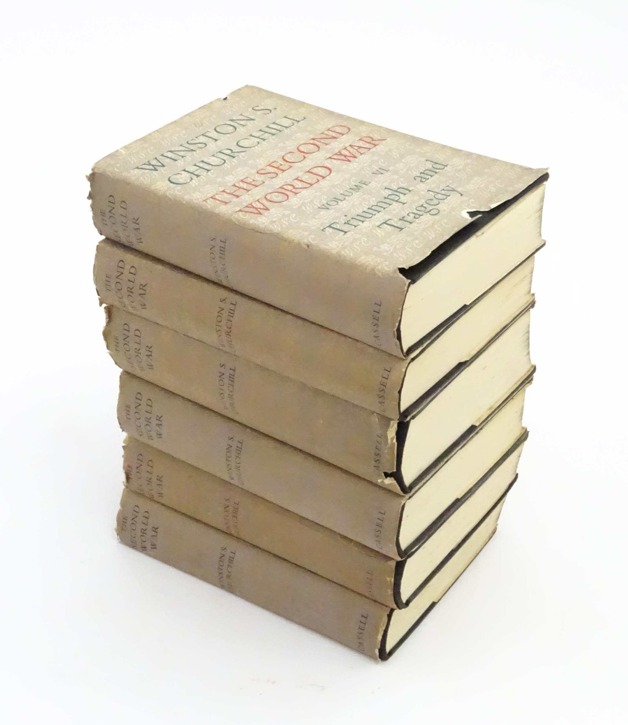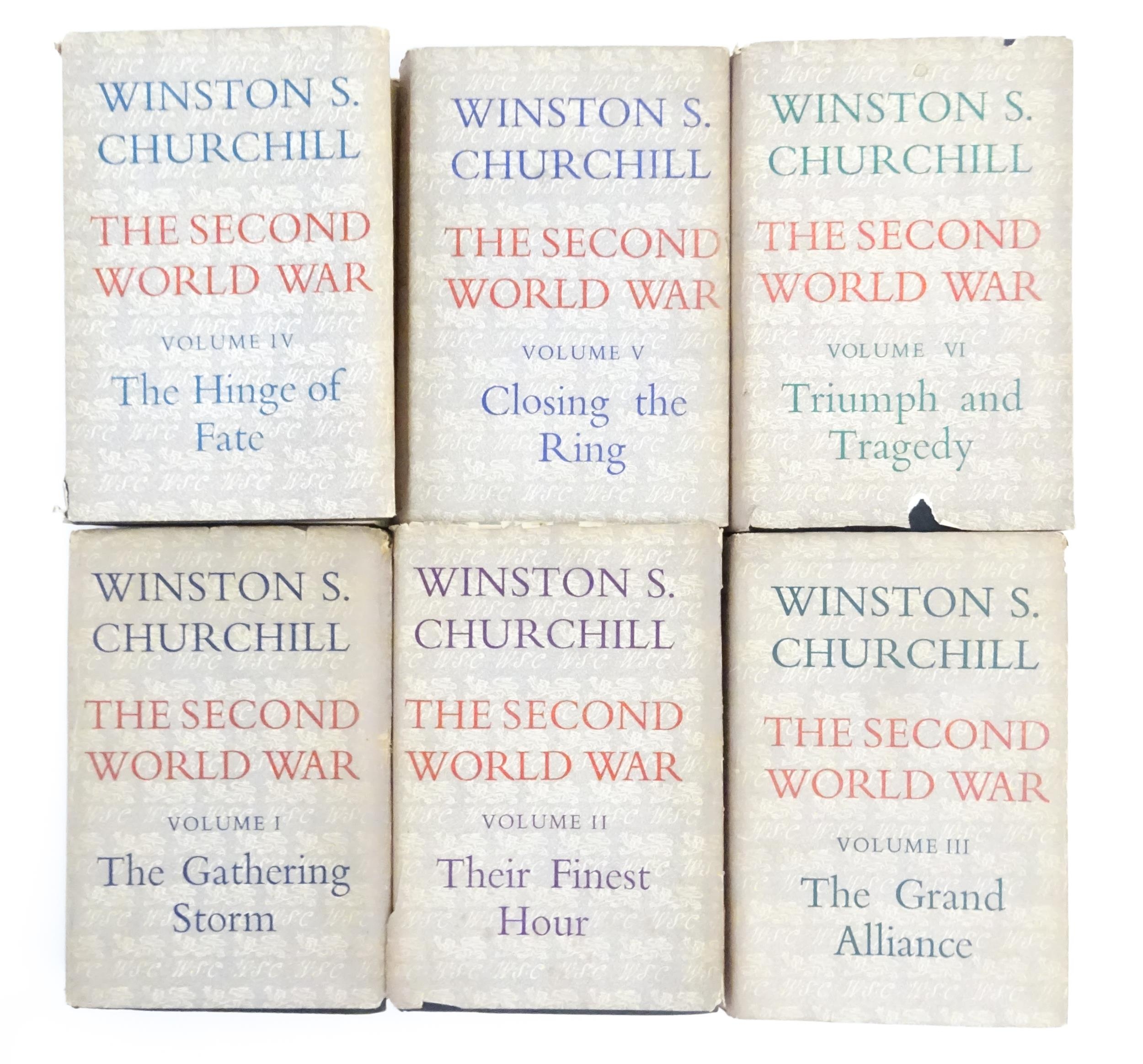 Books: The Second World War by Winston S. Churchill, Volumes 1 - 6, comprising The Gathering of the Storm (vol 1), 1948; Their Finest Hour (vol 2), 1949; The Grand Alliance (vol 3), 1950; The Hinge of War (vol 4), 1951; Closing the Ring (vol 5), 1952; Triumph & Tragedy (vol 6), 1954. Published by Cassell & Co. Ltd. (6)