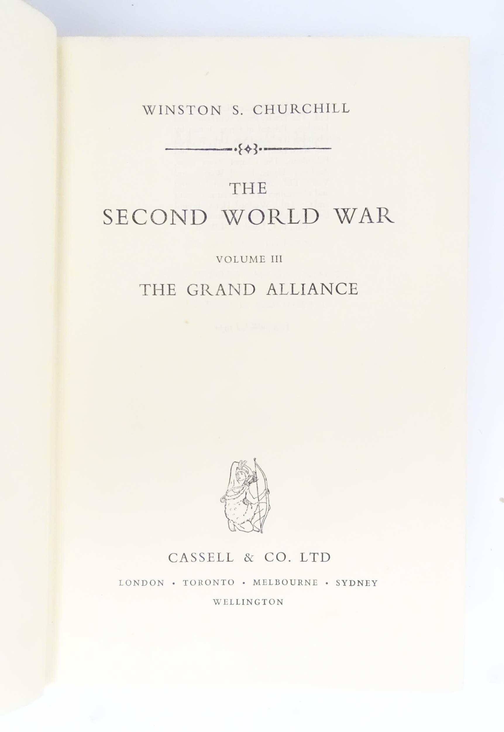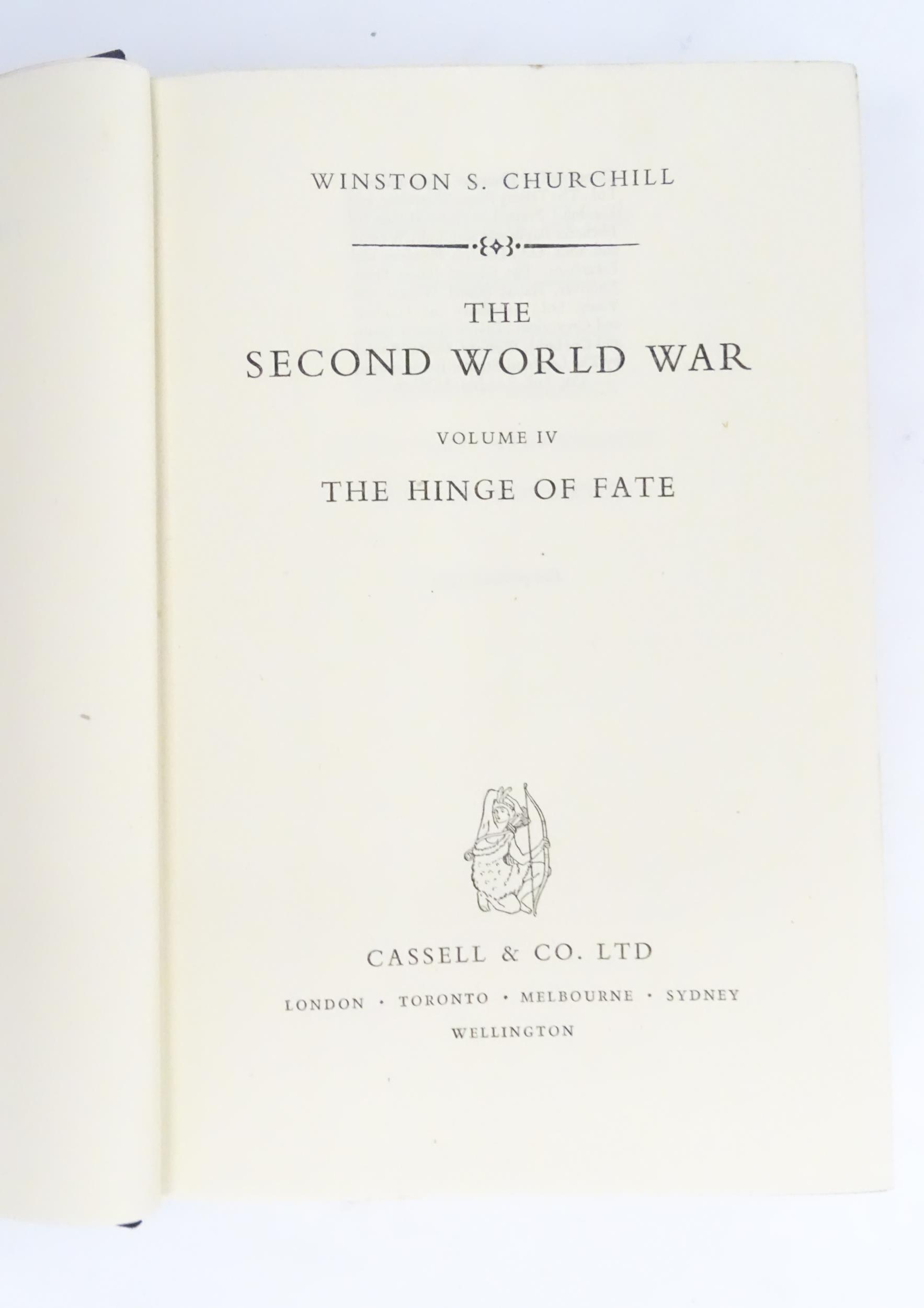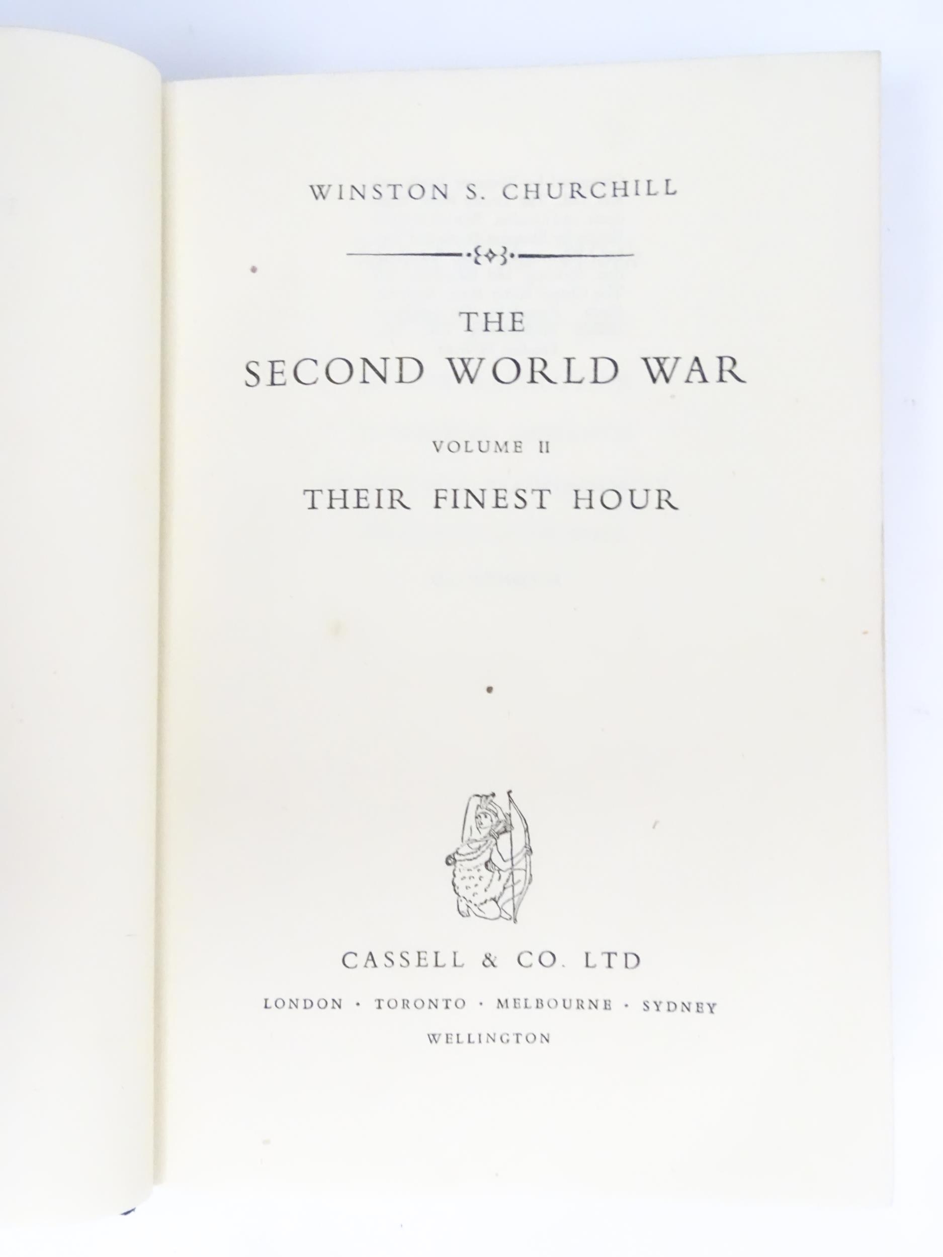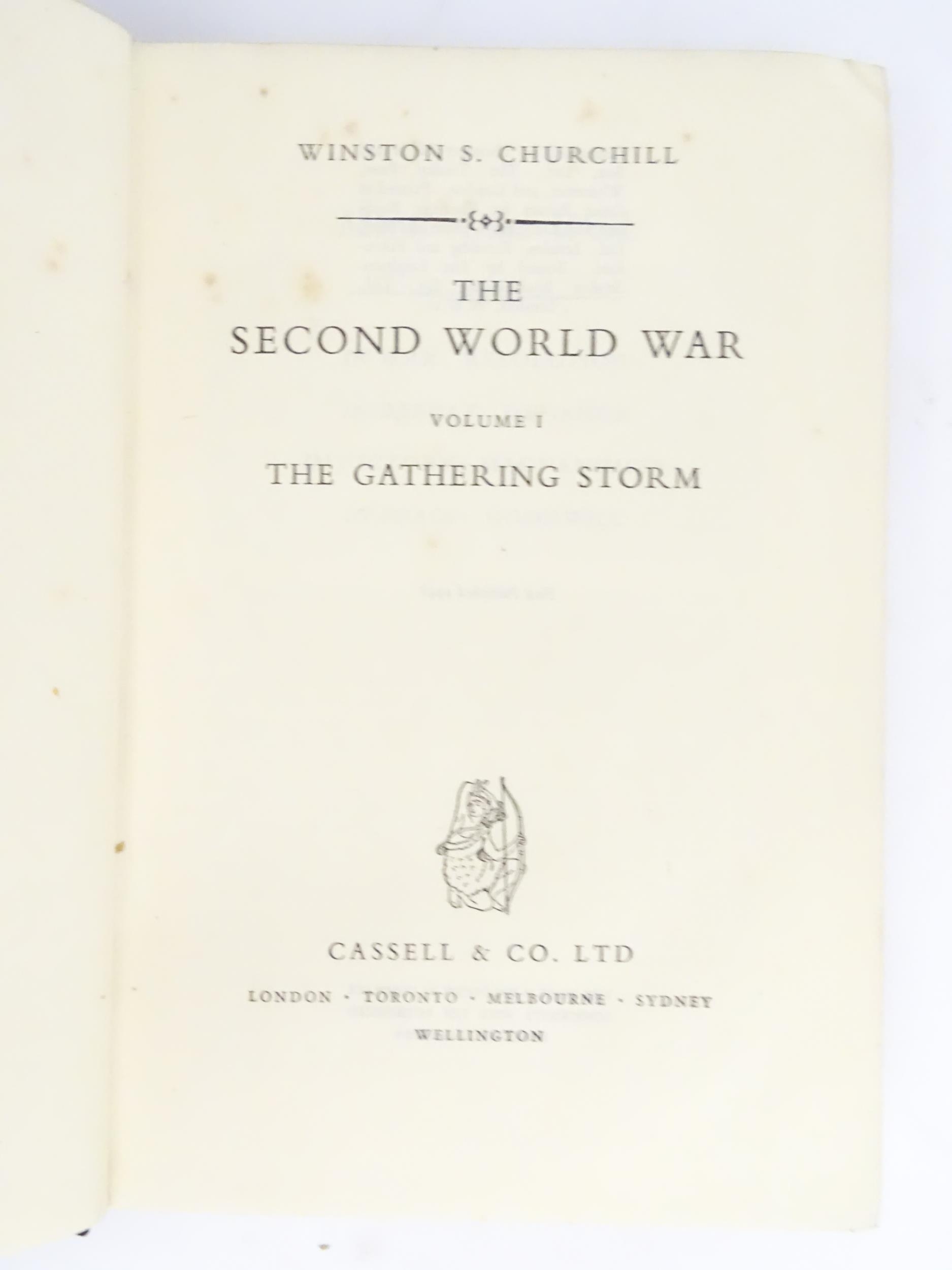 Books: The Second World War by Winston S. Churchill, Volumes 1 - 6, comprising The Gathering of the Storm (vol 1), 1948; Their Finest Hour (vol 2), 1949; The Grand Alliance (vol 3), 1950; The Hinge of War (vol 4), 1951; Closing the Ring (vol 5), 1952; Triumph & Tragedy (vol 6), 1954. Published by Cassell & Co. Ltd. (6)