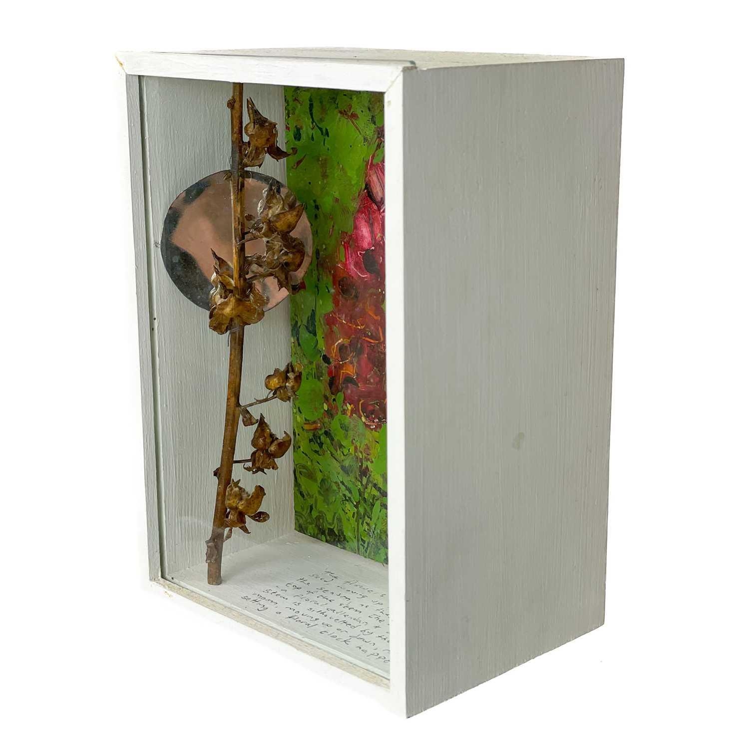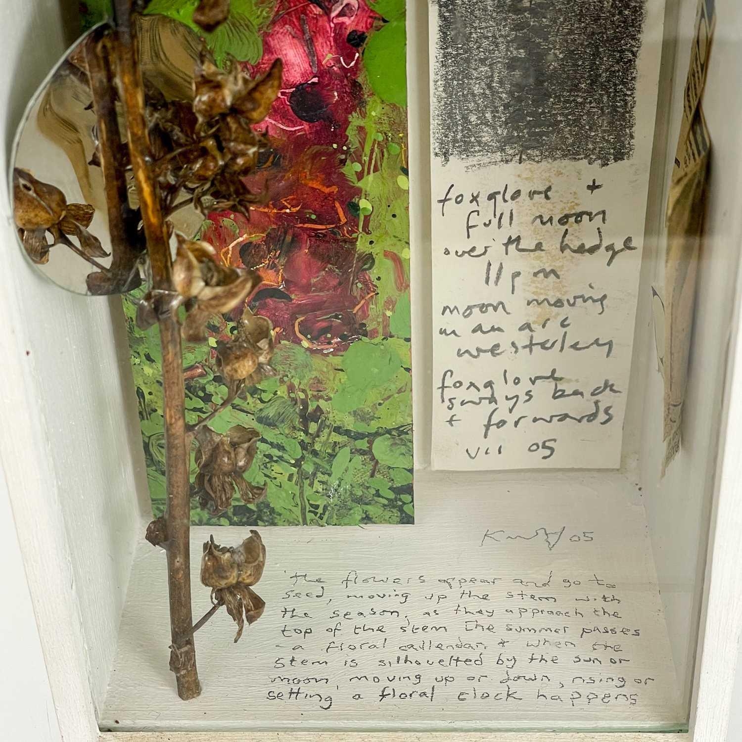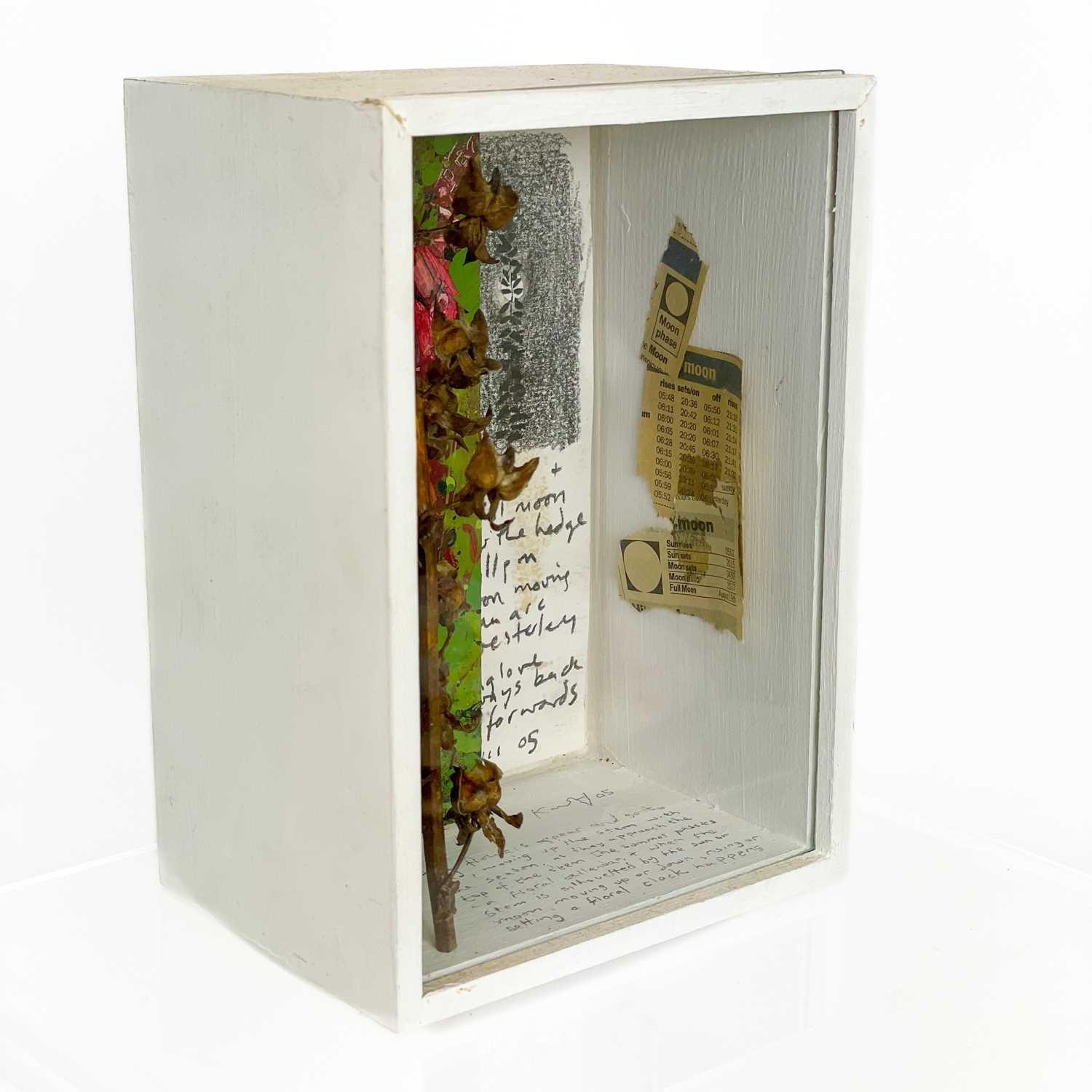 Kurt JACKSON (1961) Foxglove & full moon over the Hedge, 2005 Mixed media diorama box, signed, inscribed and dated '05, 16.5 x 12cm, depth 8.5cm, further signed and dated to base This charming diorama is in good stable condition with glazed front. In the text there is some browning which may be as a result of the glue used.