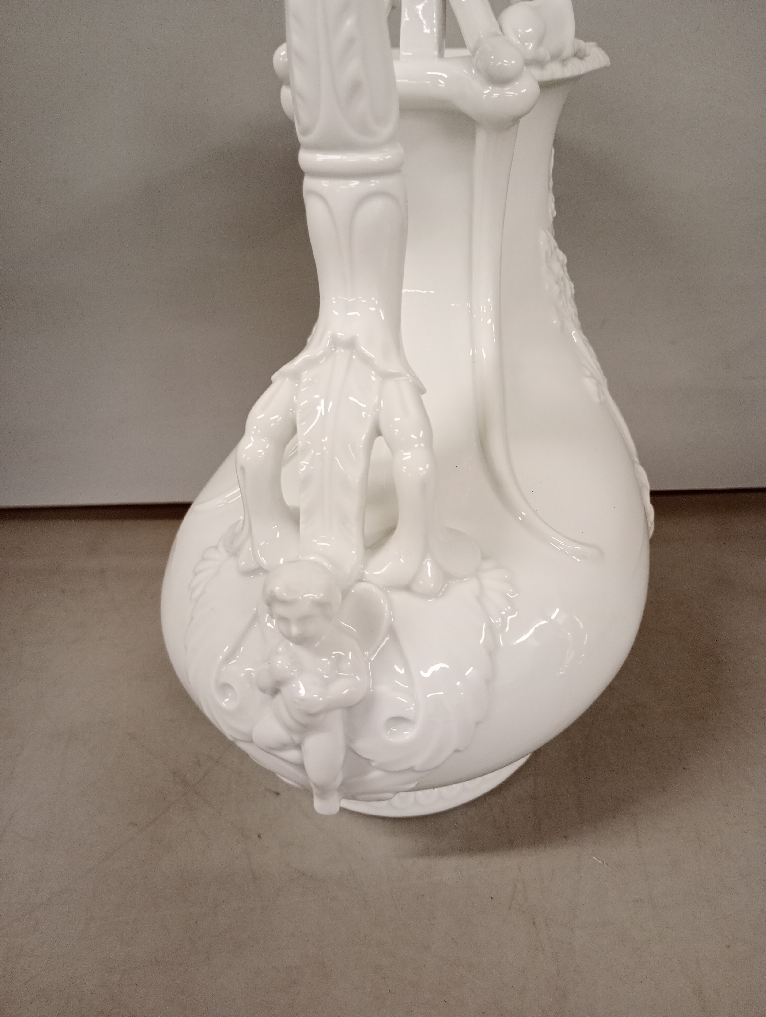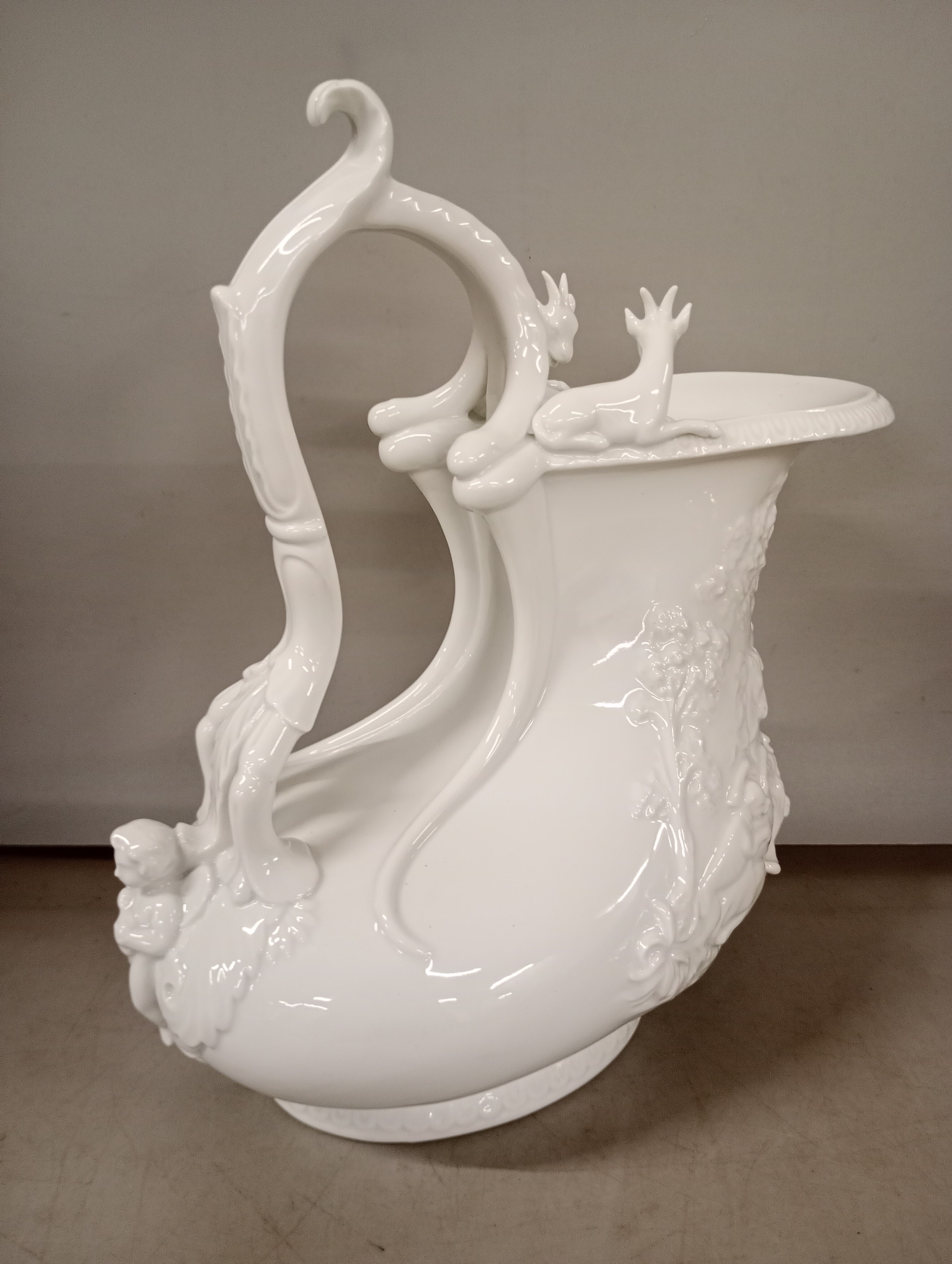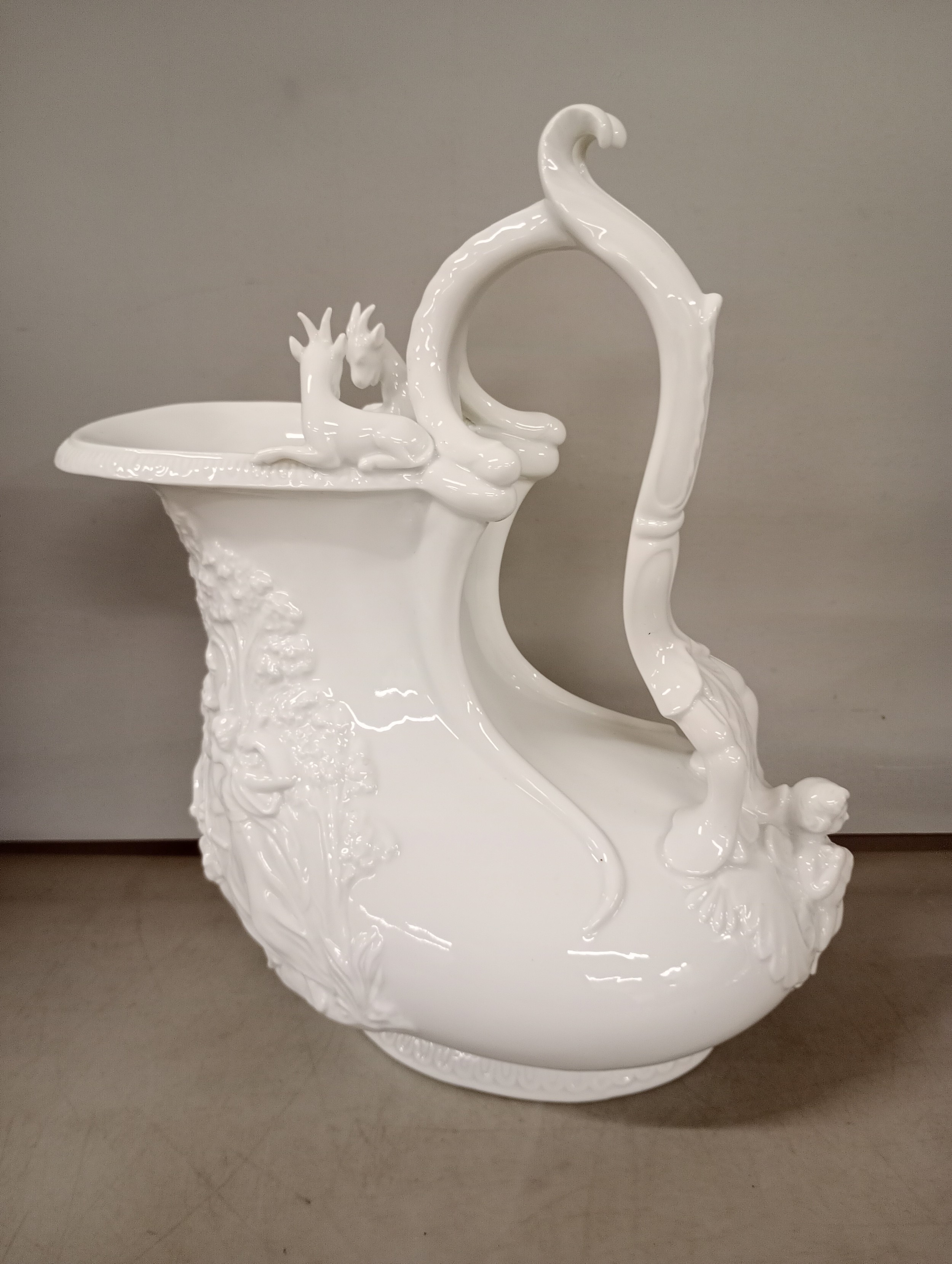 A Capodimonte Richard Ginori parian ware porcelain jug with high relief decoration of goats and cherubs, with hunting scene to body, 23.5cm