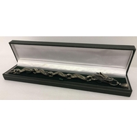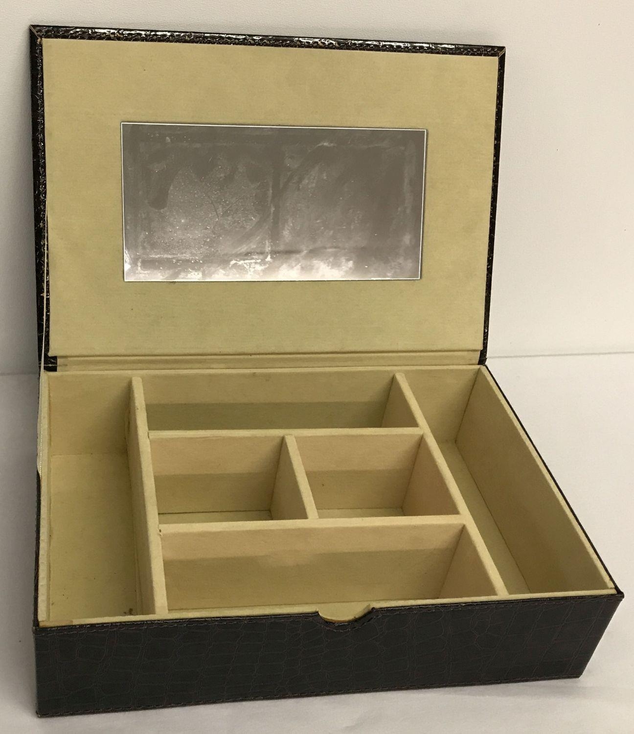 A modern mock crocodile effect jewellery box with cream velveteen interior. Mirror to inside of lid with 6 compartments to main body.