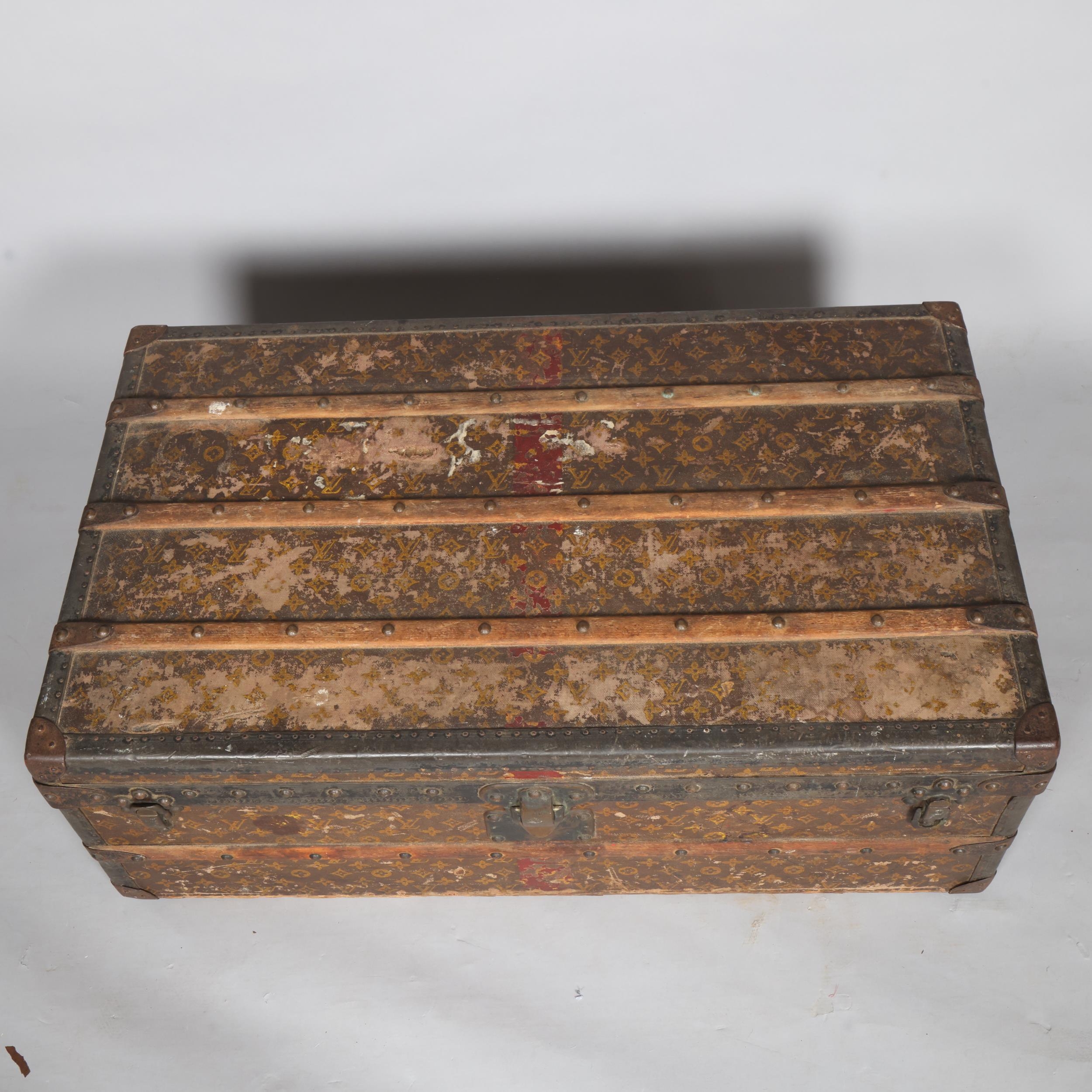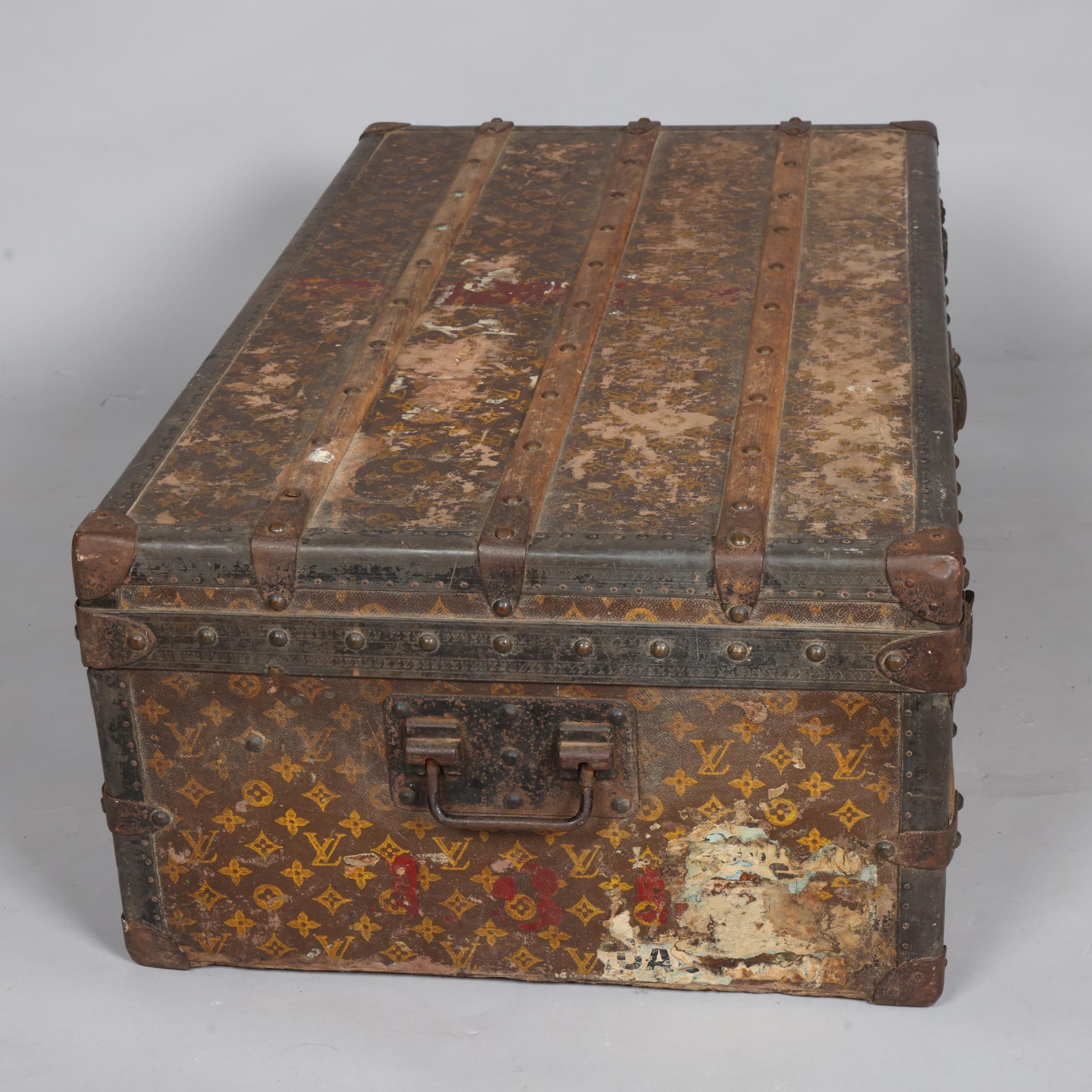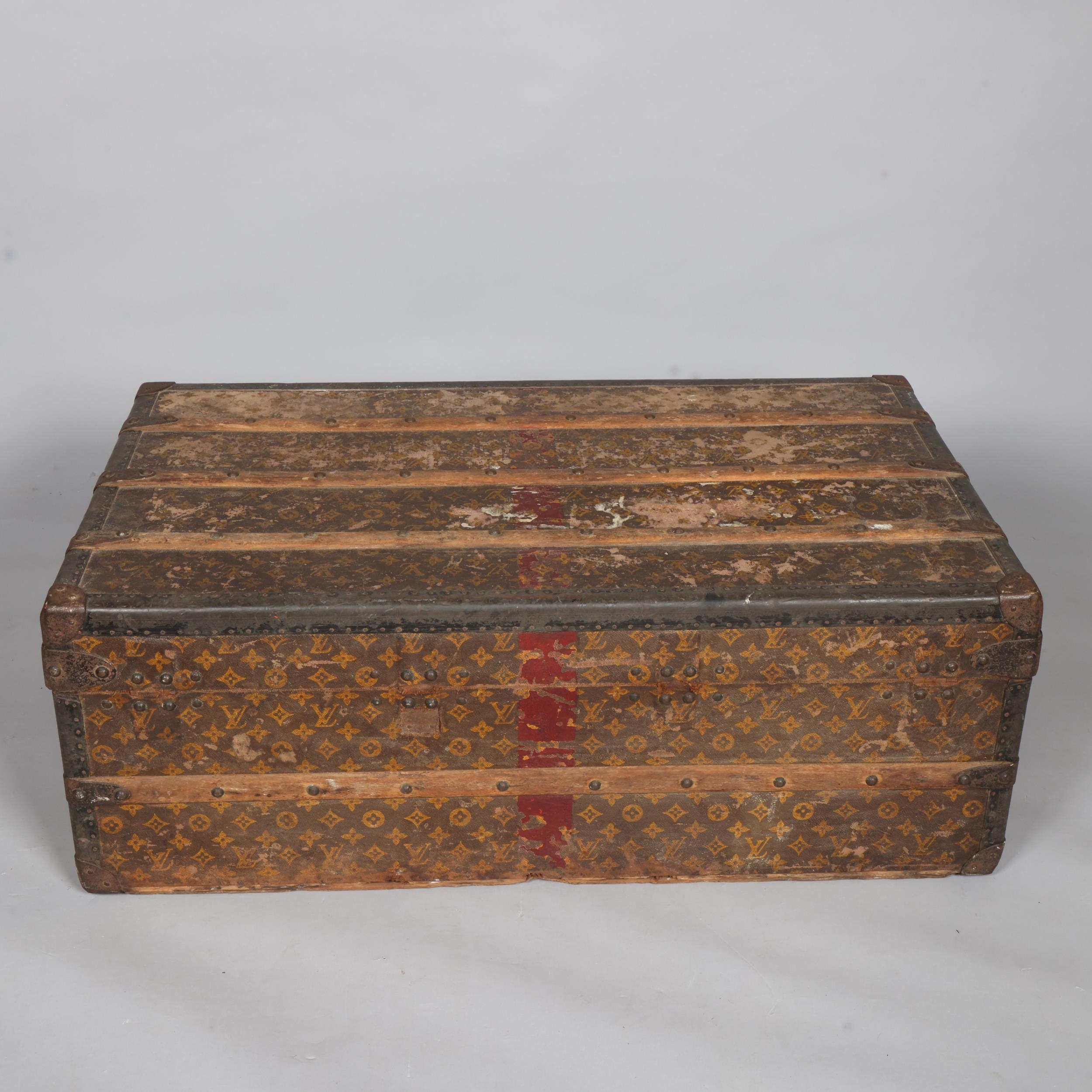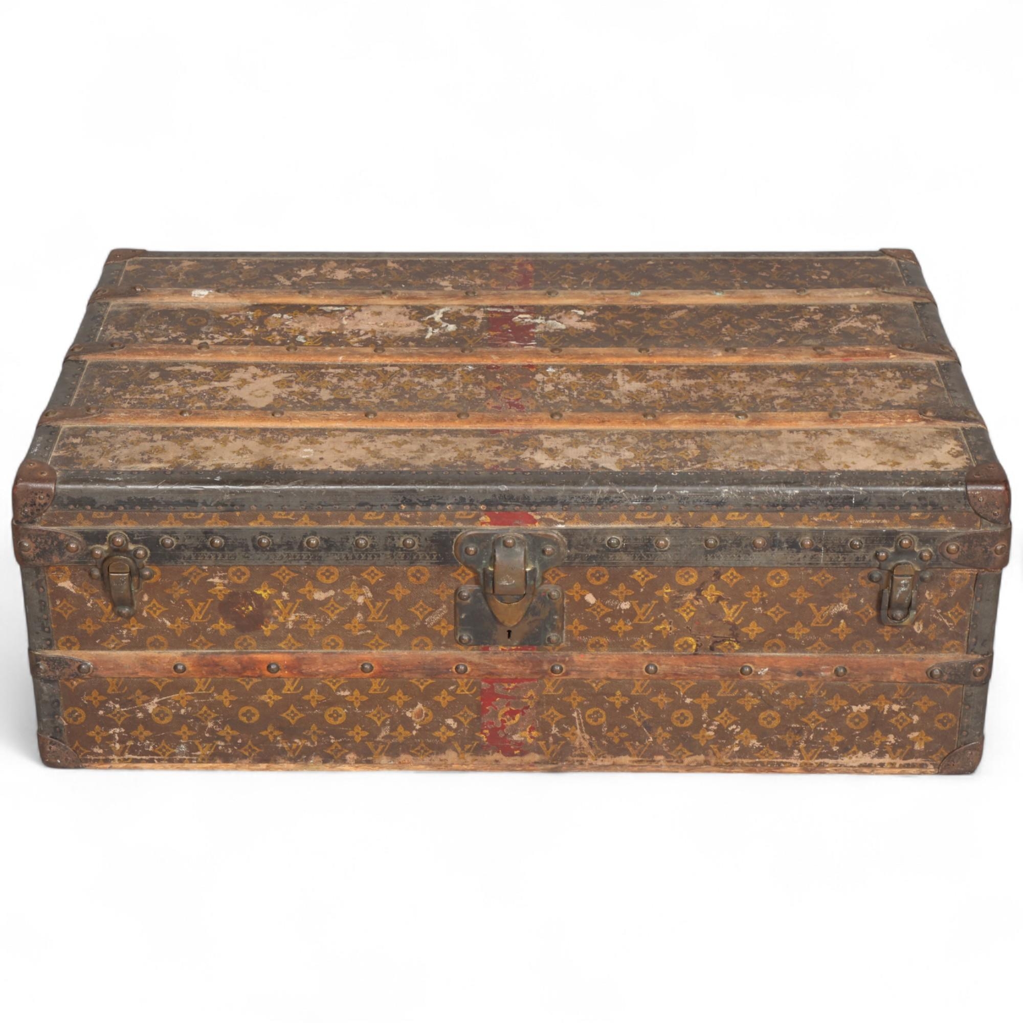 LOUIS VUITTON - a Vintage monogram steamer trunk, brass furniture, lined interior and original label inside, numbered 811036, makers stamp to base, 90cm x 54cm, height 33cm