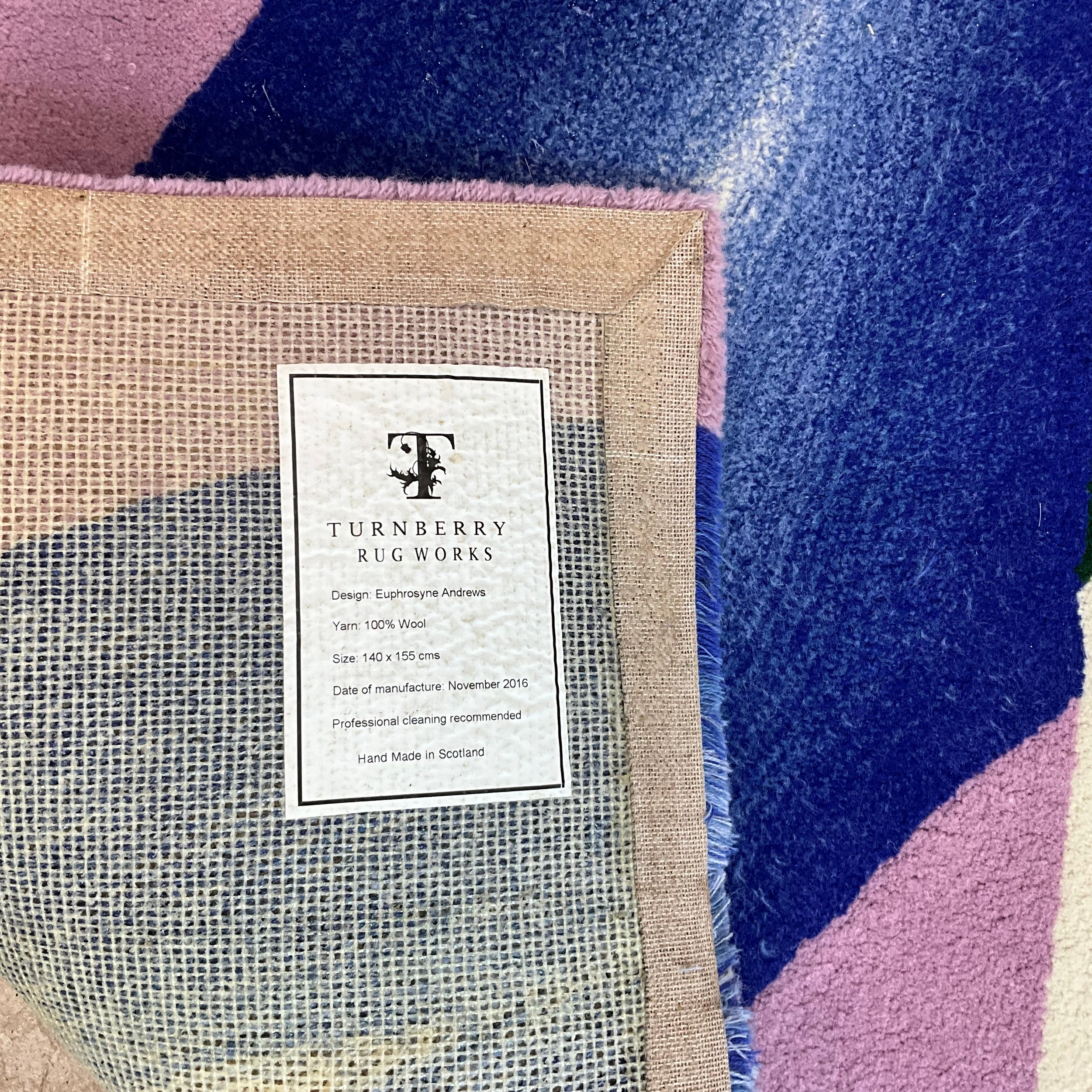 Euphrosyne Andrews, MRSS (Textile Design No.2), Glasgow School of Art, contemporary abstract design rug, 2016. Scottish, 100% wool. W140cm x L155cm. Provenance - Turnberry Rug Works Scotland (original label verso). Euphrosyne Andrews was recently awarded the Henry Moore Foundation Grant.