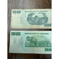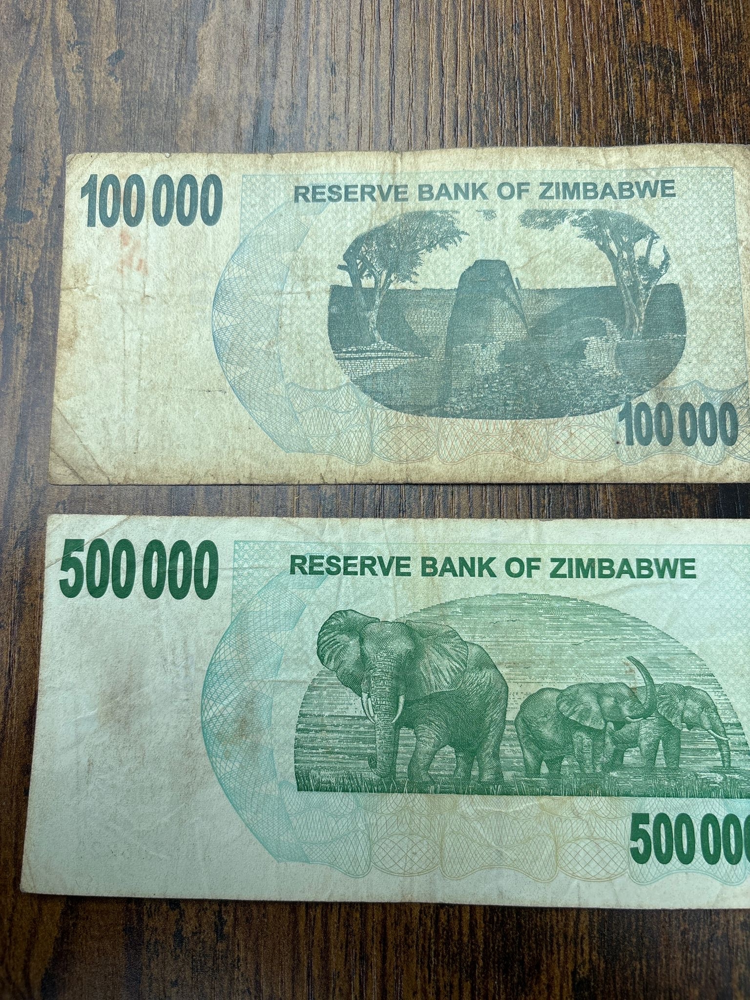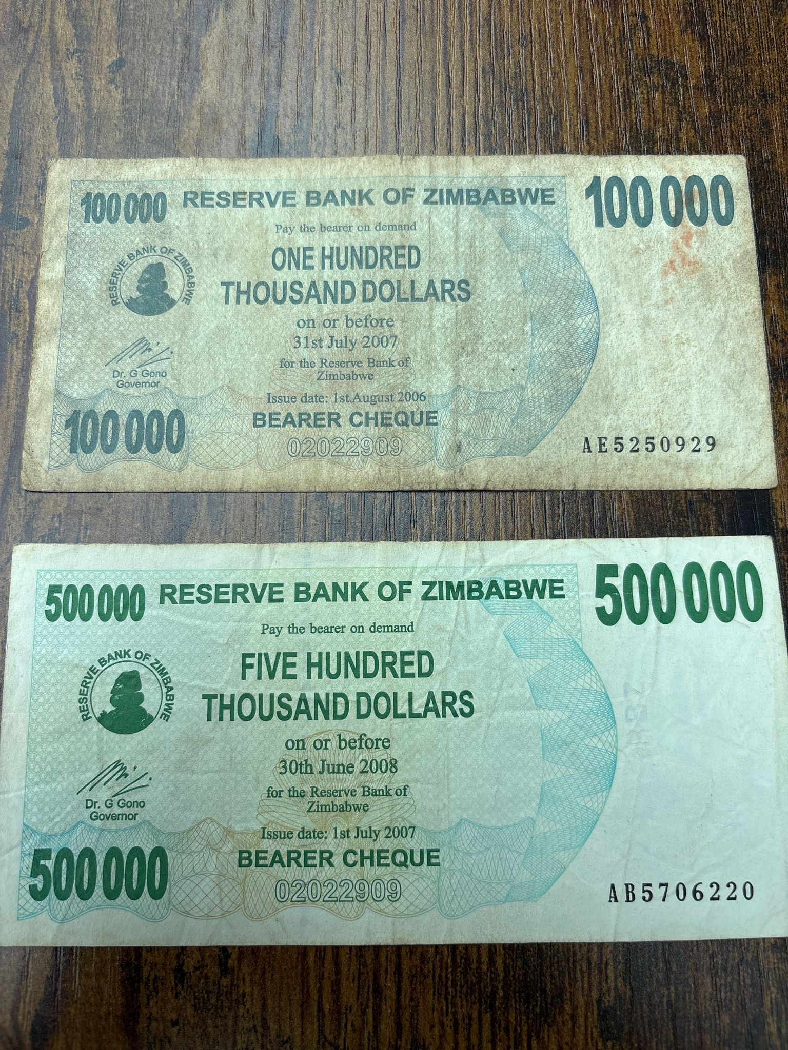 Pair of Zimbabwe hyperinflation banknotes comprising 100,000 and 500,000 Dollar bearer cheques issued during the country’s economic crisis of the 2000s. These notes are part of the famous period of extreme inflation, where denominations rapidly increased into the millions and beyond. Features classic Zimbabwe wildlife and landscape designs, including elephant imagery. Both notes are circulated with visible wear, folds and staining consistent with use. A popular and historically significant addition to any world banknote collection. Sold as a pair.