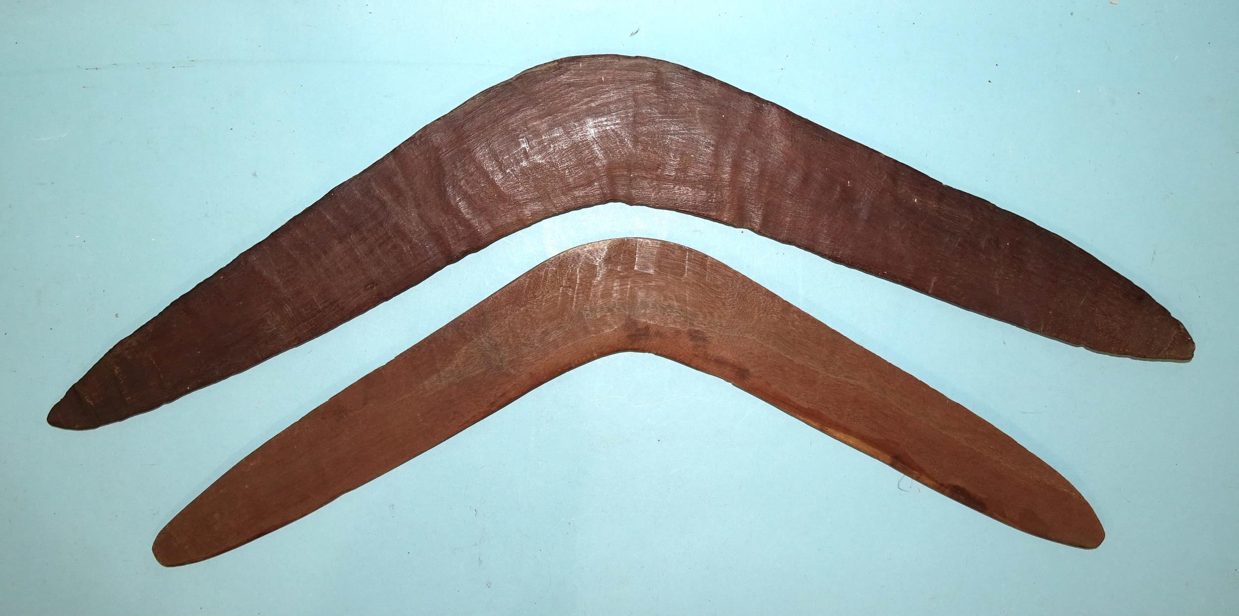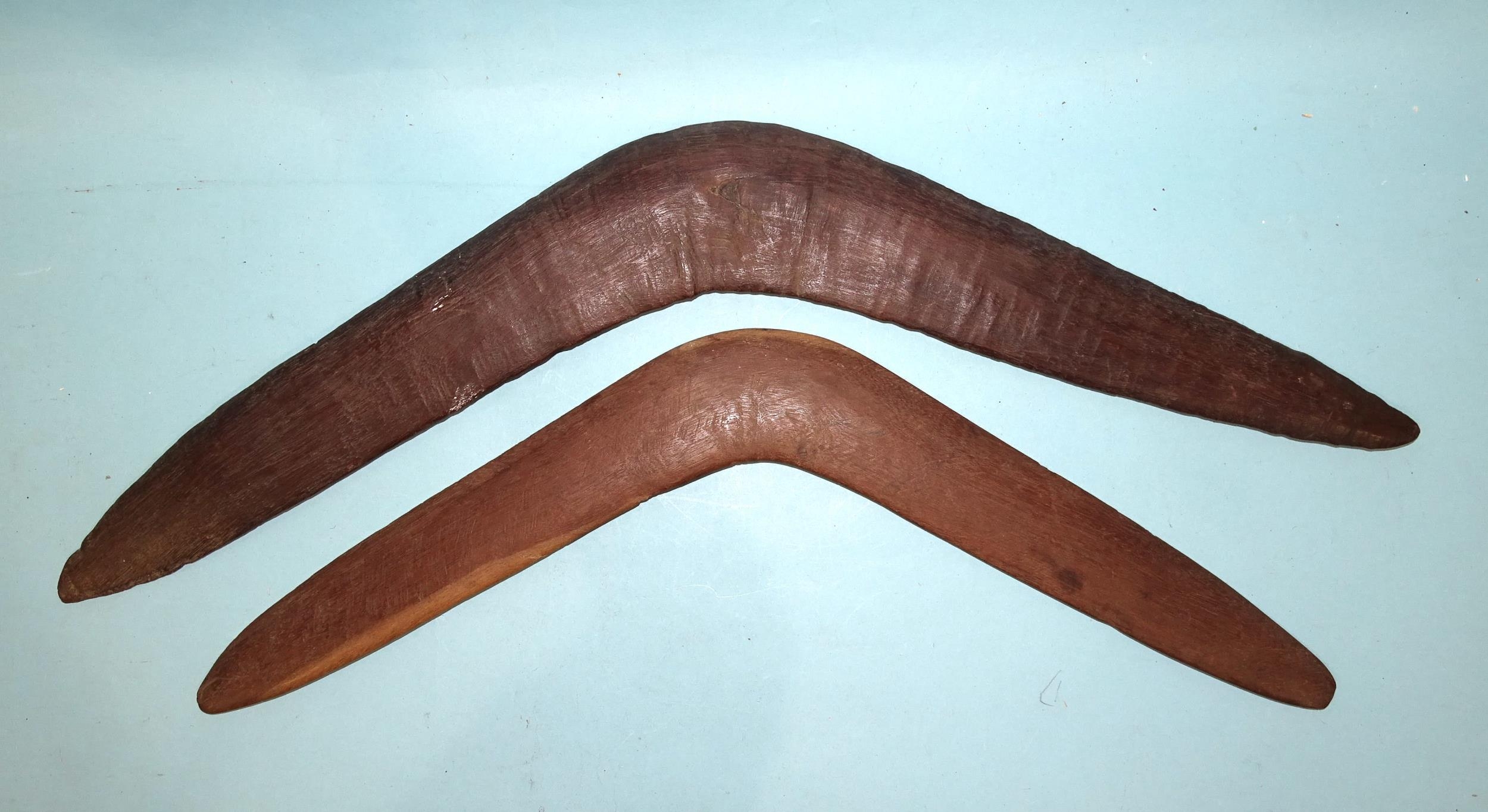 An early-20th century Australian boomerang, 60cm long and another, 51cm long, (2). (Provenance: acquired by the vendor's Great Uncle who emigrated to Australia in the late-19th century and worked as a lighthouse keeper on Christmas Island).